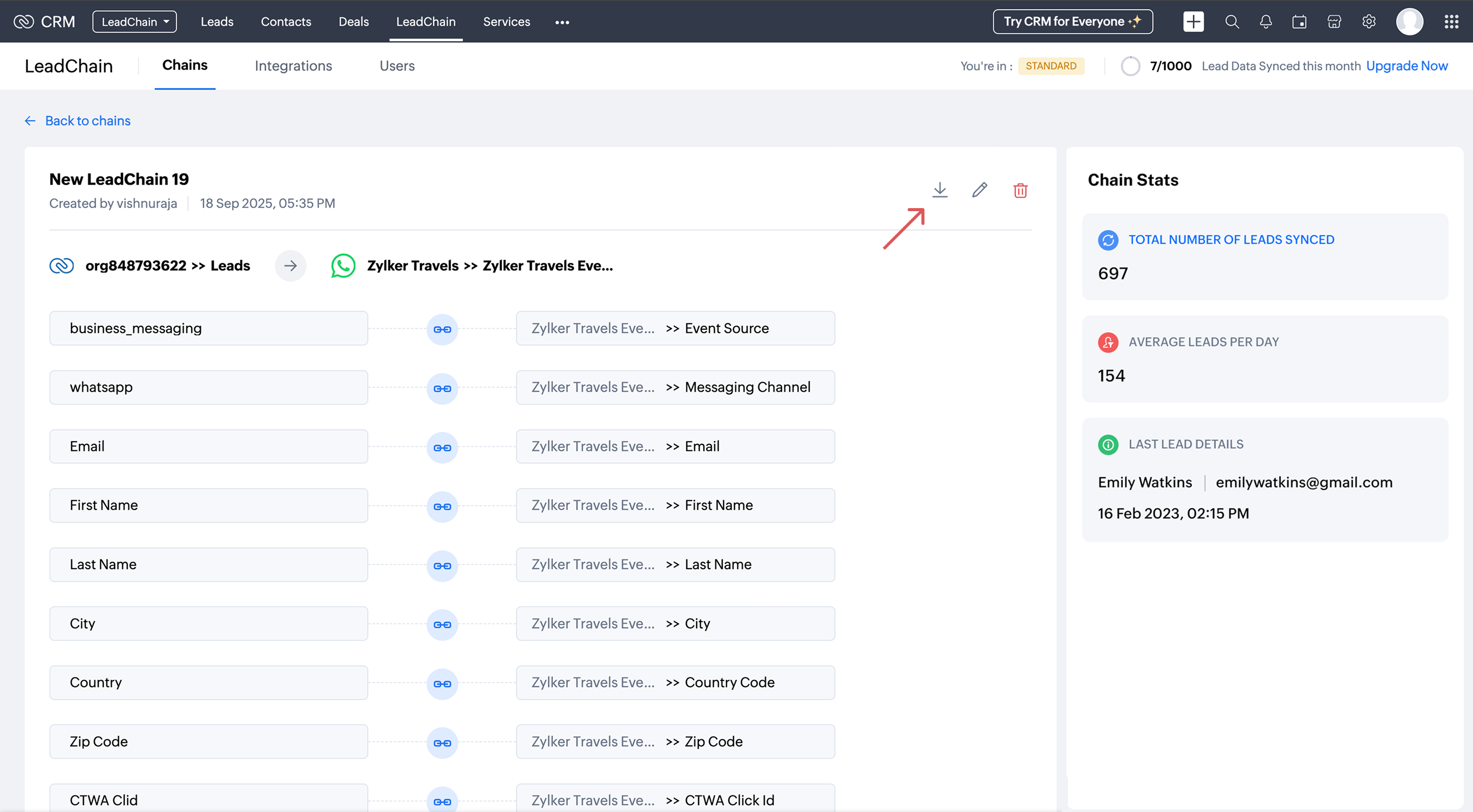 Once the LeadChain is created and the status is Active, you can view stats on the Total Number of Leads Synced, and the Last Lead Details.