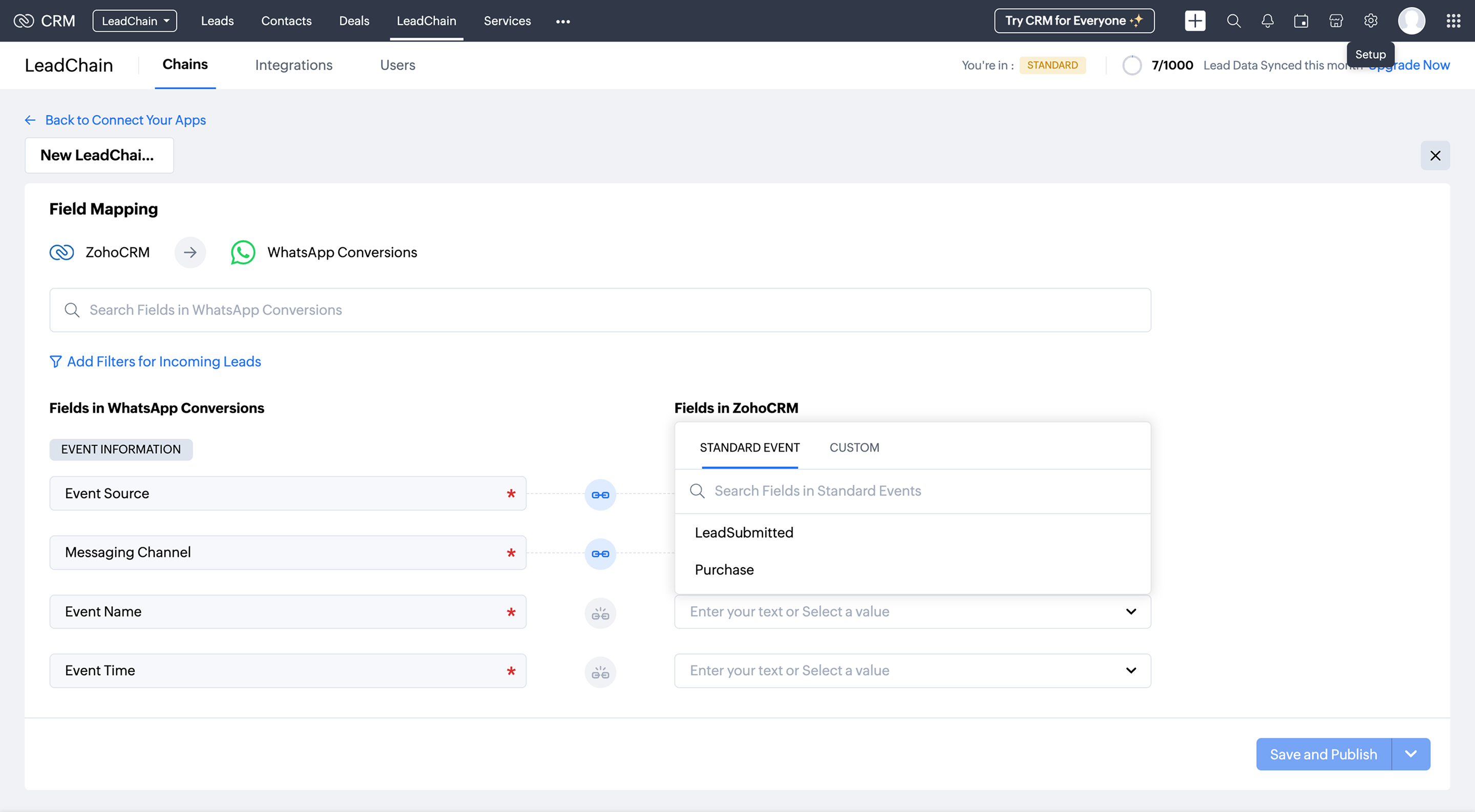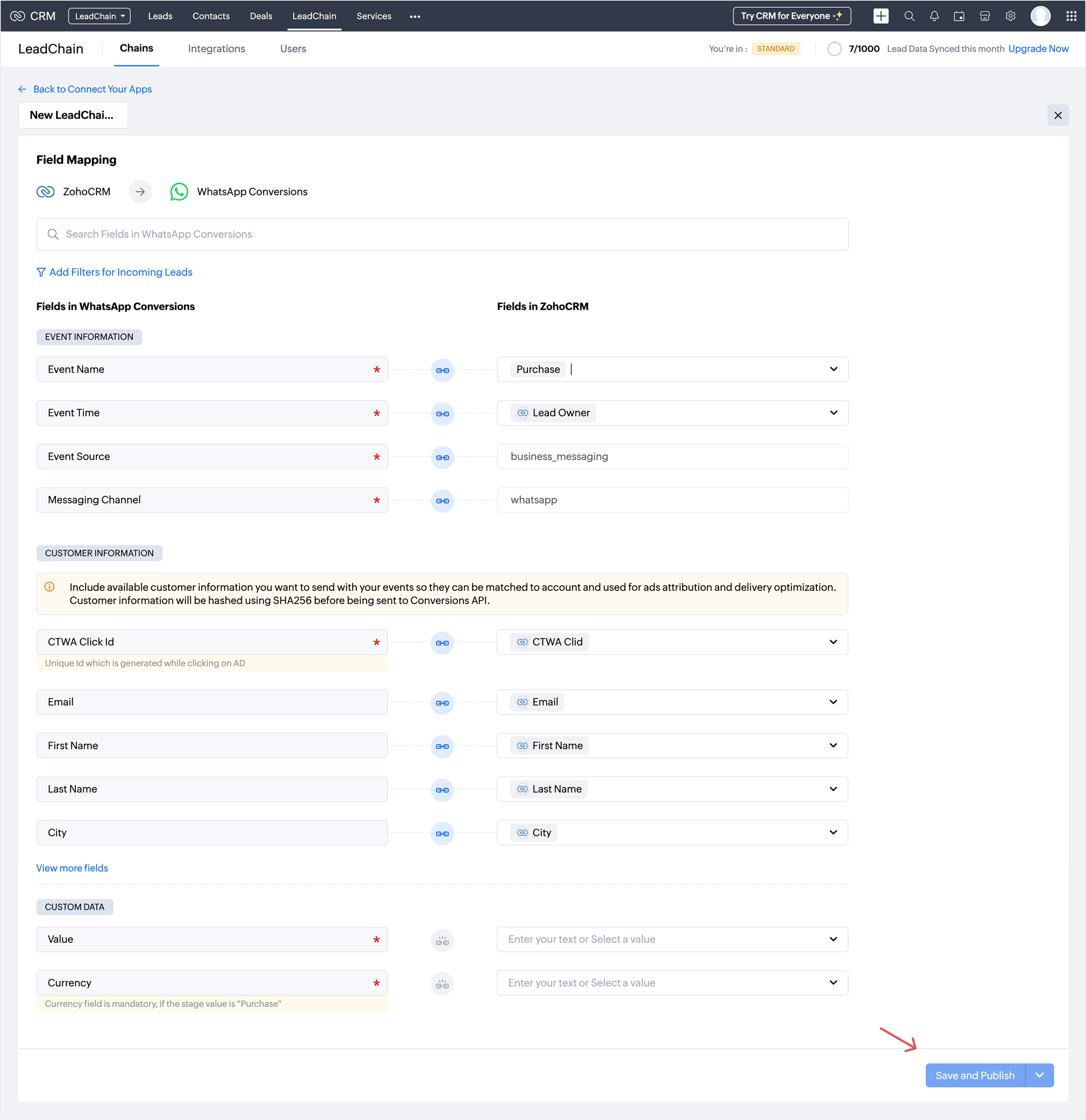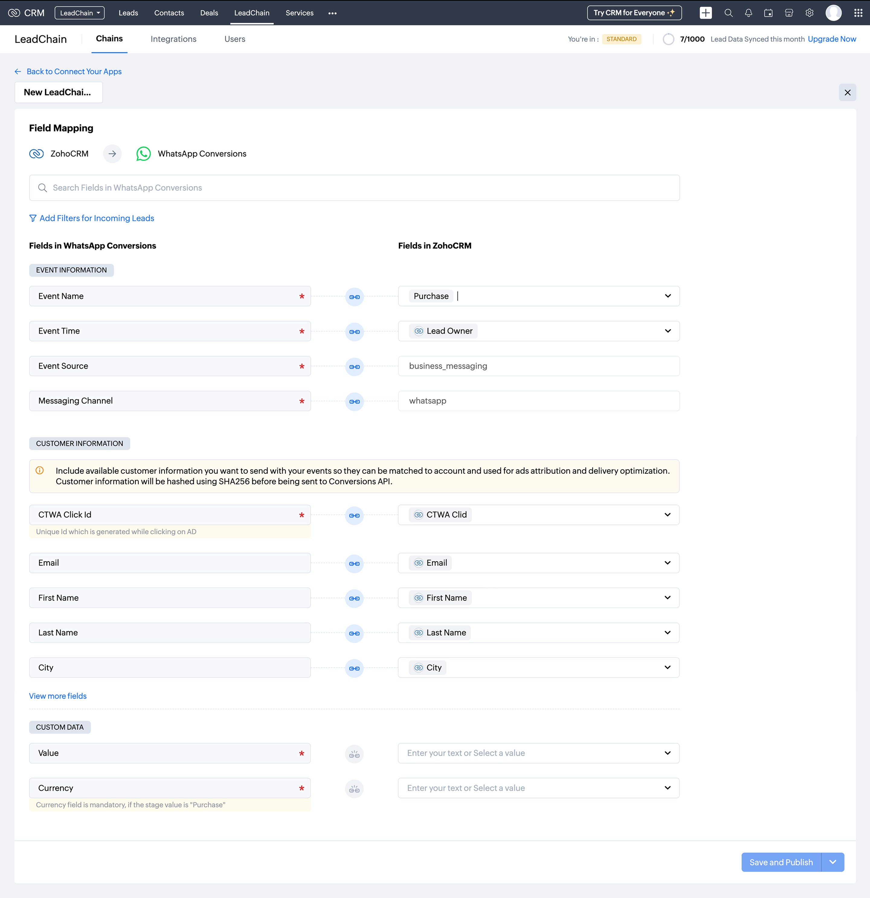 This stage allows you to map the fields from your Zoho CRM to the corresponding fields in WhatsApp Lead conversions. This ensures that all lead and purchase details are captured accurately for tracking and reporting.