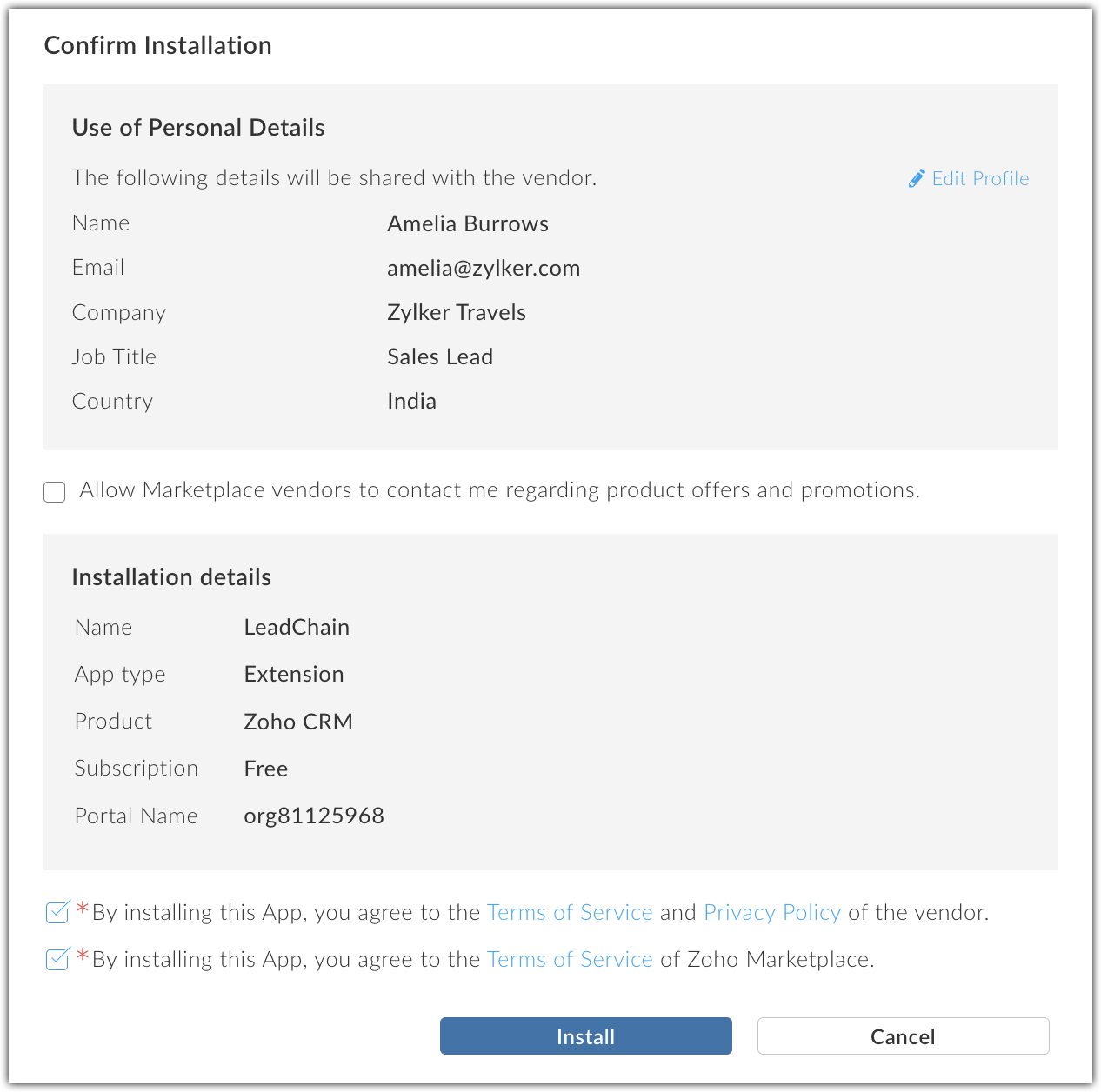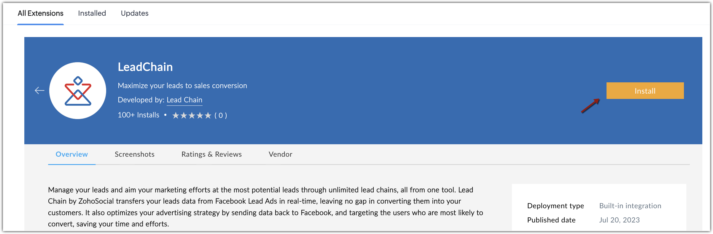 LeadChain is available as an extension in the Zoho CRM's marketplace. Once installed, the following components will be added to your CRM: