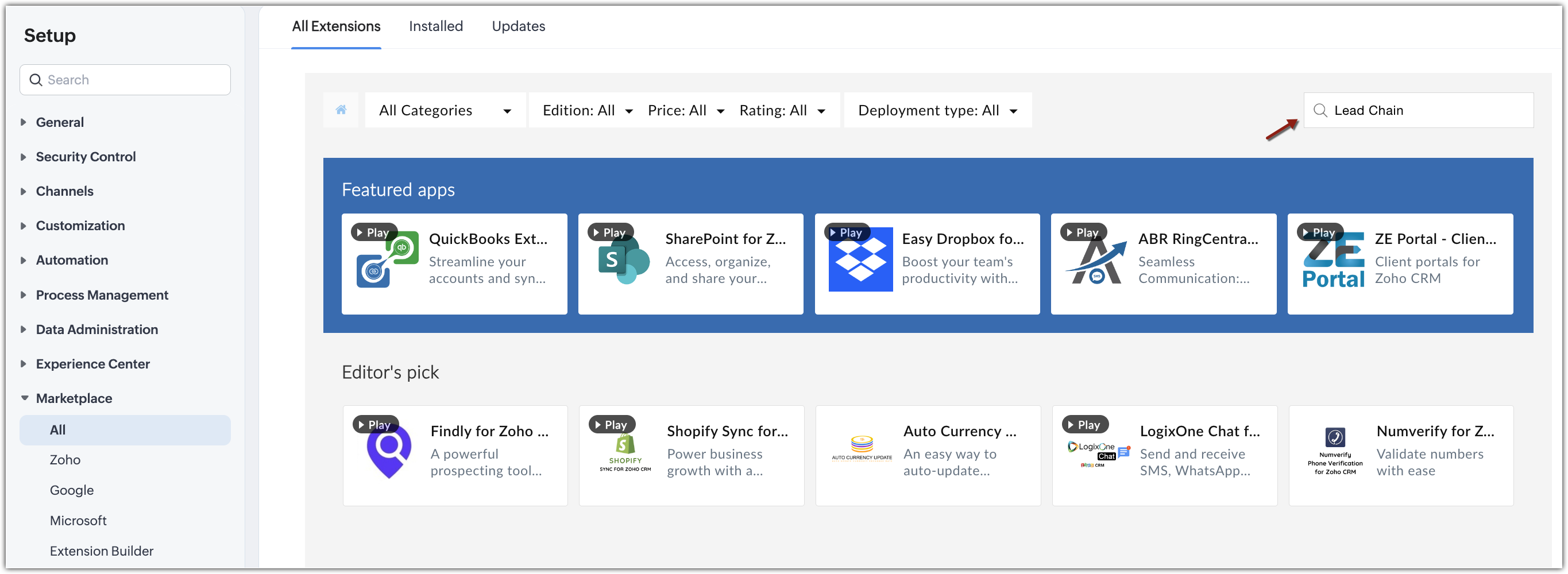 1. Go to Settings > Marketplace > All in Zoho CRM.
