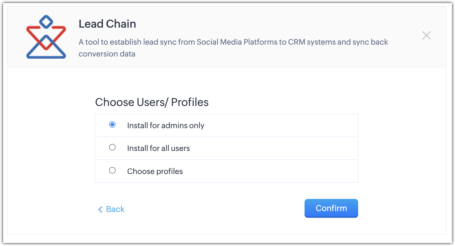 3. Choose profiles - The extension will be installed in CRM for manually chosen users. Choose this option, click Confirm, then select the desired profiles.