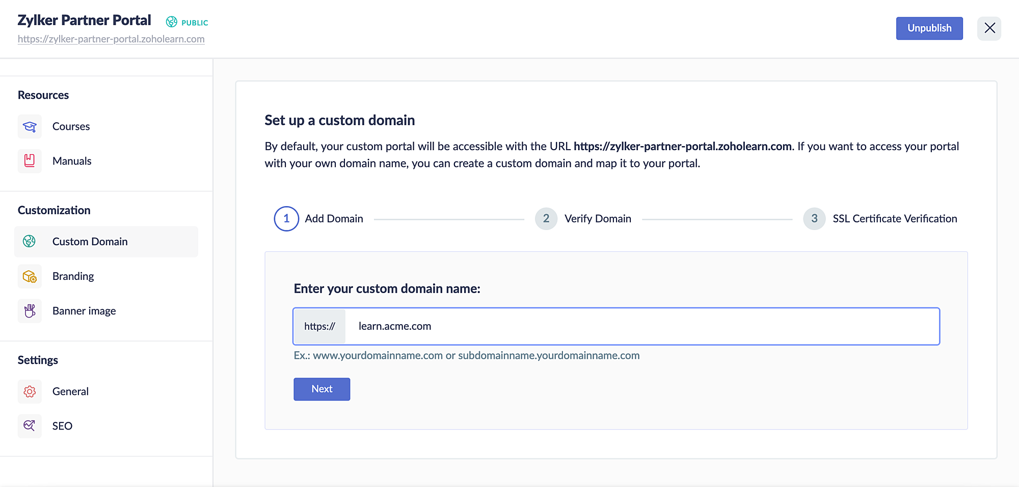 5. Once you've created a CNAME record, navigate to the Custom Domain tab in Admin Settings, then click Submit & Verify. The SSL certificate installation will be initiated and will be completed in a maximum of two business days.