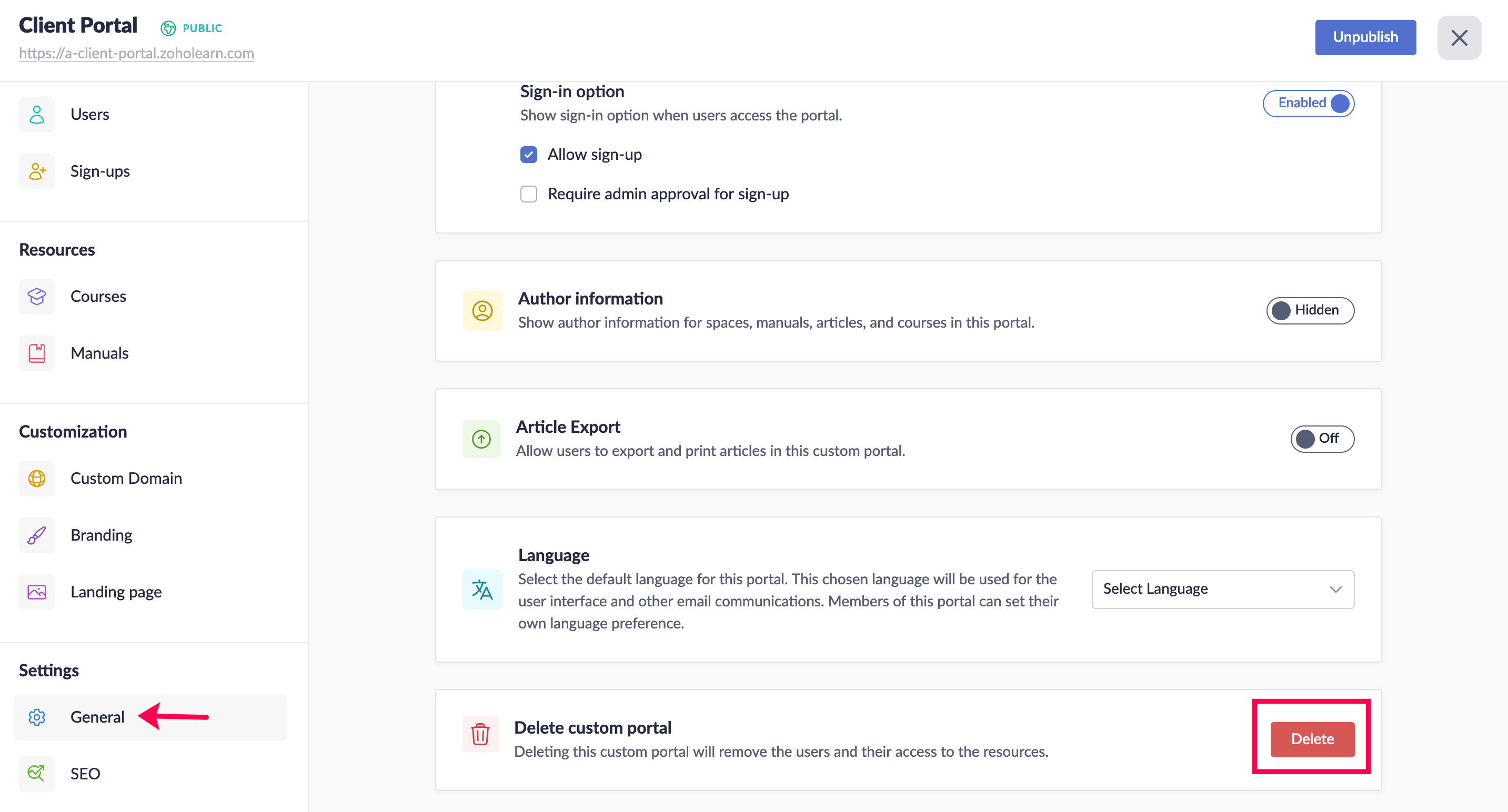 2. Go to the General tab and navigate to the Delete custom portal section.