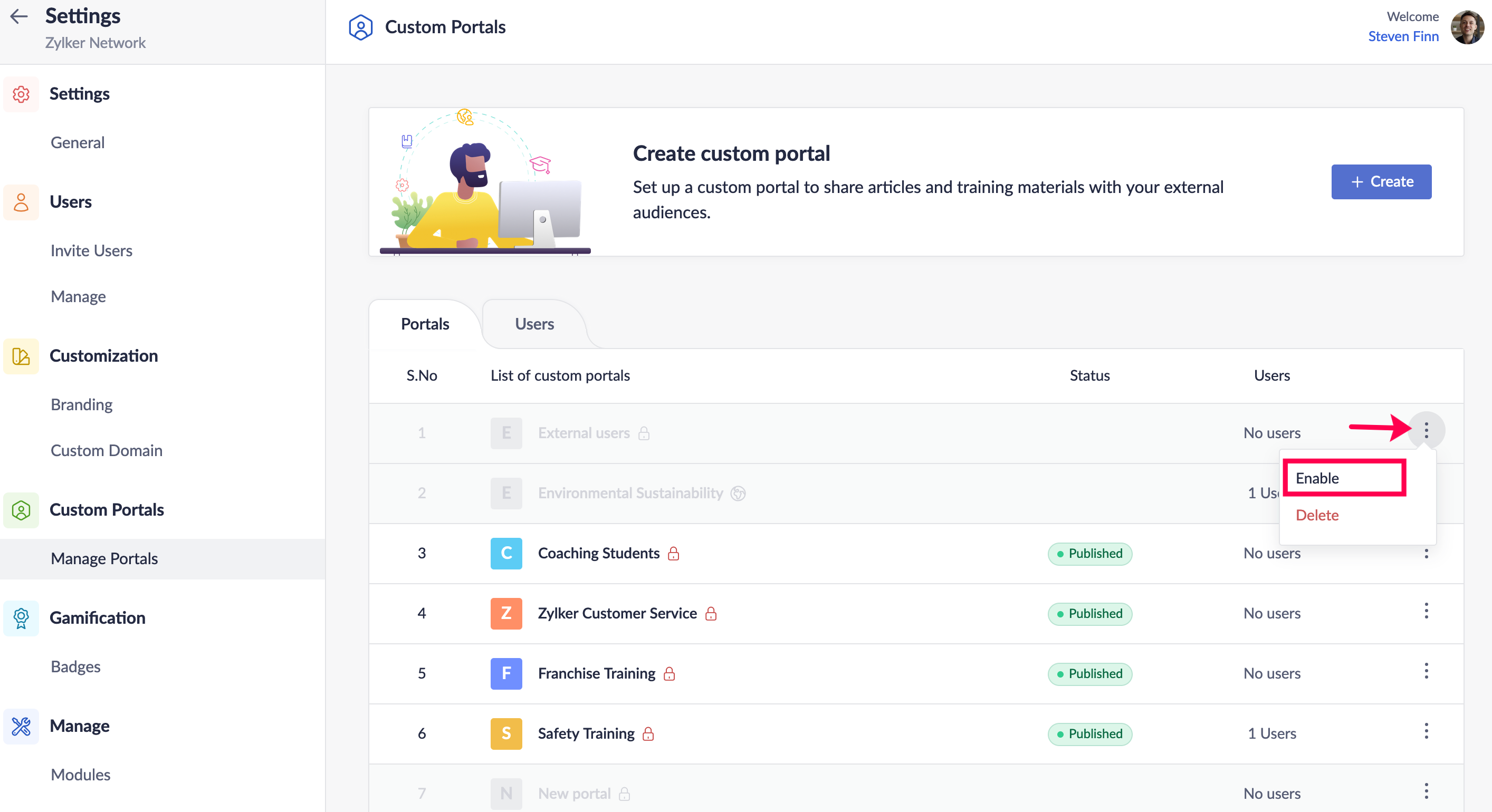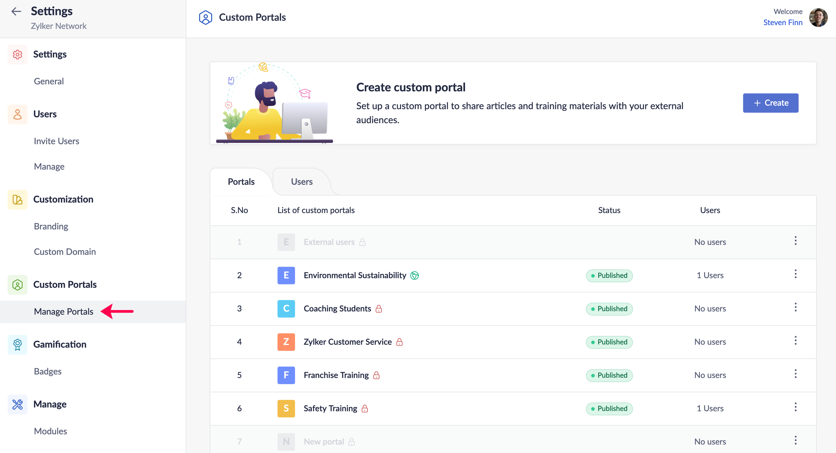 Once a custom portal is published, you can customize it by making changes to its name, description, and permalink. Accessing a custom portal To access a custom portal: Choose Settings by clicking the Settings icon Select Manage Portals from the ...