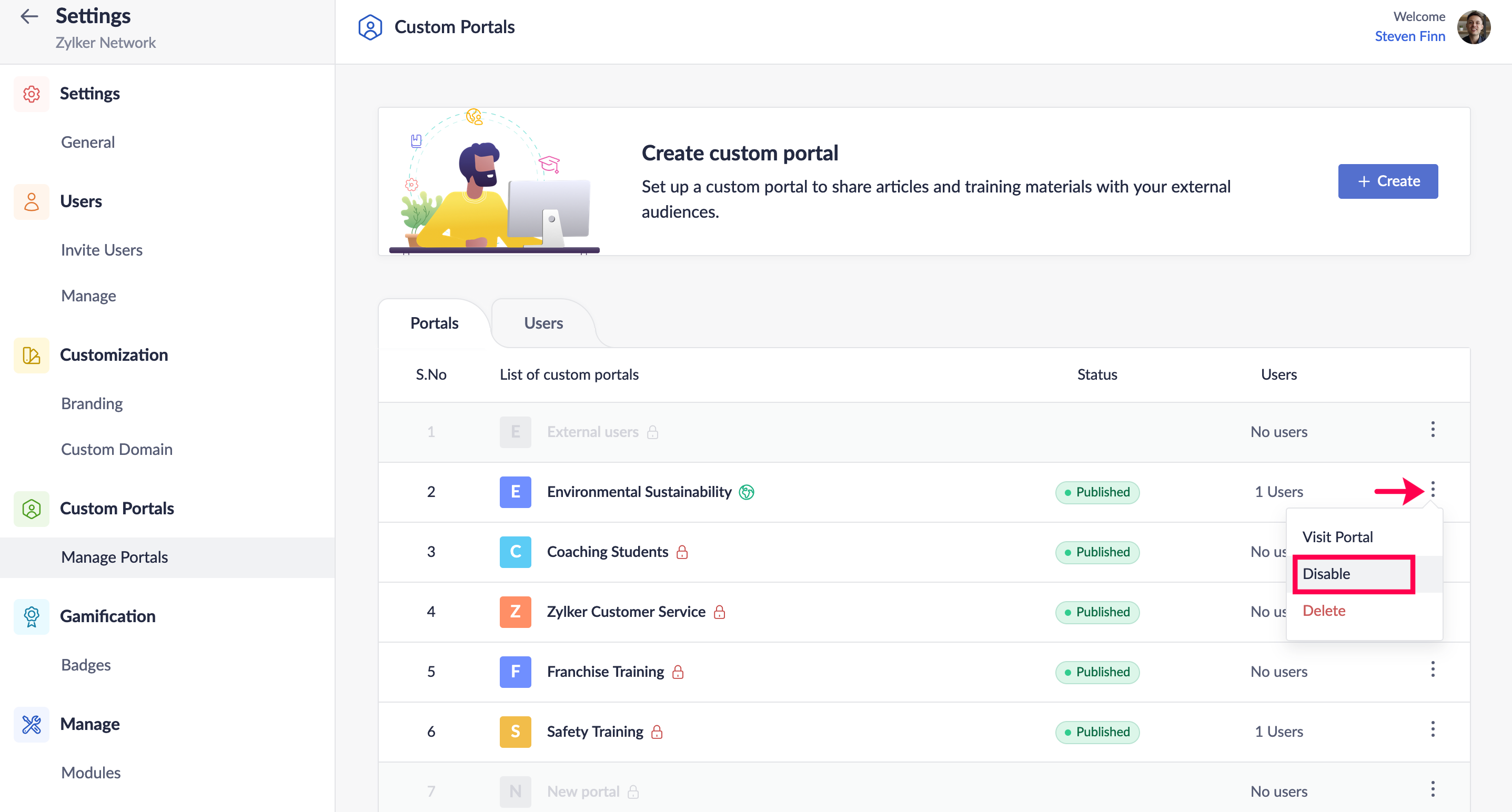 3. Click on the More options ( )  icon next to the portal that you want to disable.
