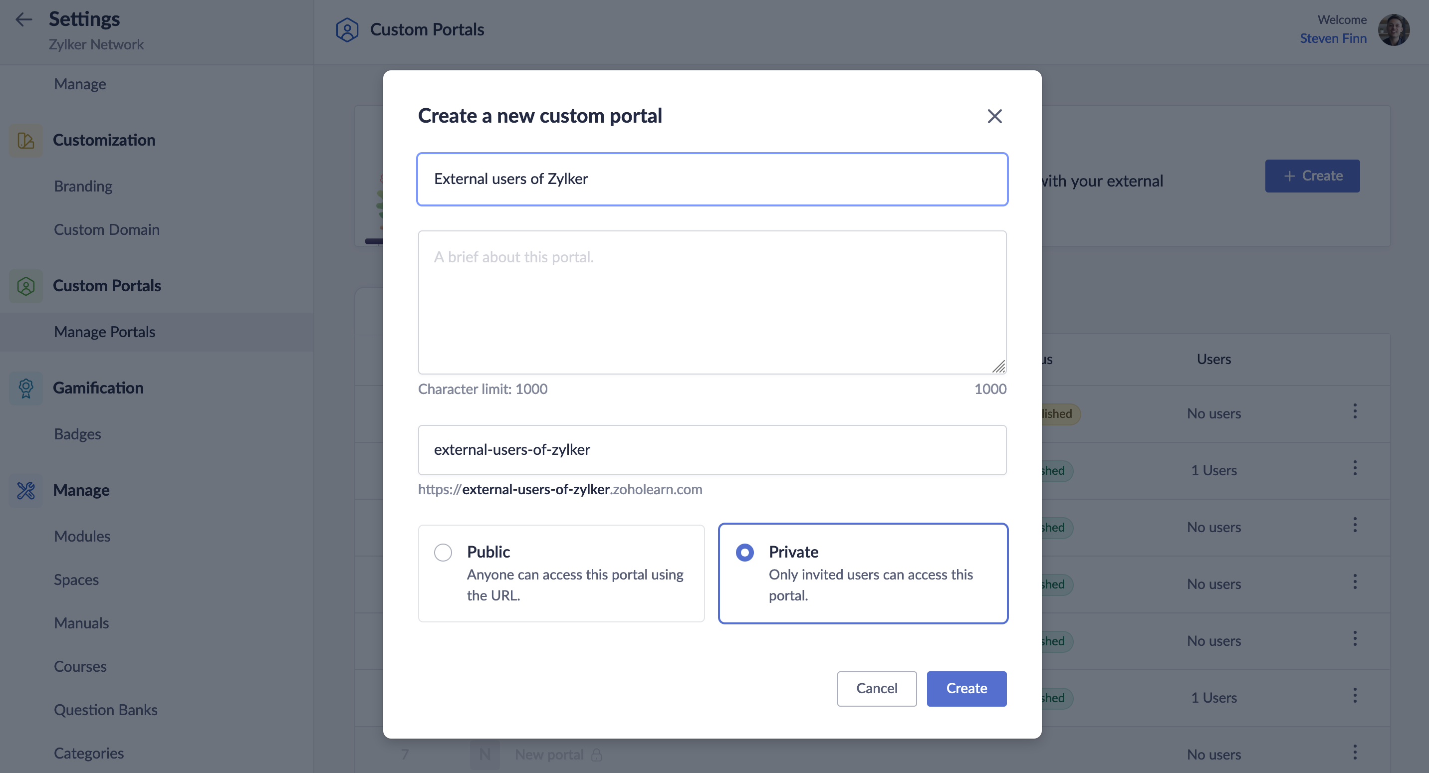 This step includes providing a name, adding a description, customizing the permalink and choosing whether you want to make the portal public or private. Once you've filled in all the fields, select Create.