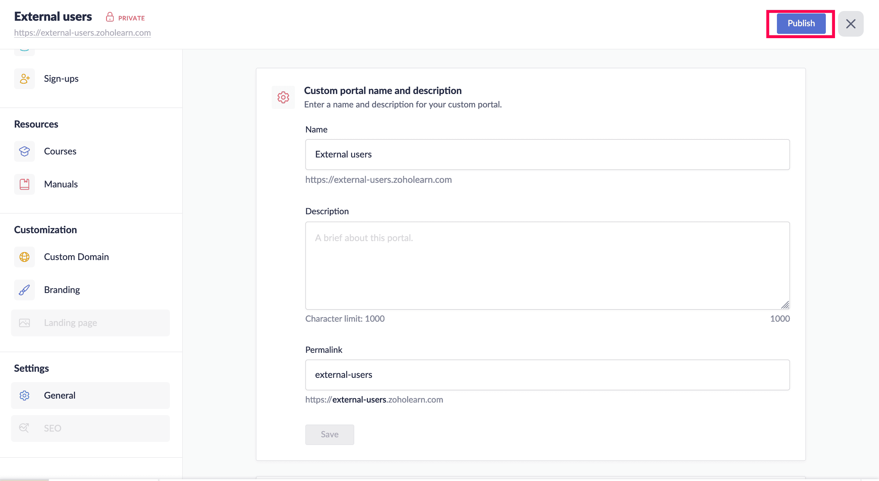 Once you've finished setting up your custom portal, you can then make it available for users by clicking the Publish button.