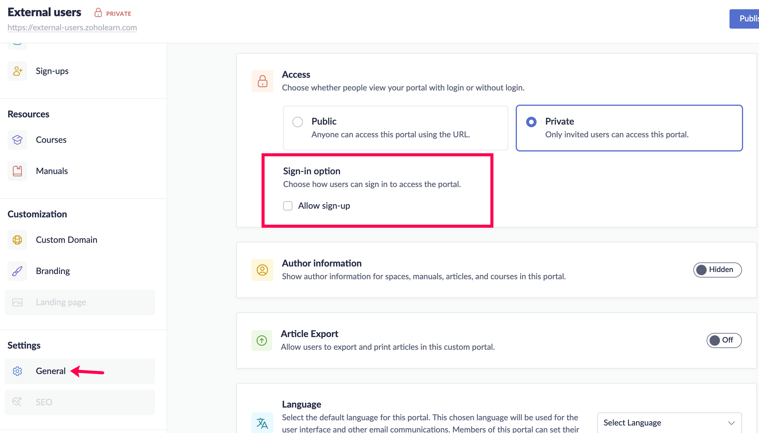 You can also allow external users to sign up to your portal and manage these sign-ups by choosing to enable the admin approval option. You can enable this option in General under Settings .