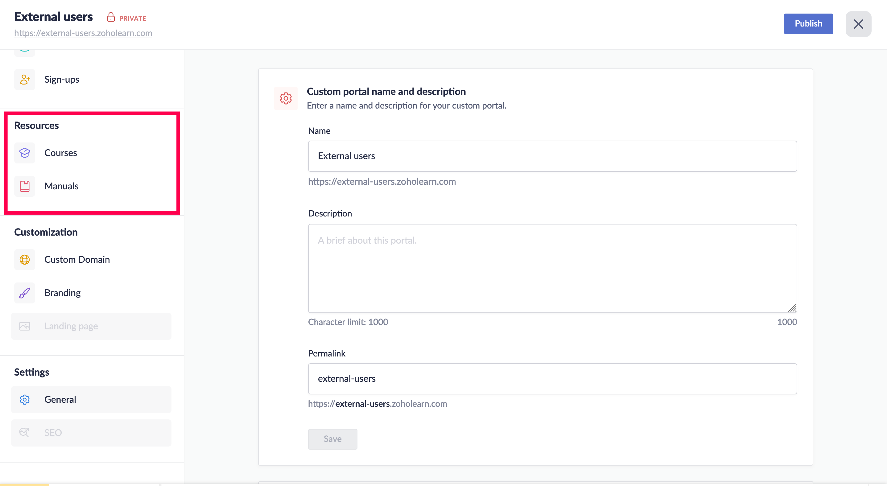 Public portal: Public portals can be used to share resources that anyone can freely access. Any user who has the link to your portal will be able to access this portal.