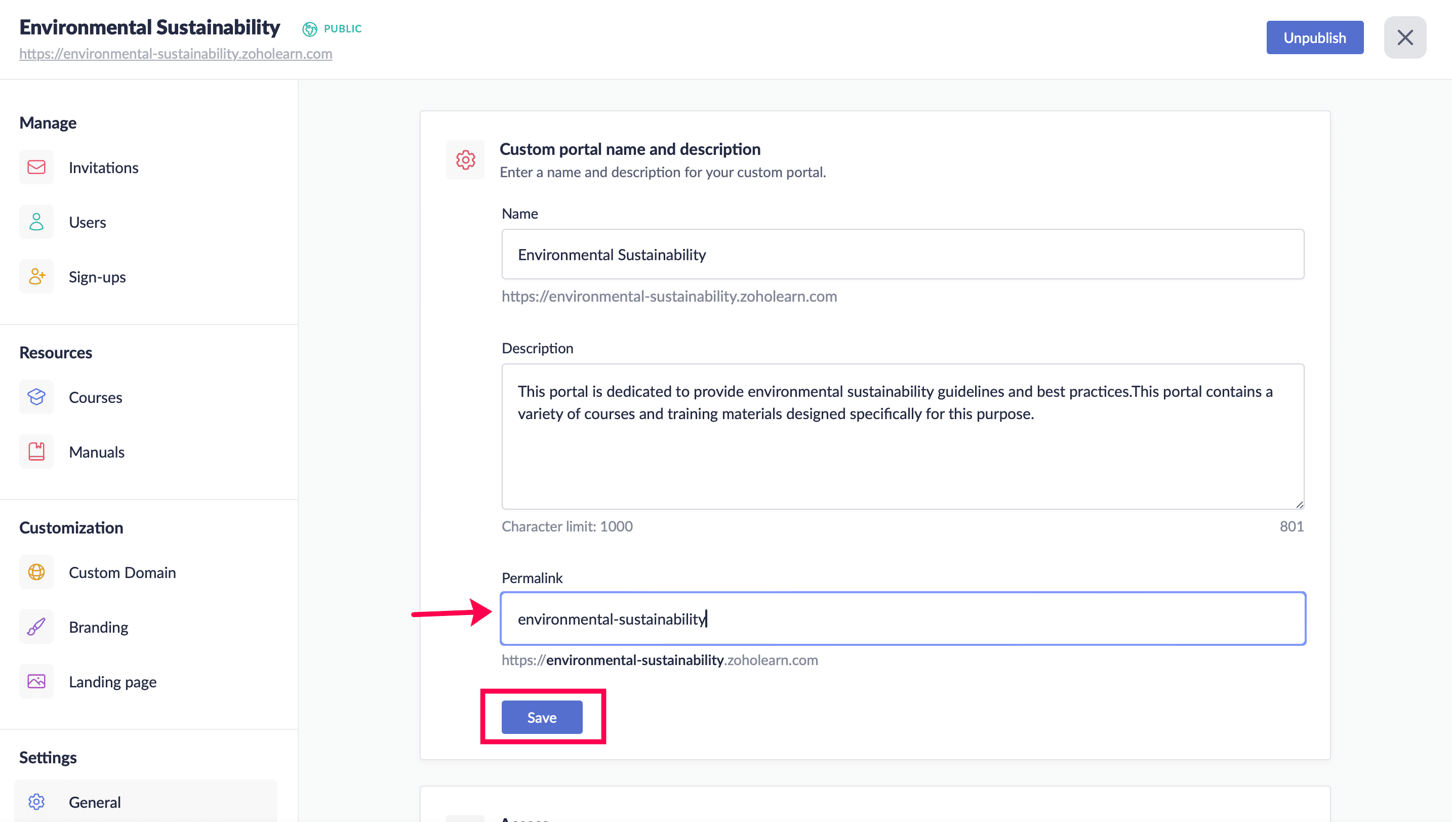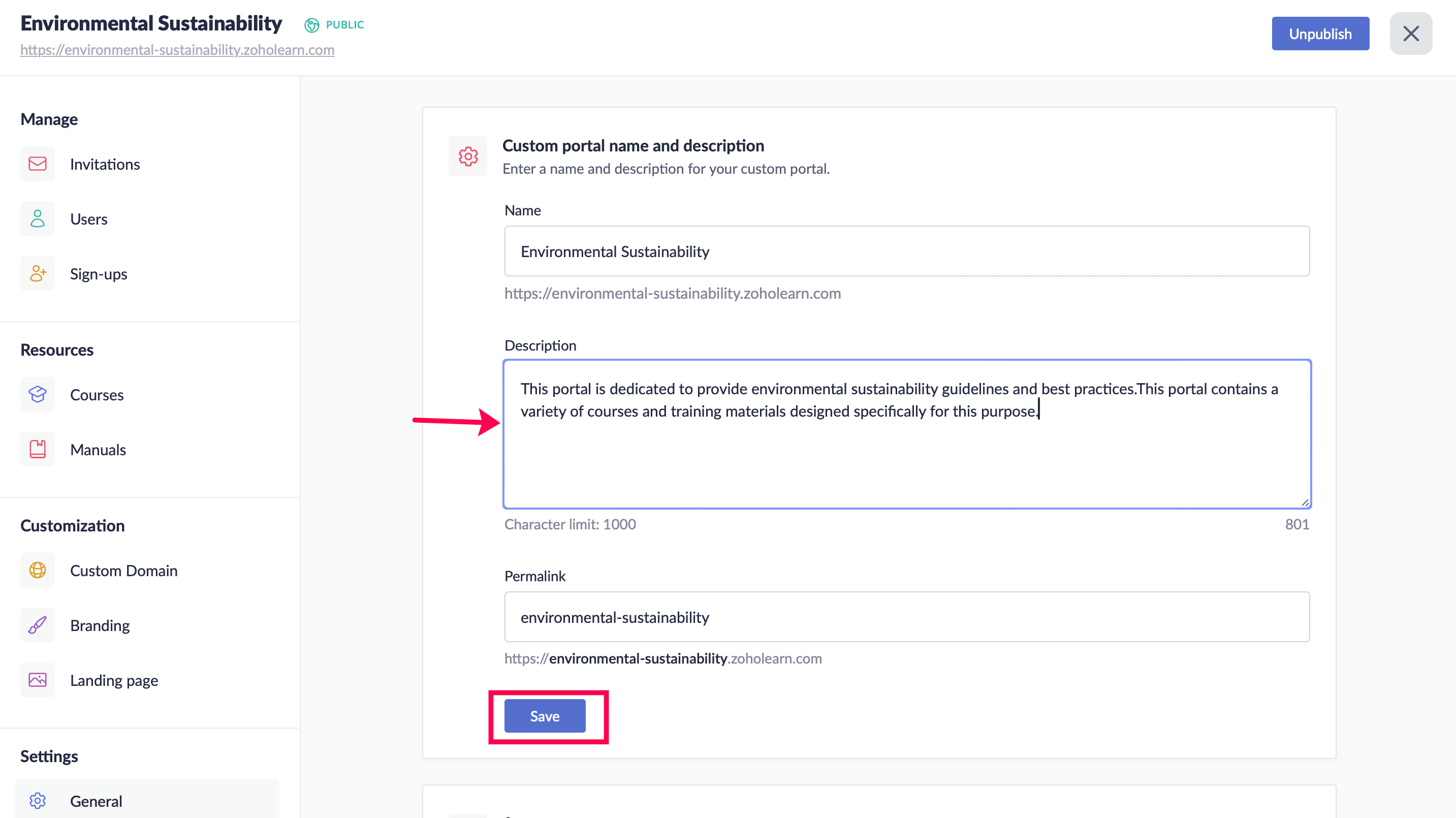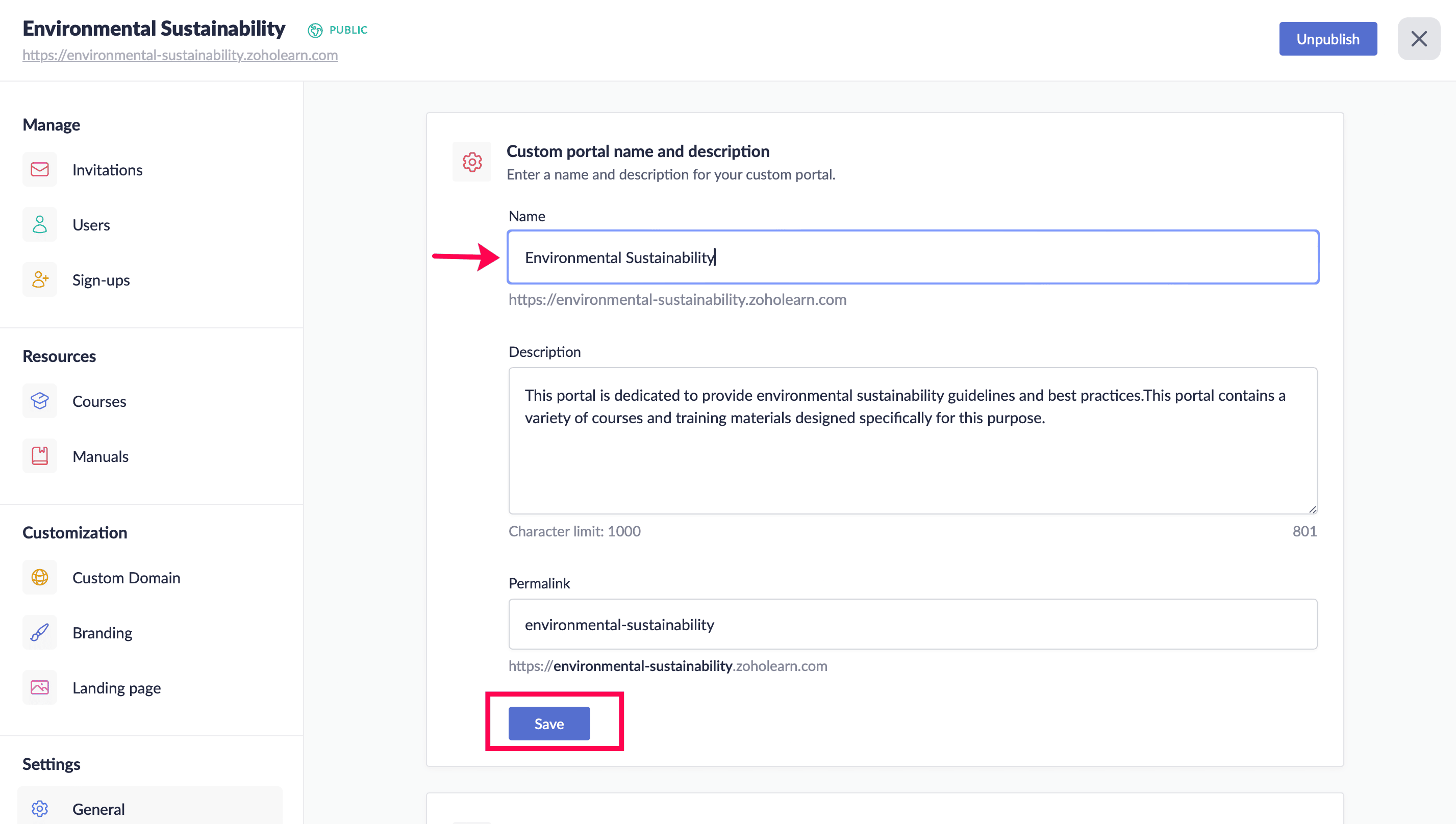 Once a custom portal is published, you can customize it by making changes to its name, description, and permalink.