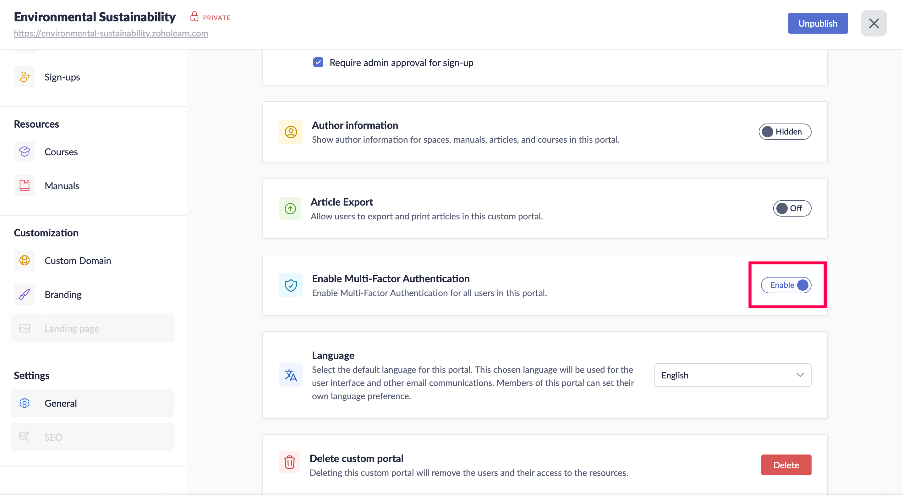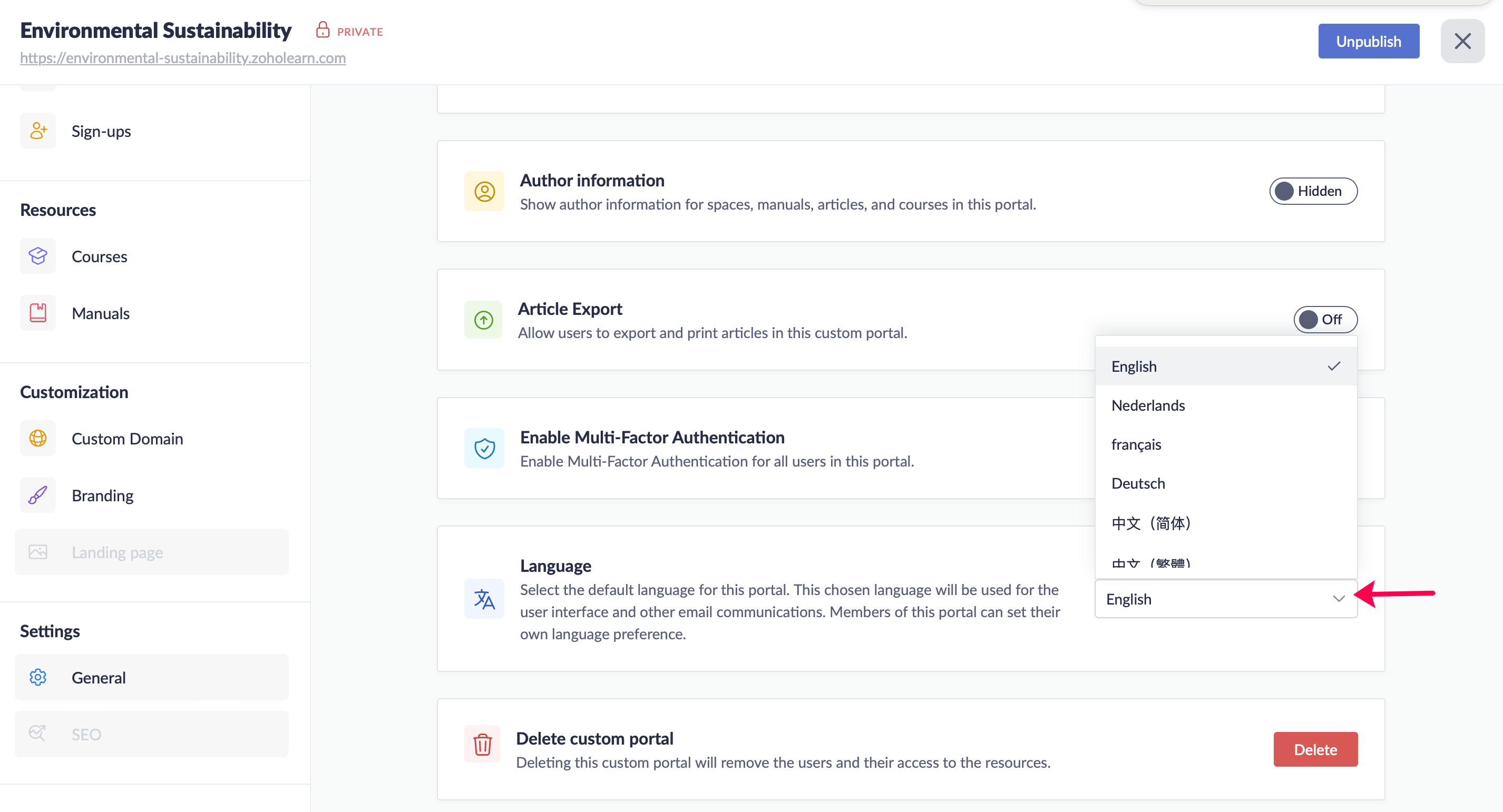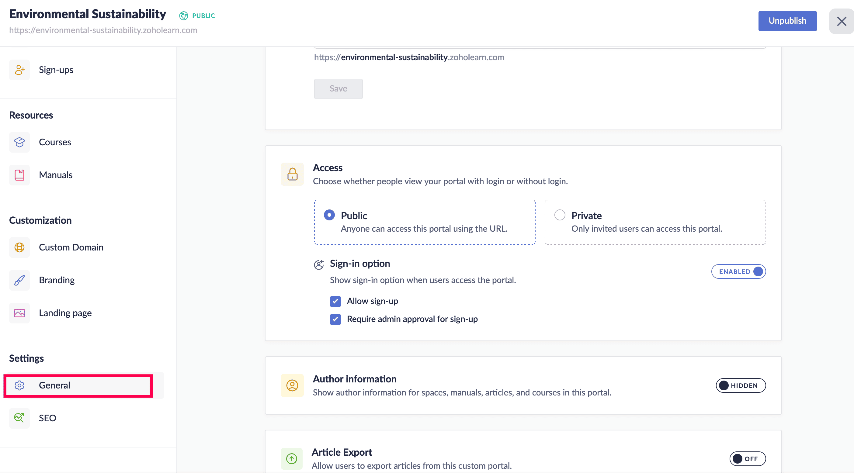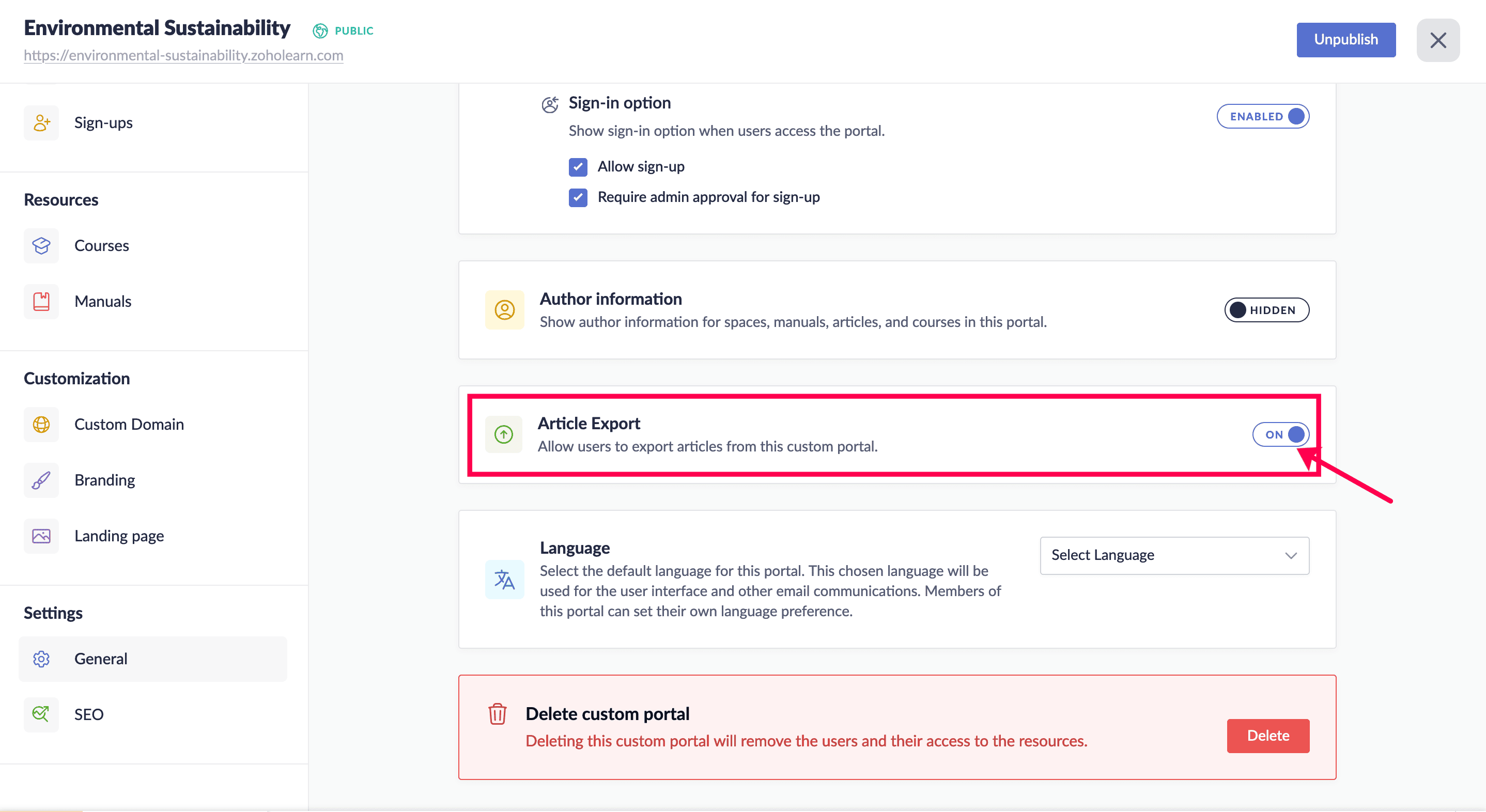 Article export option in the custom portal will allow you to have a control on whether you want to let your external users export articles in the manuals that you have shared to the custom portal. You can configure this option from General under the Settings section of your custom portal.