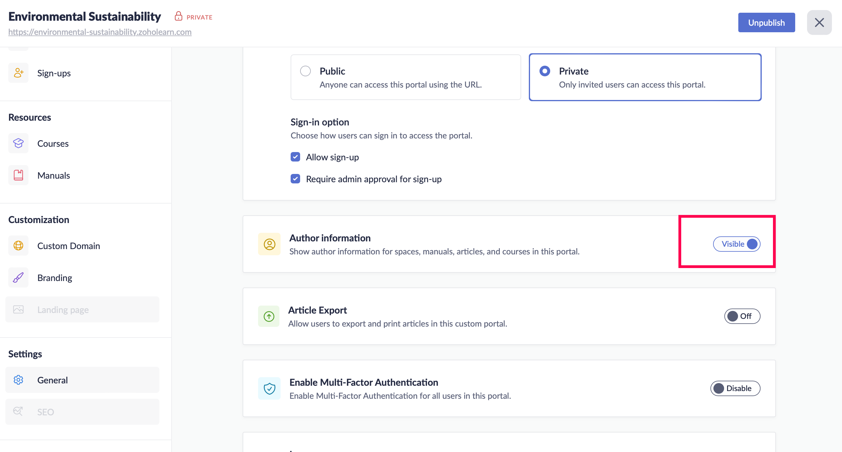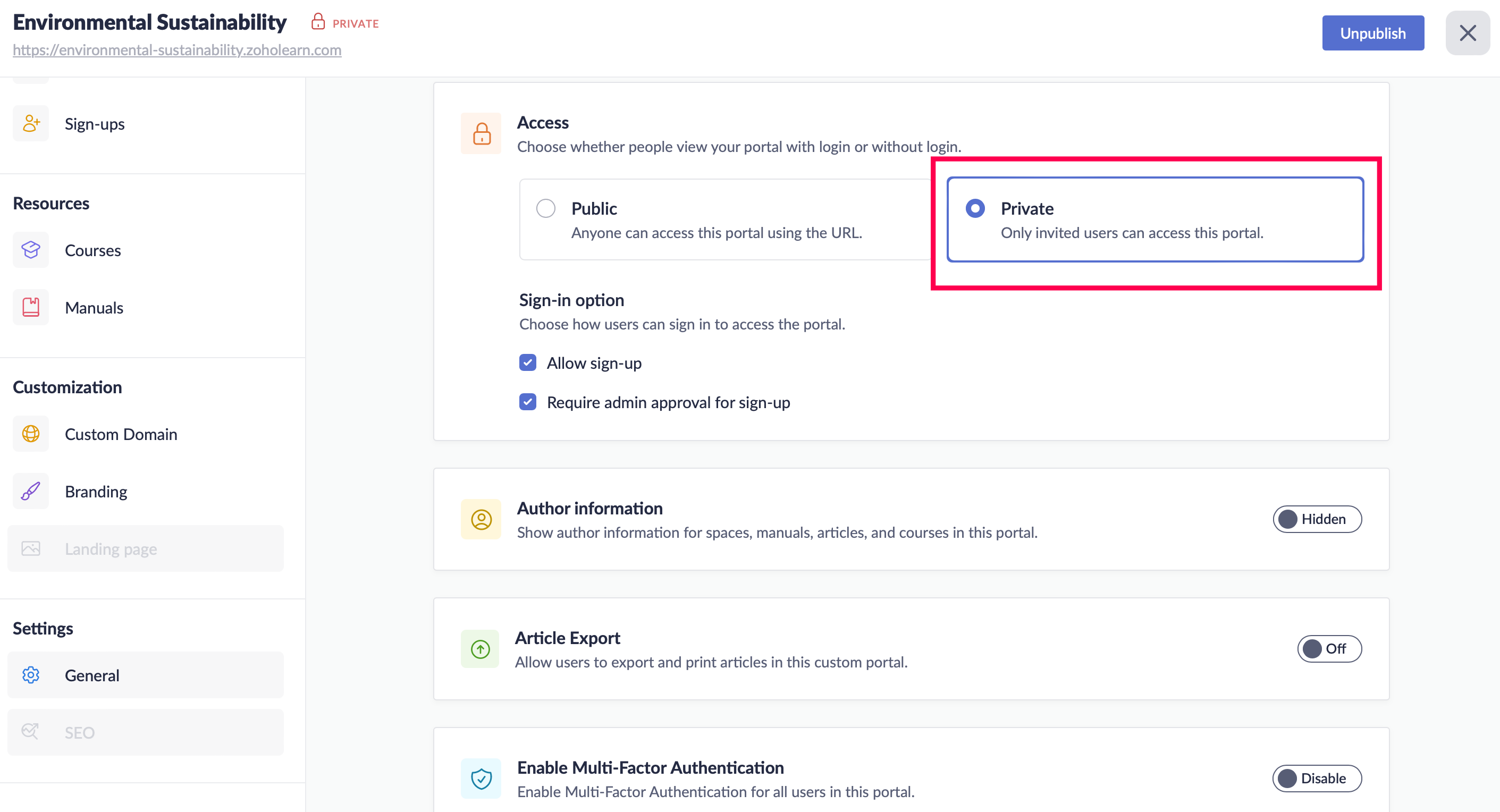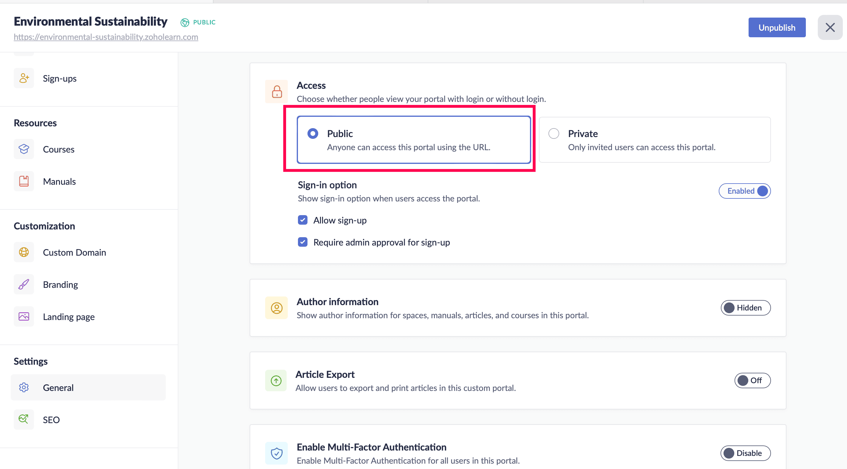 The admin can choose who can access the portal. You can choose to set your portal as public or keep it private.