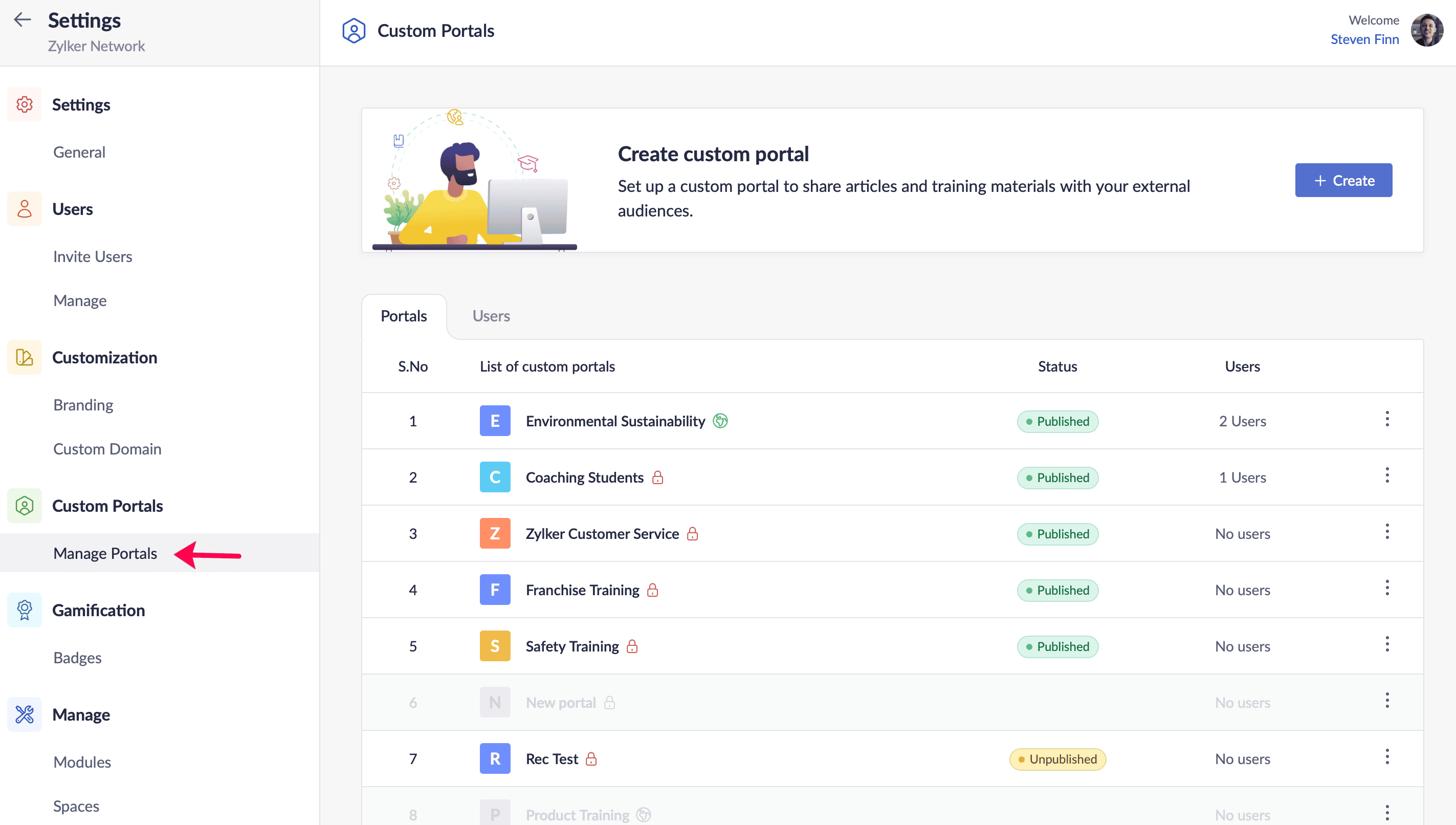 The hub admin can create multiple portals for external users and manage their settings. All the portals created for the hub will be listed in the Custom Portal tab under hub admin settings. To create a new custom portal: Go to the Manage Portals tab ...
