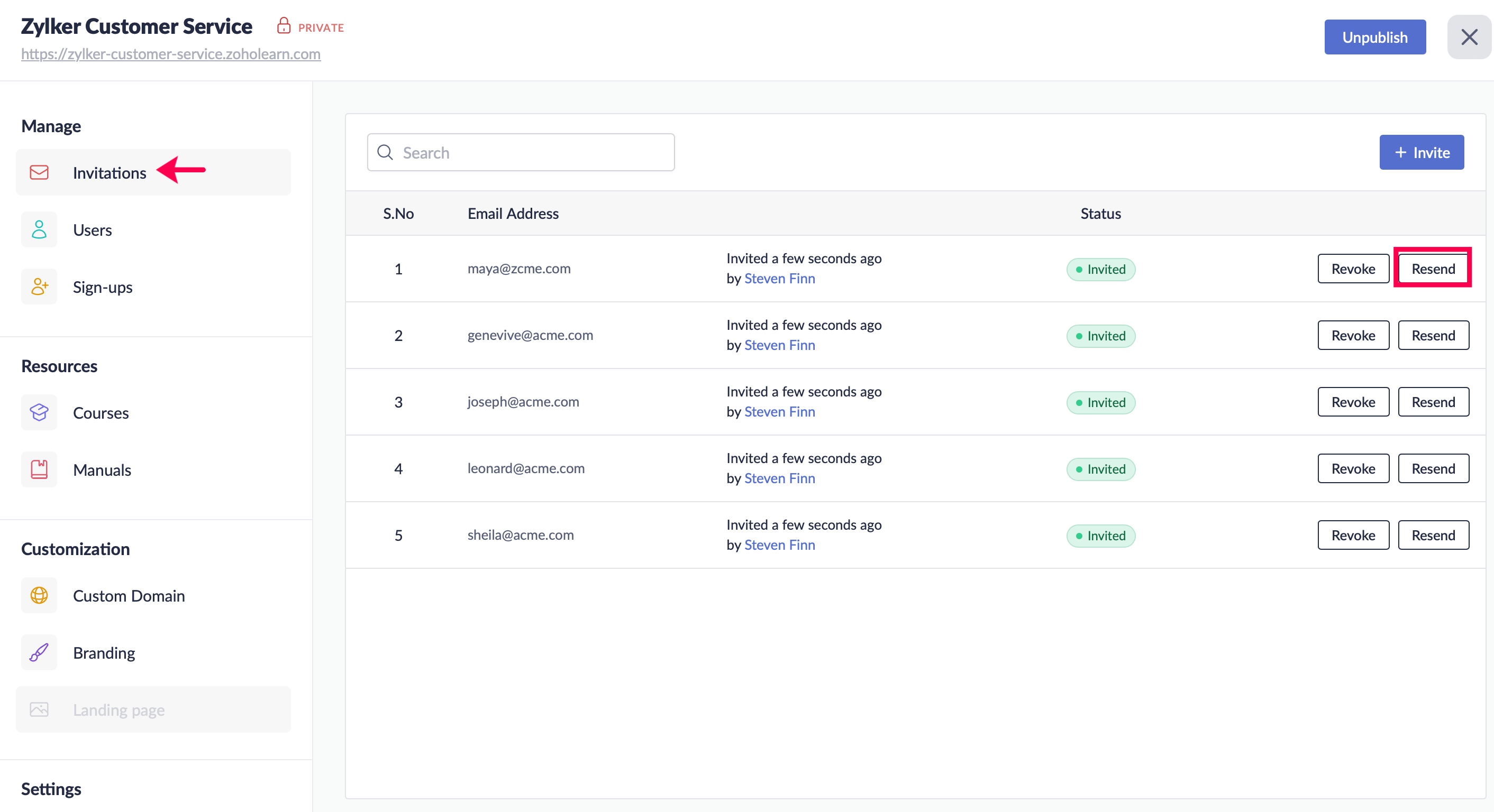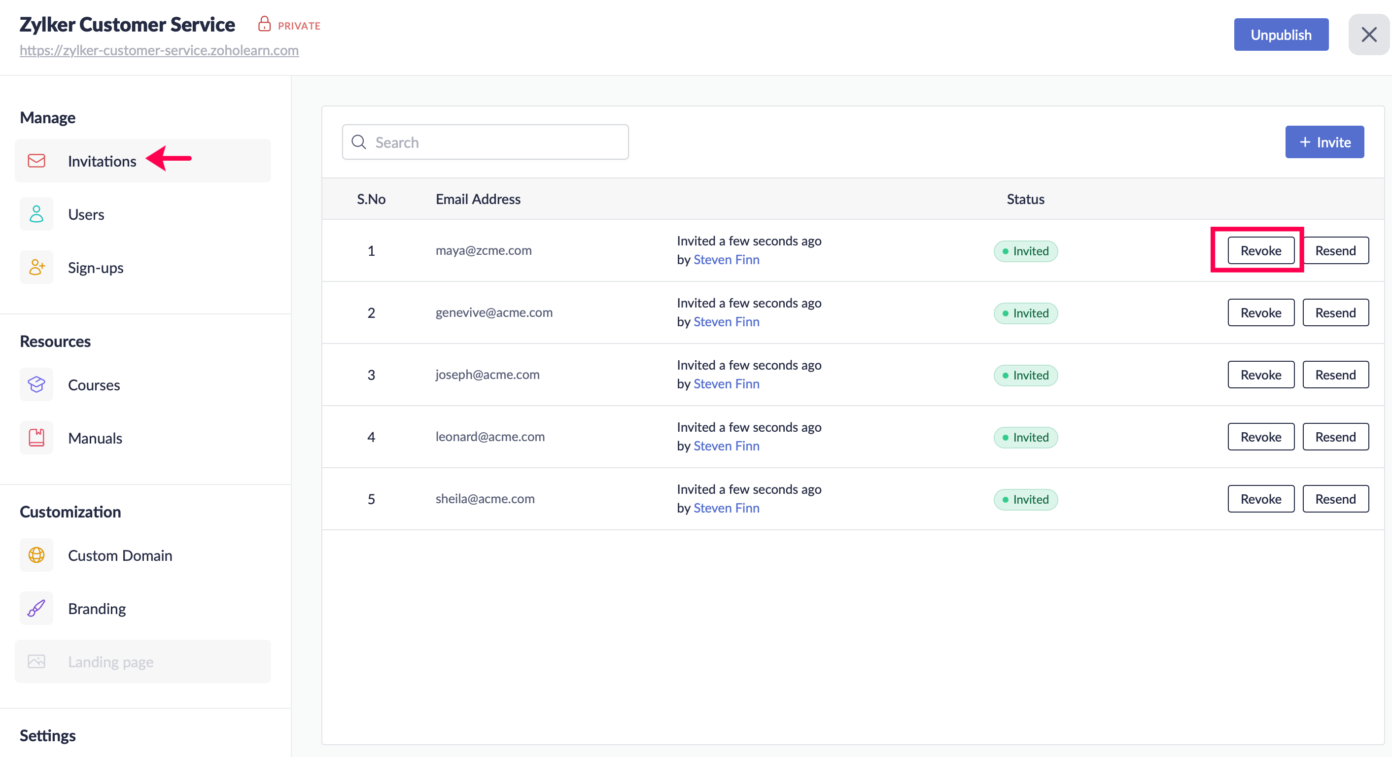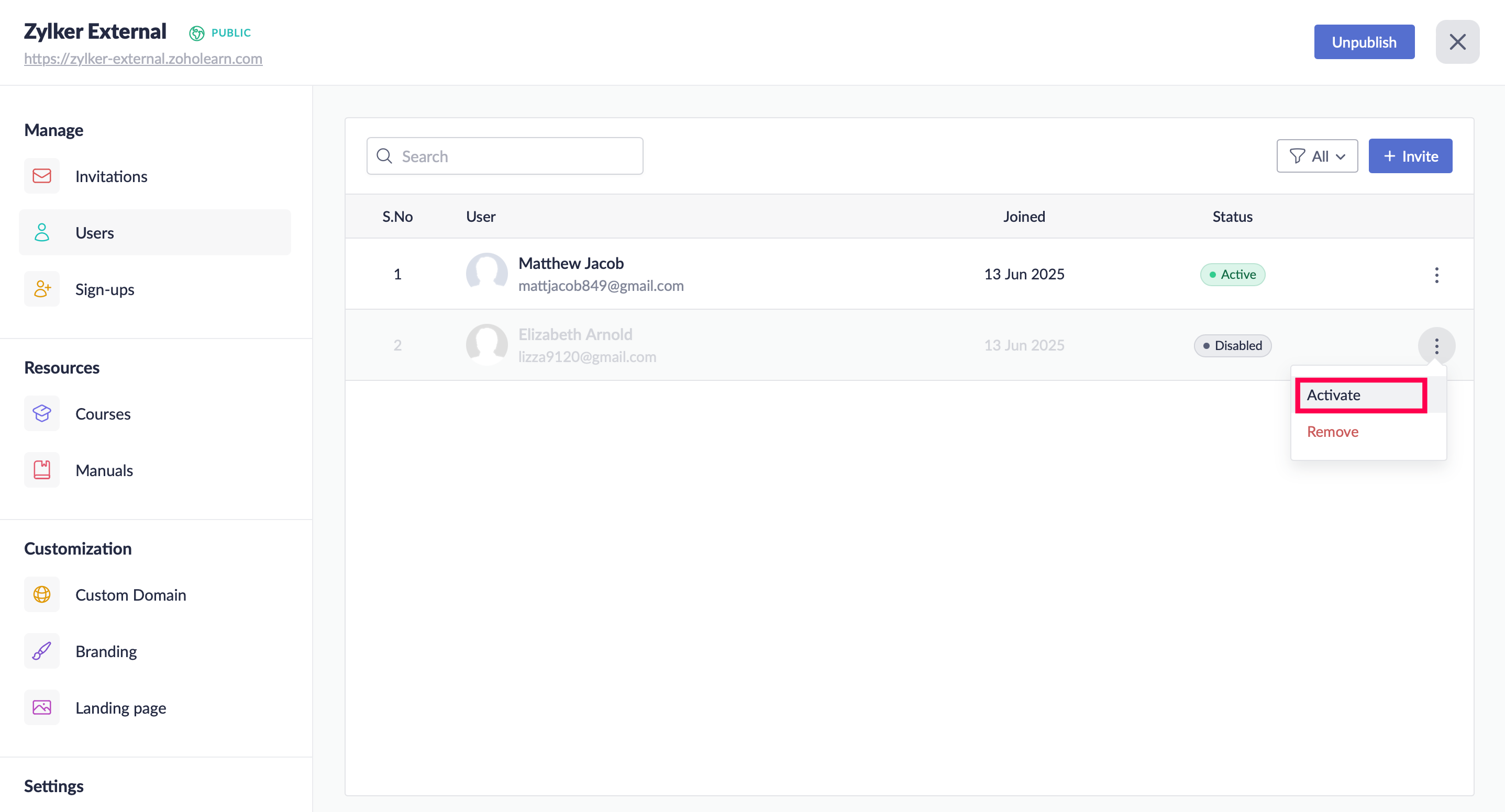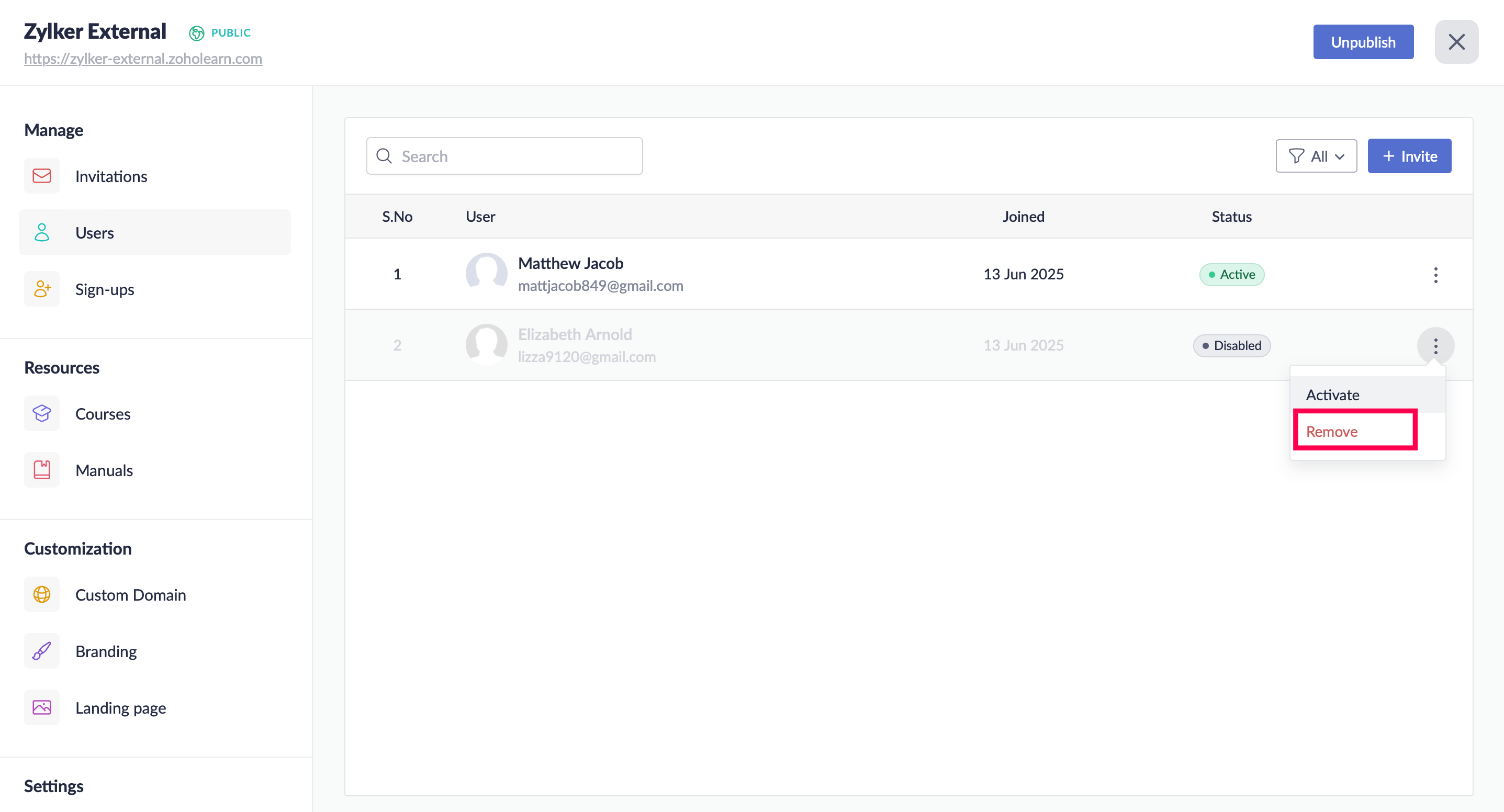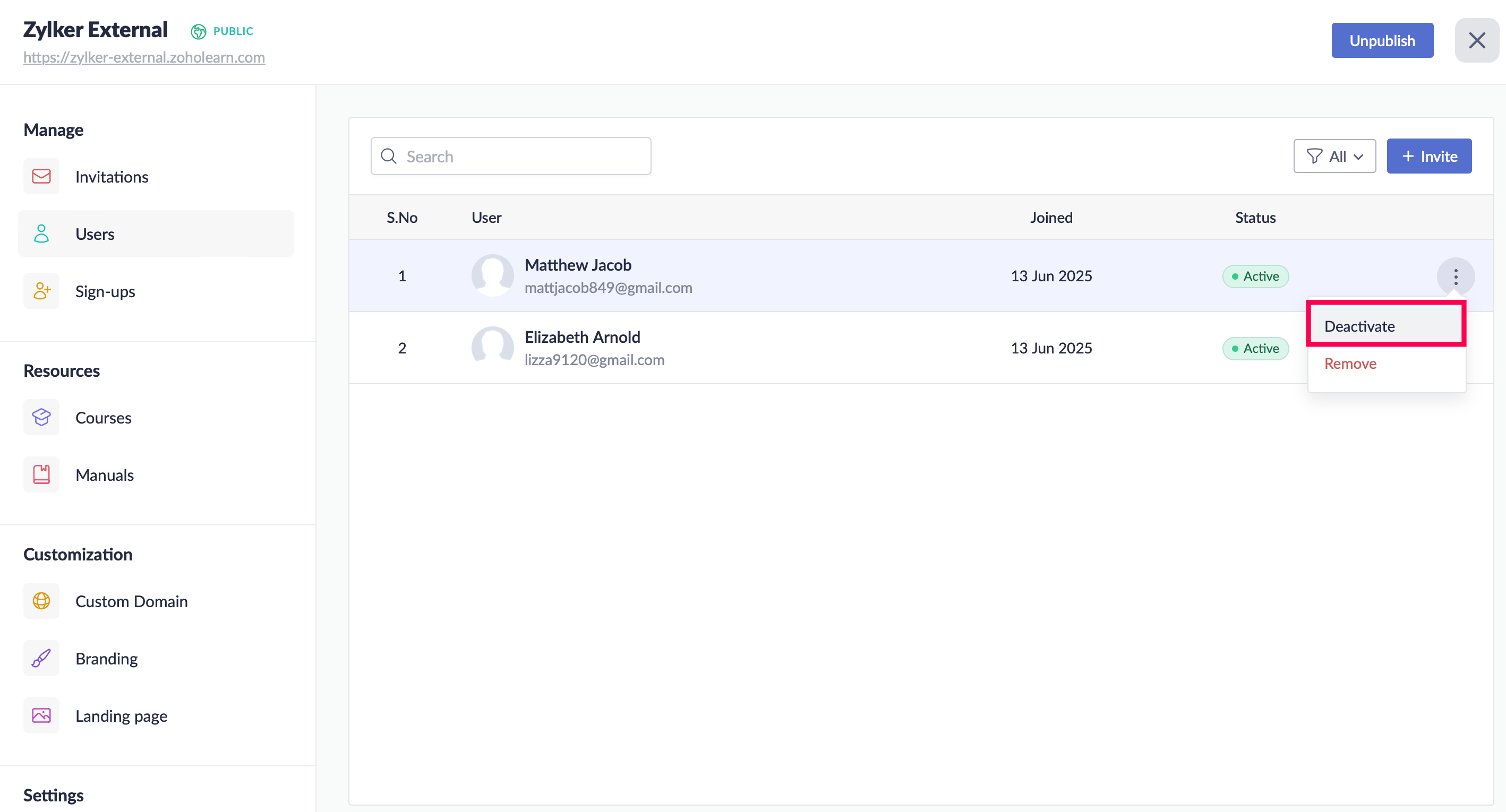 You can manage users in your custom portal. Resend or revoke invites, and activate, deactivate, or remove users as needed.