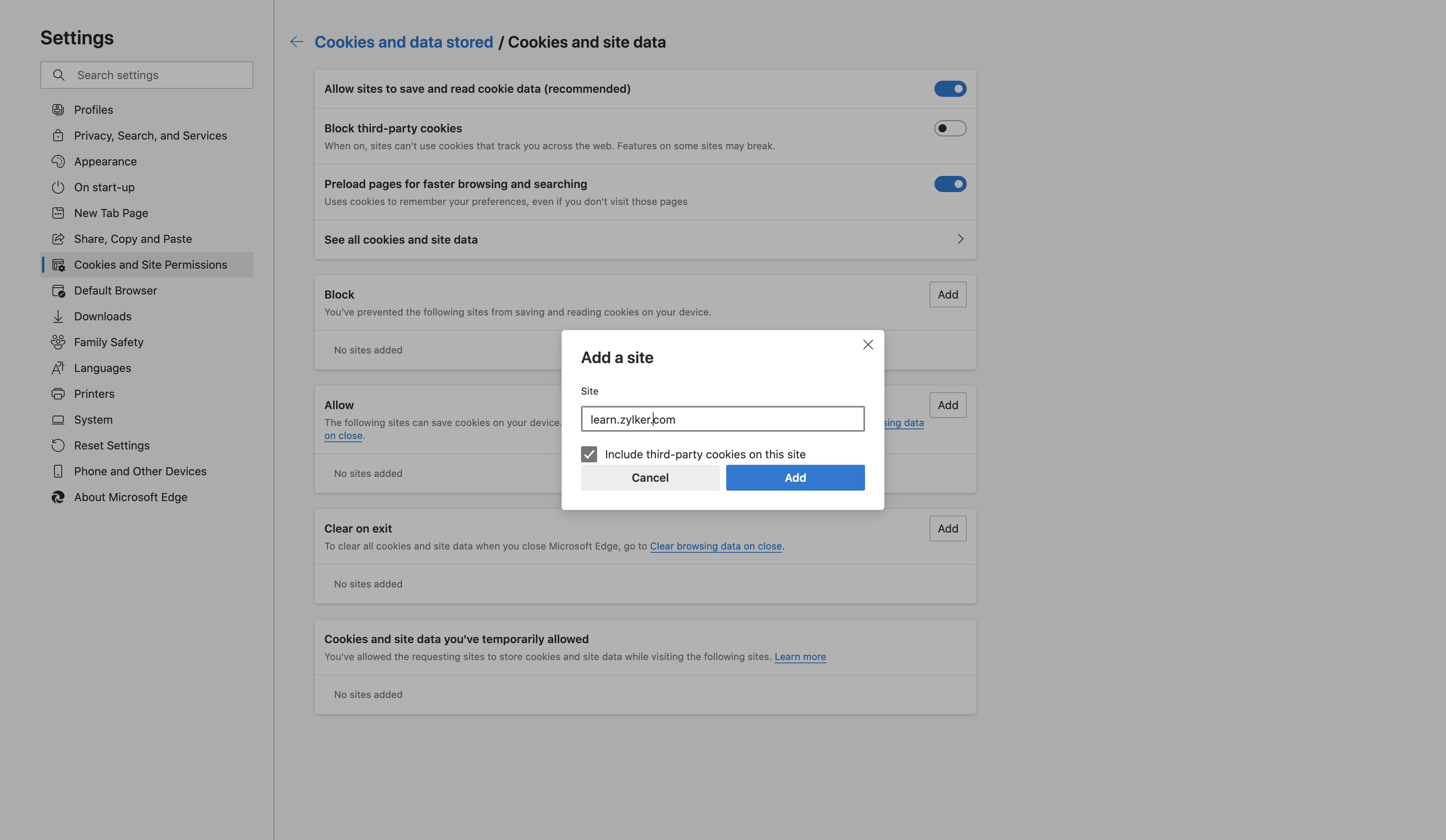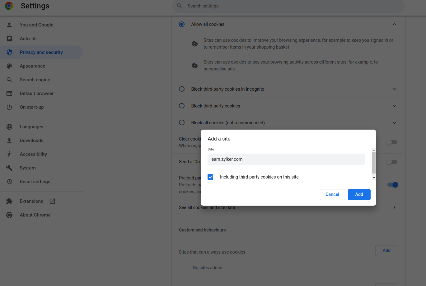 6. In the Add a site text box, enter your custom domain (for example learn.zylker.com'), check the Including third-party cookies on this site checkbox, and click Add.