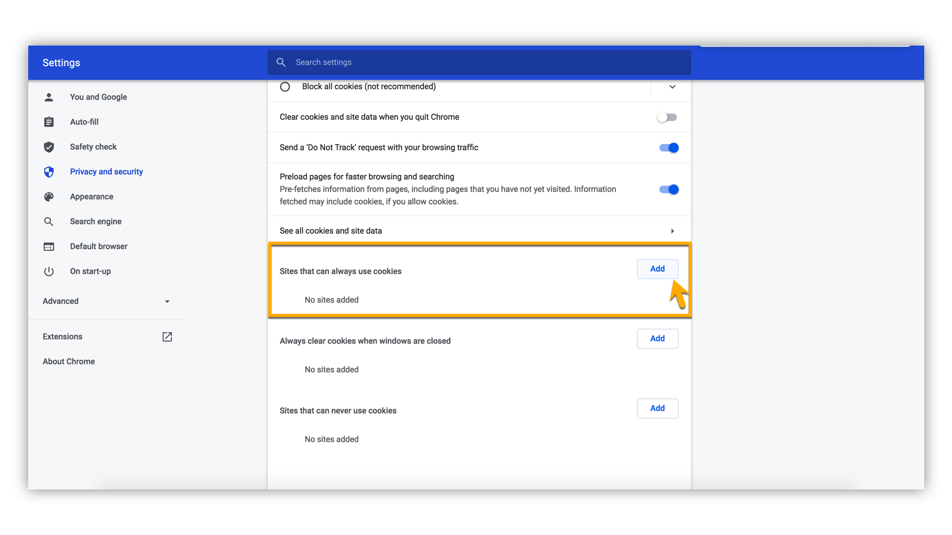 5. On the Cookies and site data page, click the Add button next to Sites that can always use cookies.