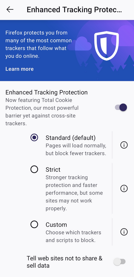 Choose your privacy settings from the three main options for privacy and cookies management: Standard, Strict, or Custom.