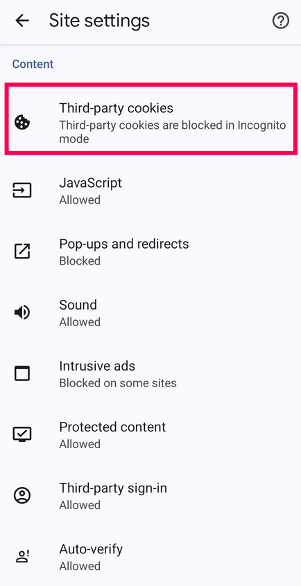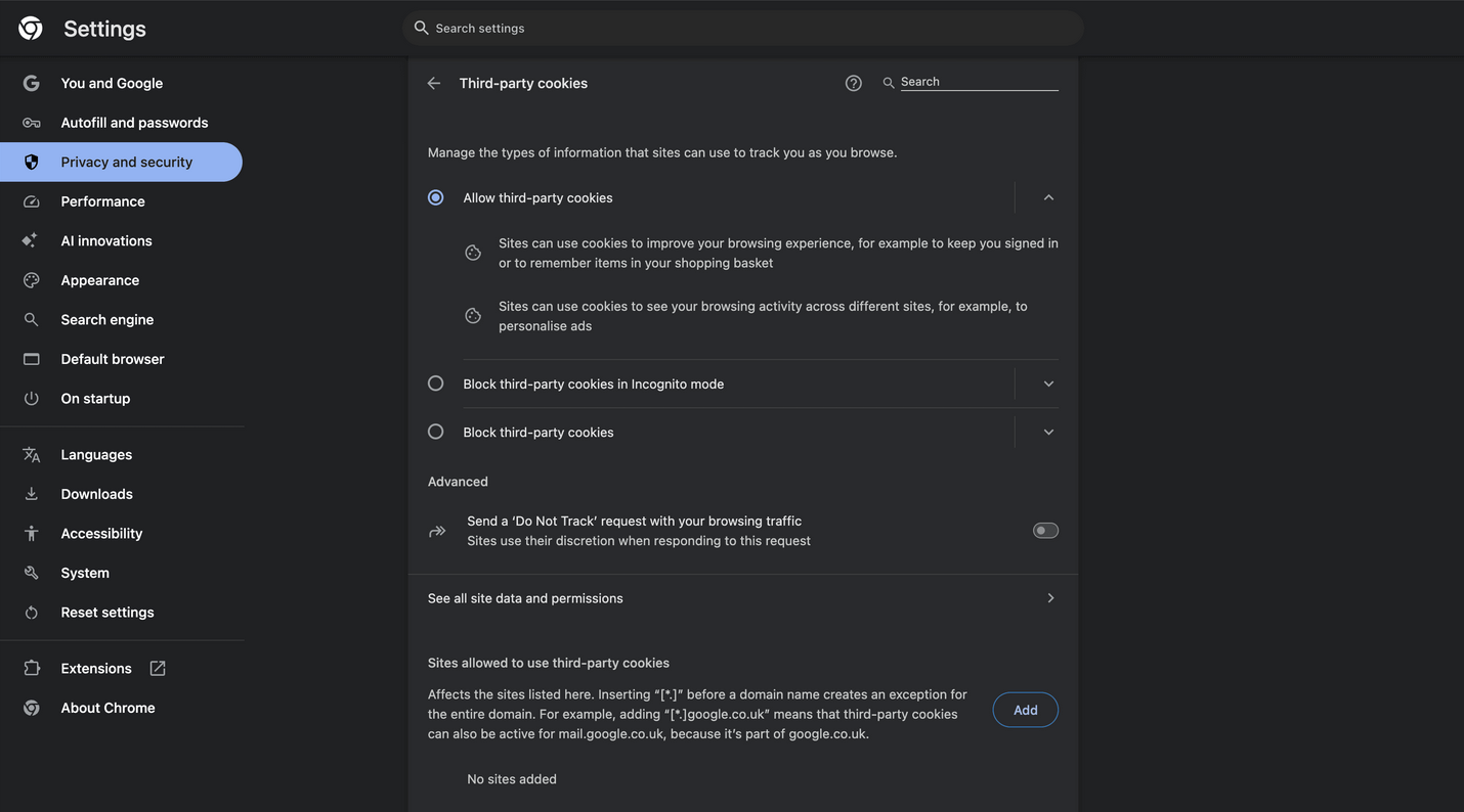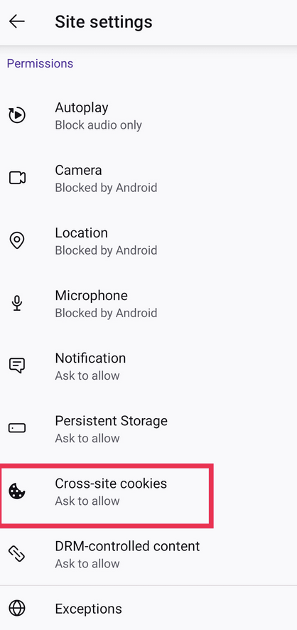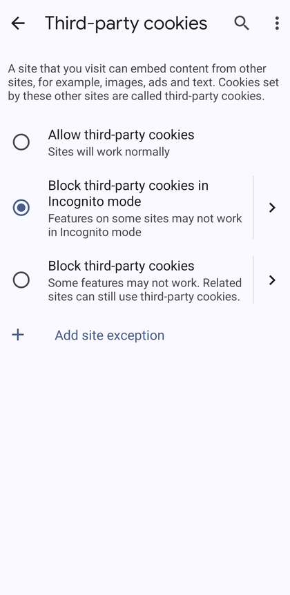 If you block third-party cookies, all third-party cookies from other sites are blocked unless the site is allowed on your exceptions list.