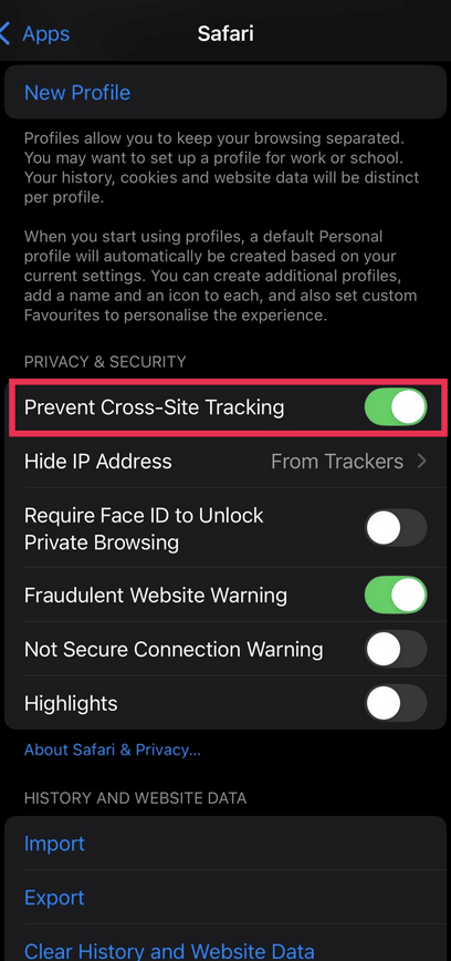 Enable Prevent Cross-Site Tracking under Privacy and Security to turn off cross-site tracking.