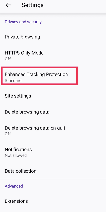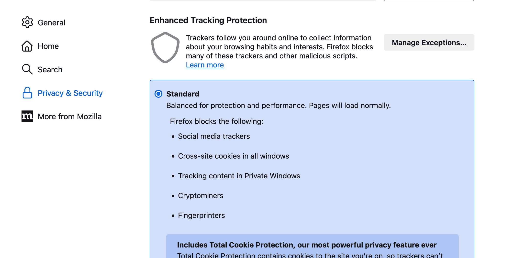 Under Privacy and Security, select Enhanced Tracking Protection.