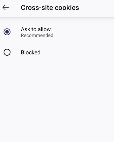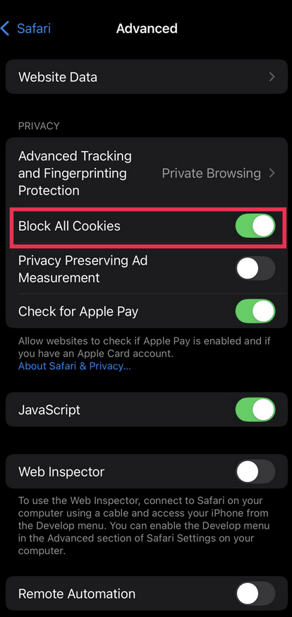 Turn on Block All Cookies to block cookies or leave it off to enable cookies.