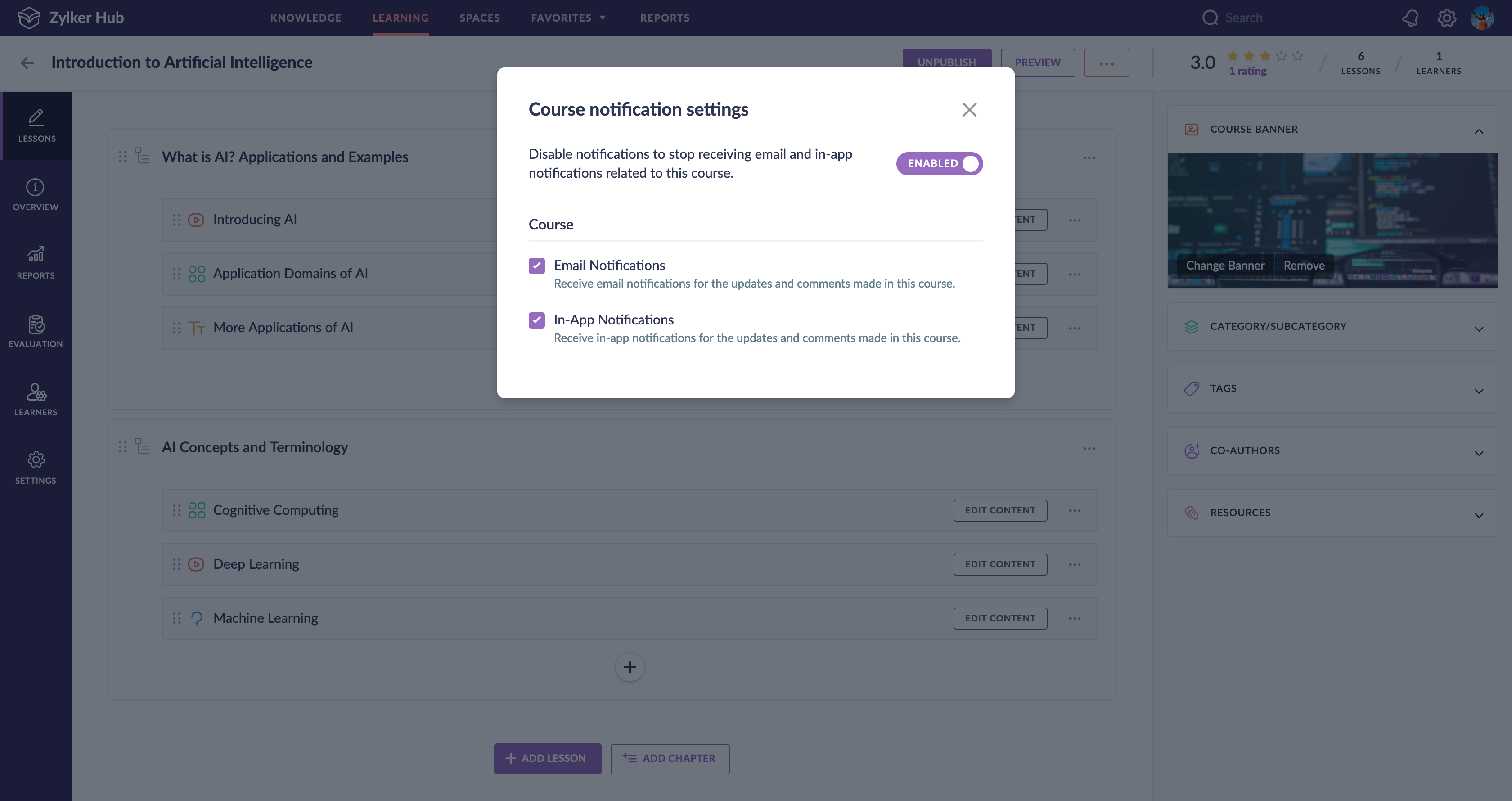 Choose to stop receiving email or in-app notifications for a particular course with notification settings. The notifications for a course will be enabled by default.