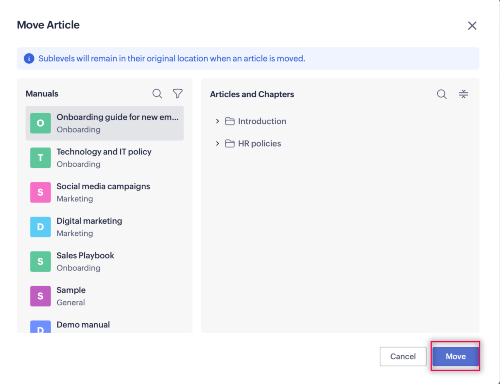 Select the space, manual, and chapter that you want to move the article to, and click Move.