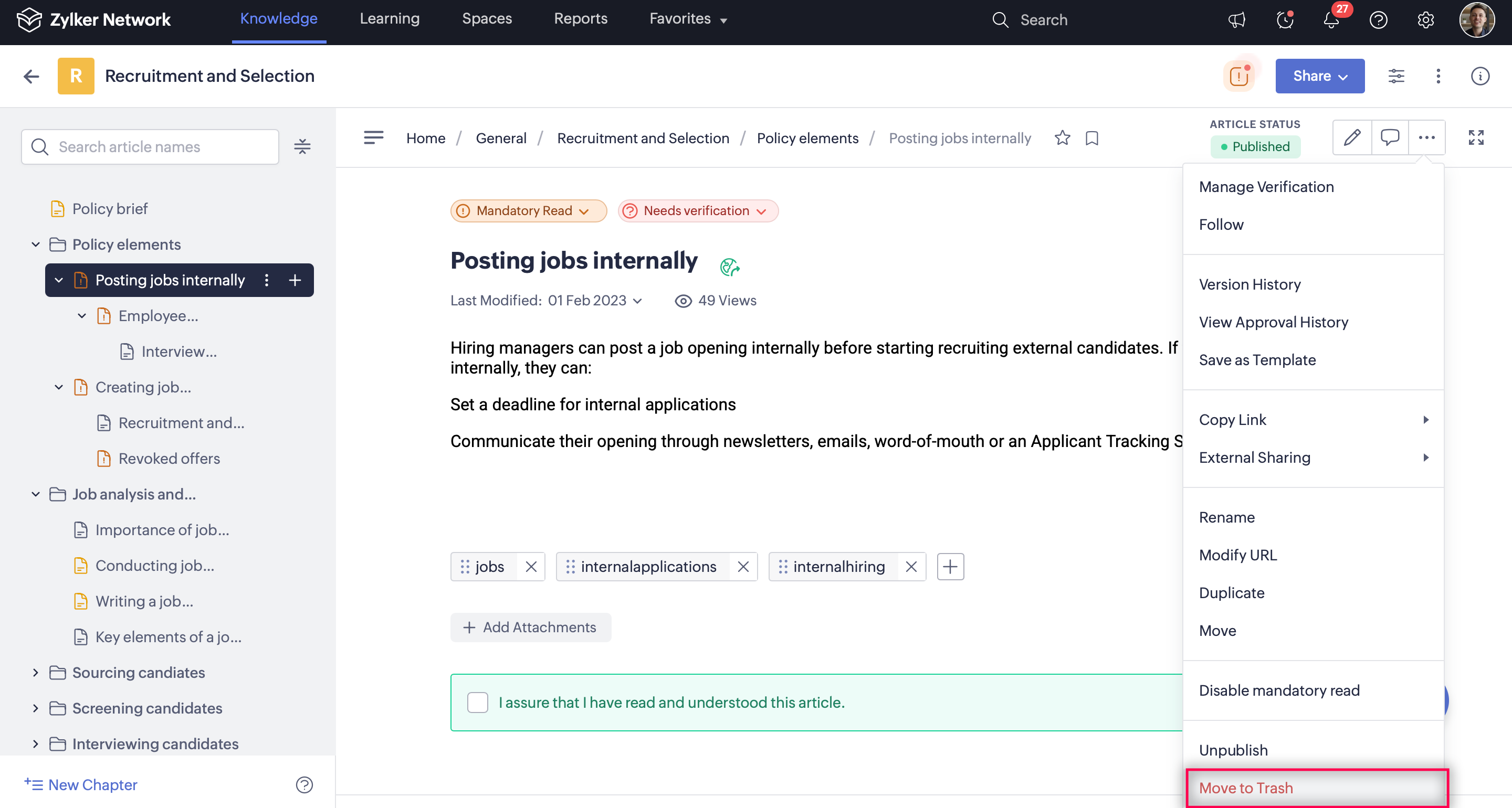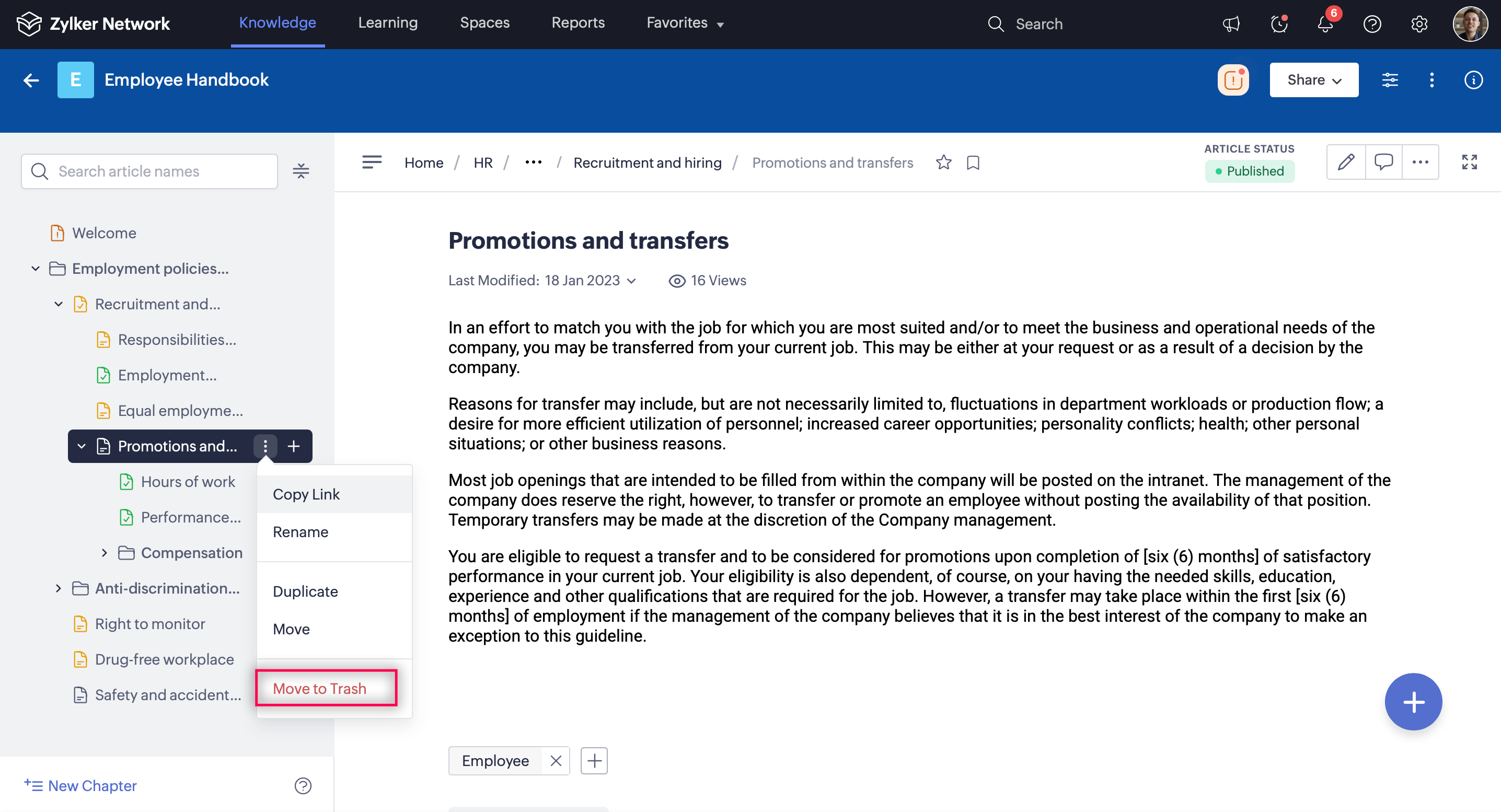 Moving an article to trash