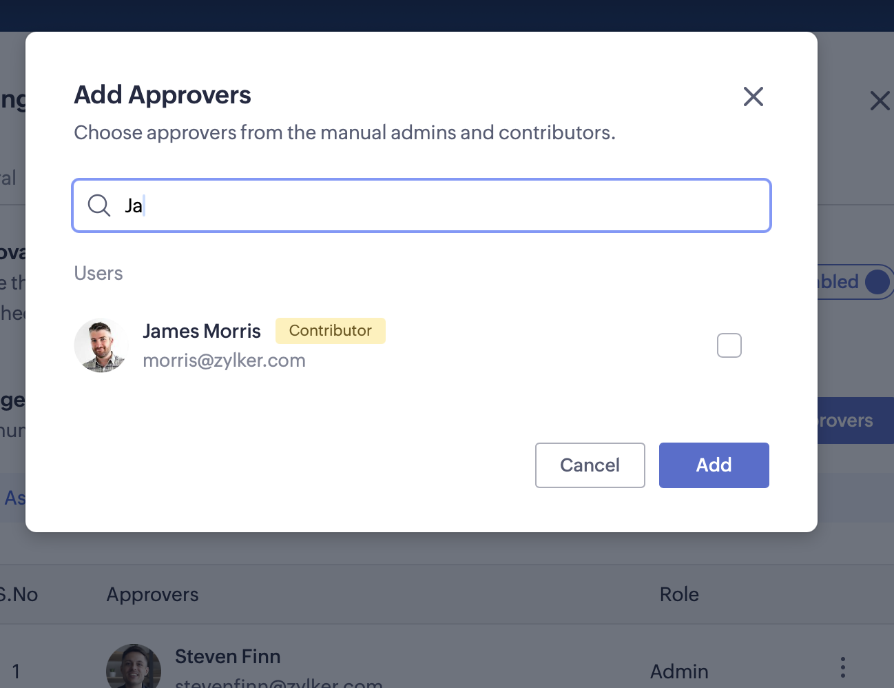 Type in the names or email addresses of the users whom you want to add as approvers and click Add.