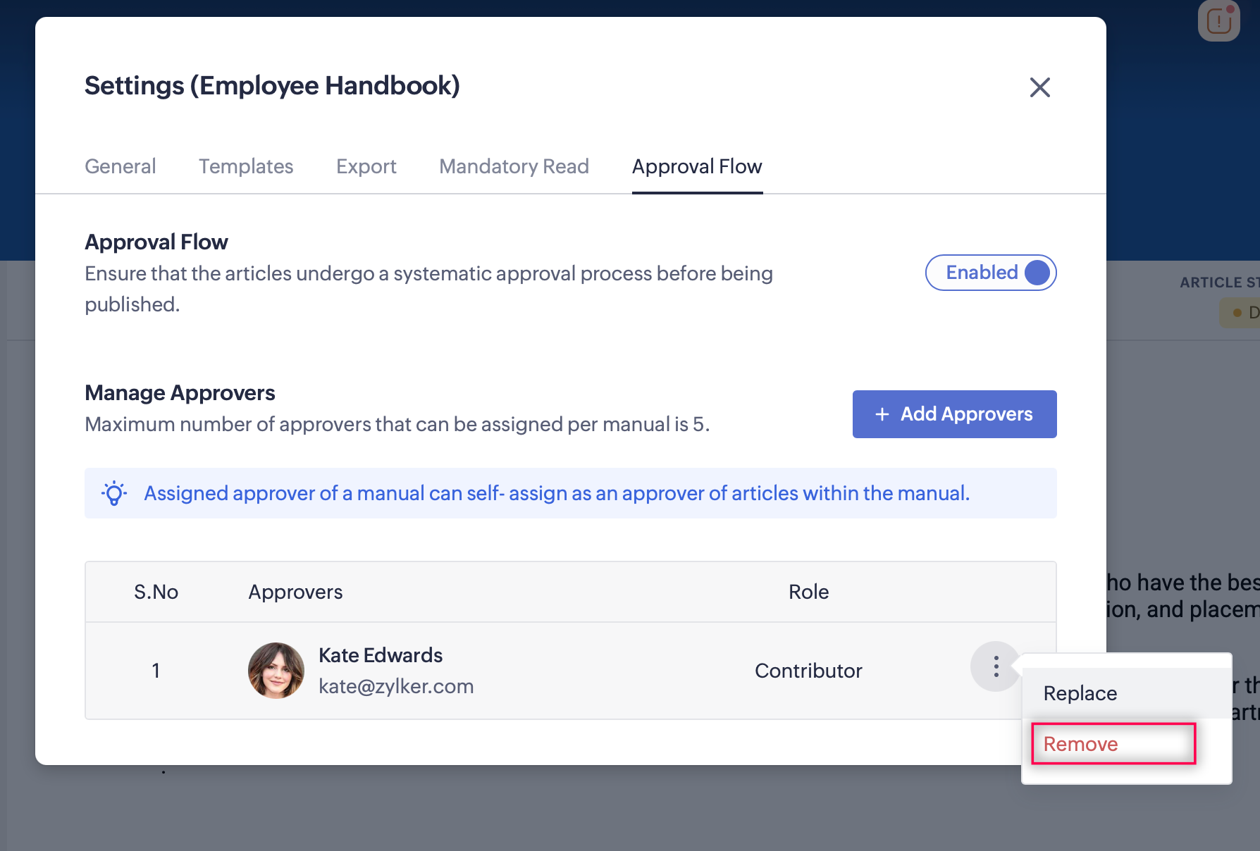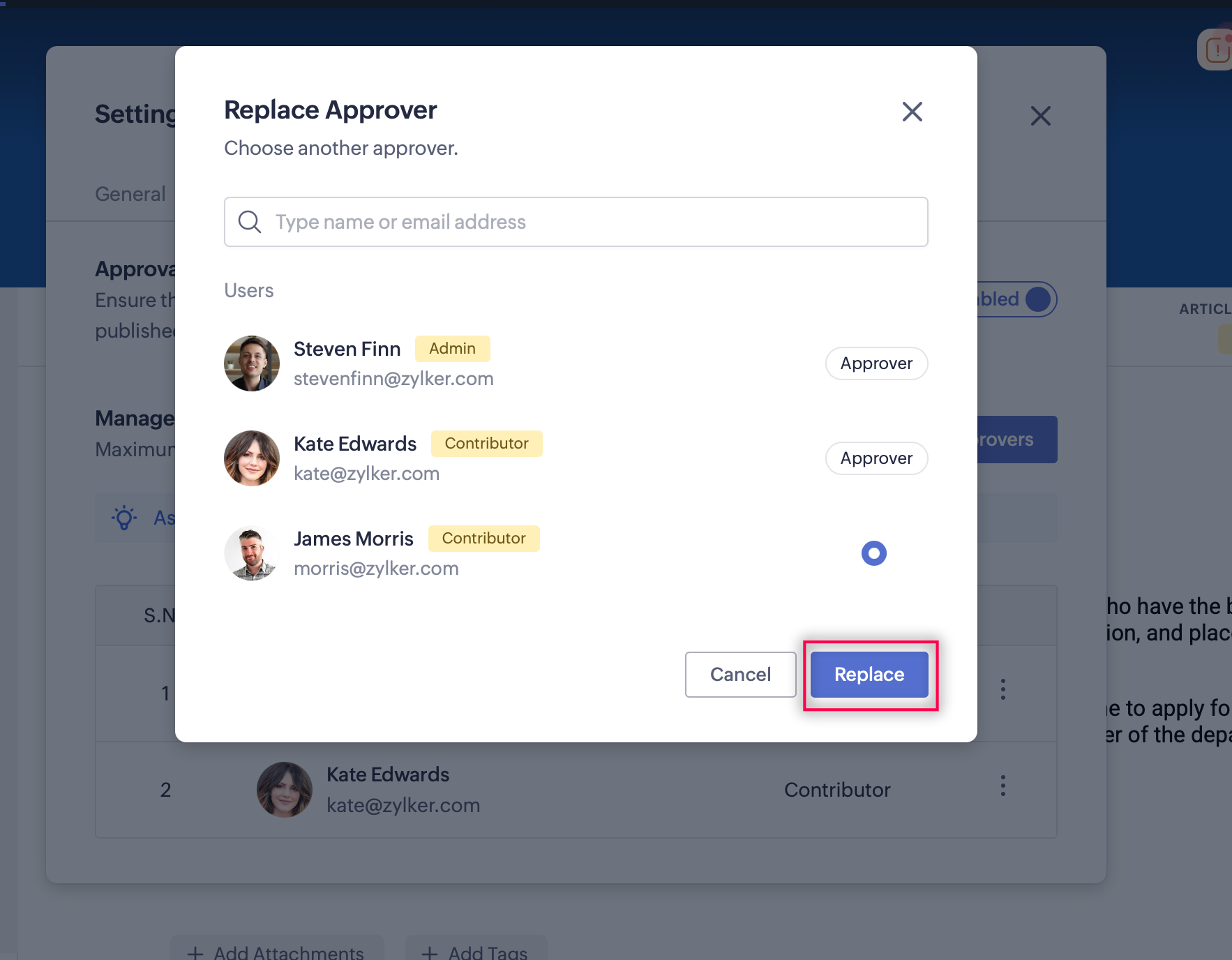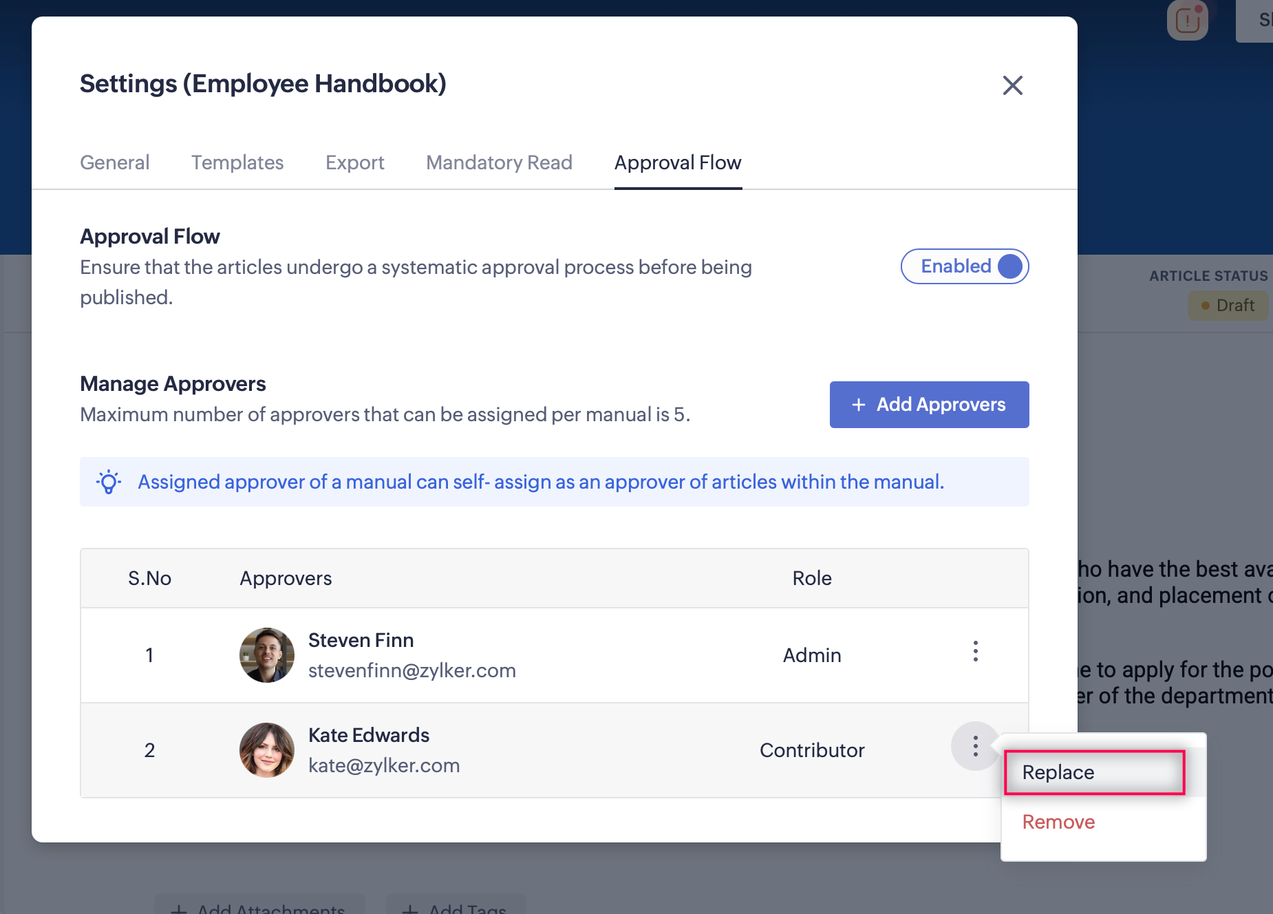 Replacing an approver can be considered when an assigned approver leaves the organization, takes extended leave, or there are changes in their roles and responsibilities. In such situations, another person may have to take up the role in order to ensure that the approval process runs smoothly. All the articles that were assigned to the previous approver will automatically be assigned to the new approver.