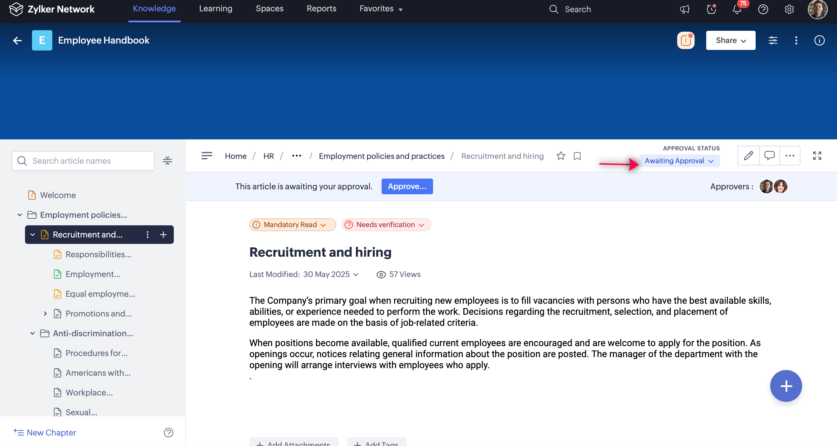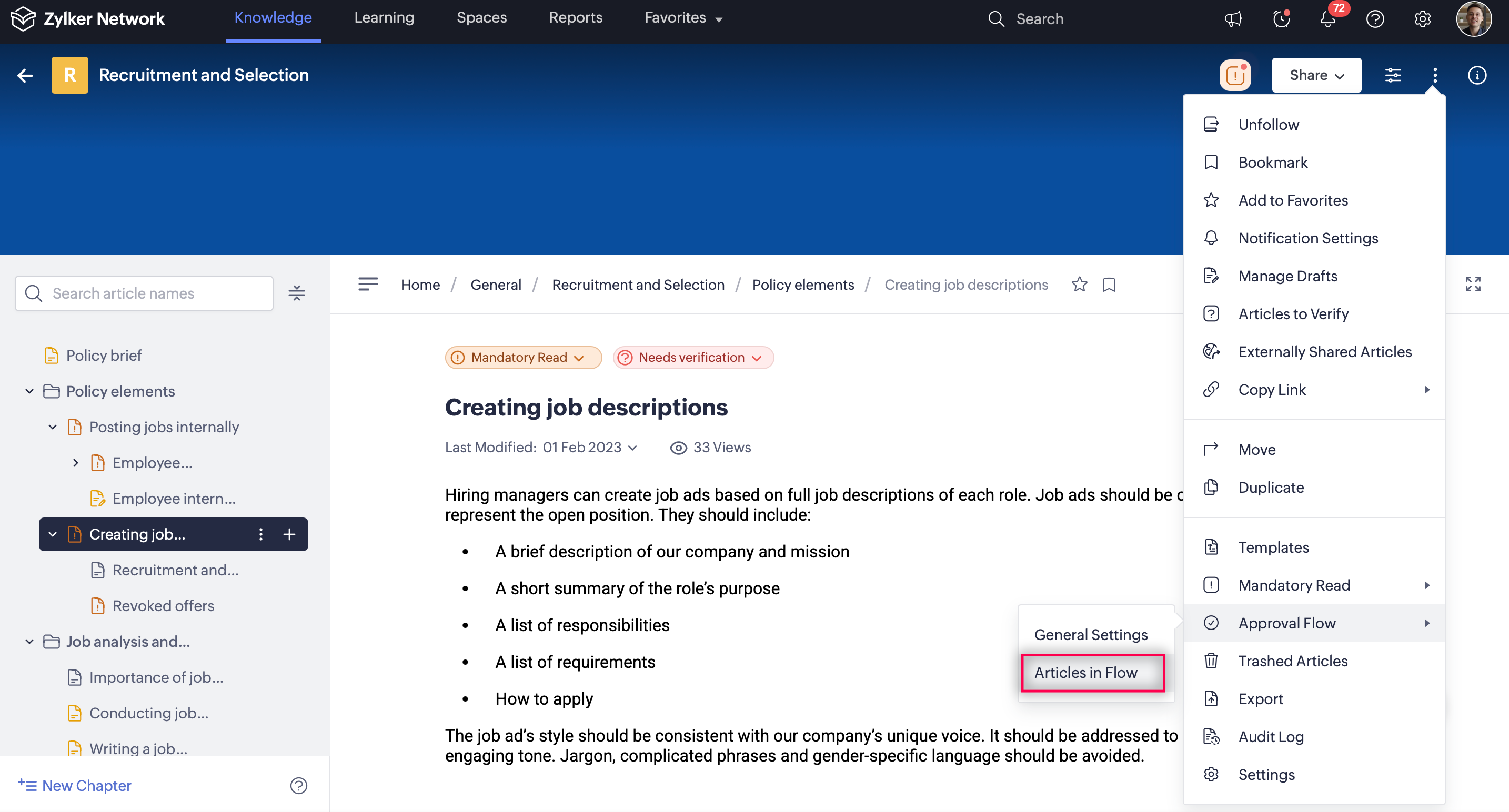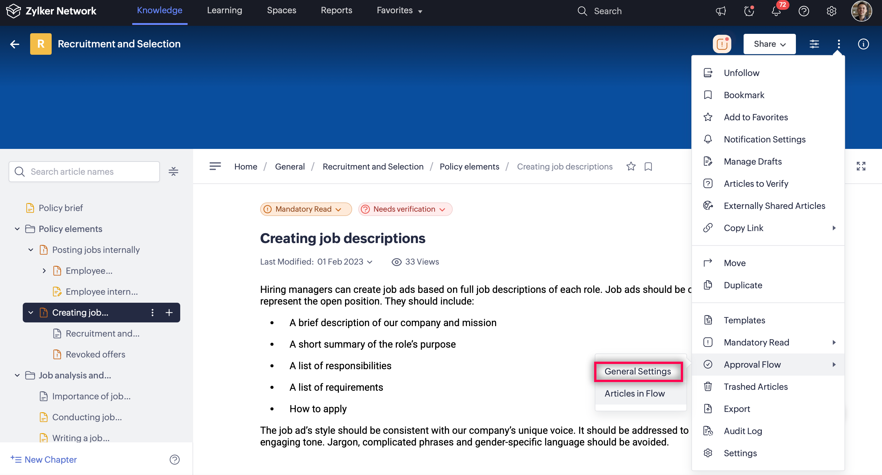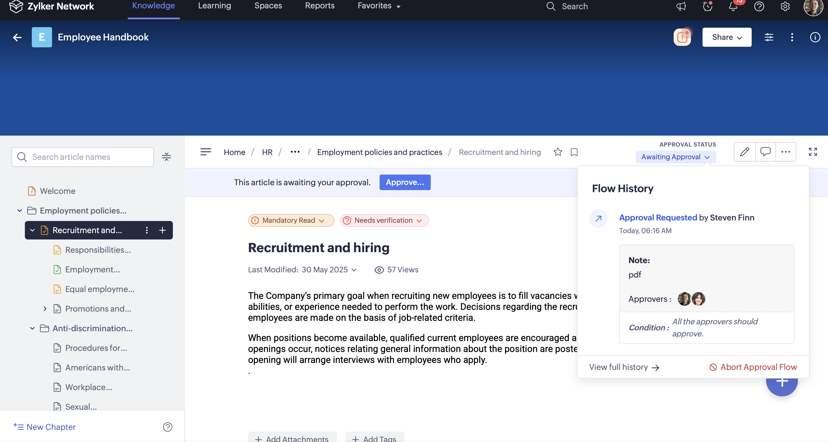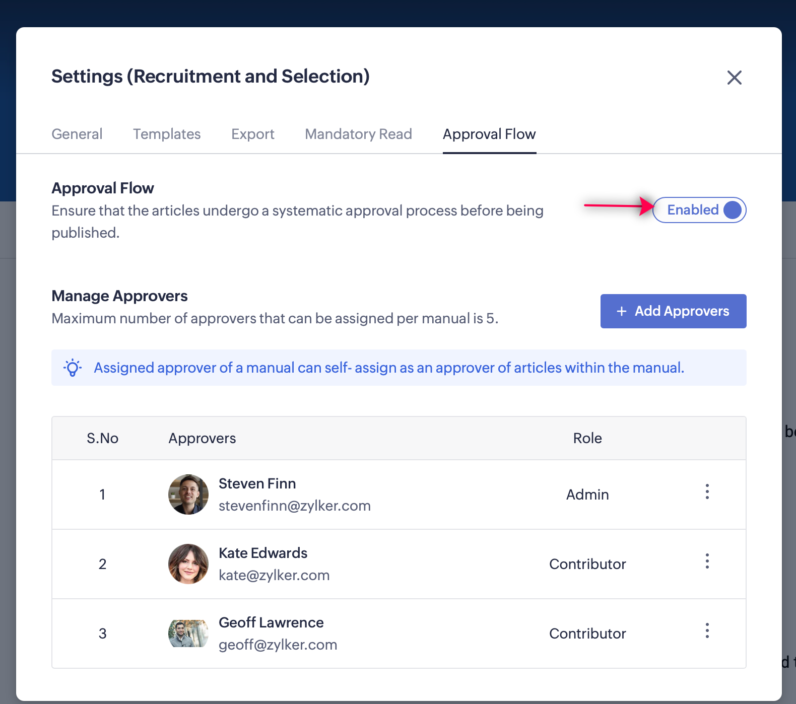 Start by enabling the approval flow at the manual level and then choosing the approvers. Once you've enabled Approval Flow for a particular manual, all the articles within the manual will have to undergo the approval flow process before getting published.
