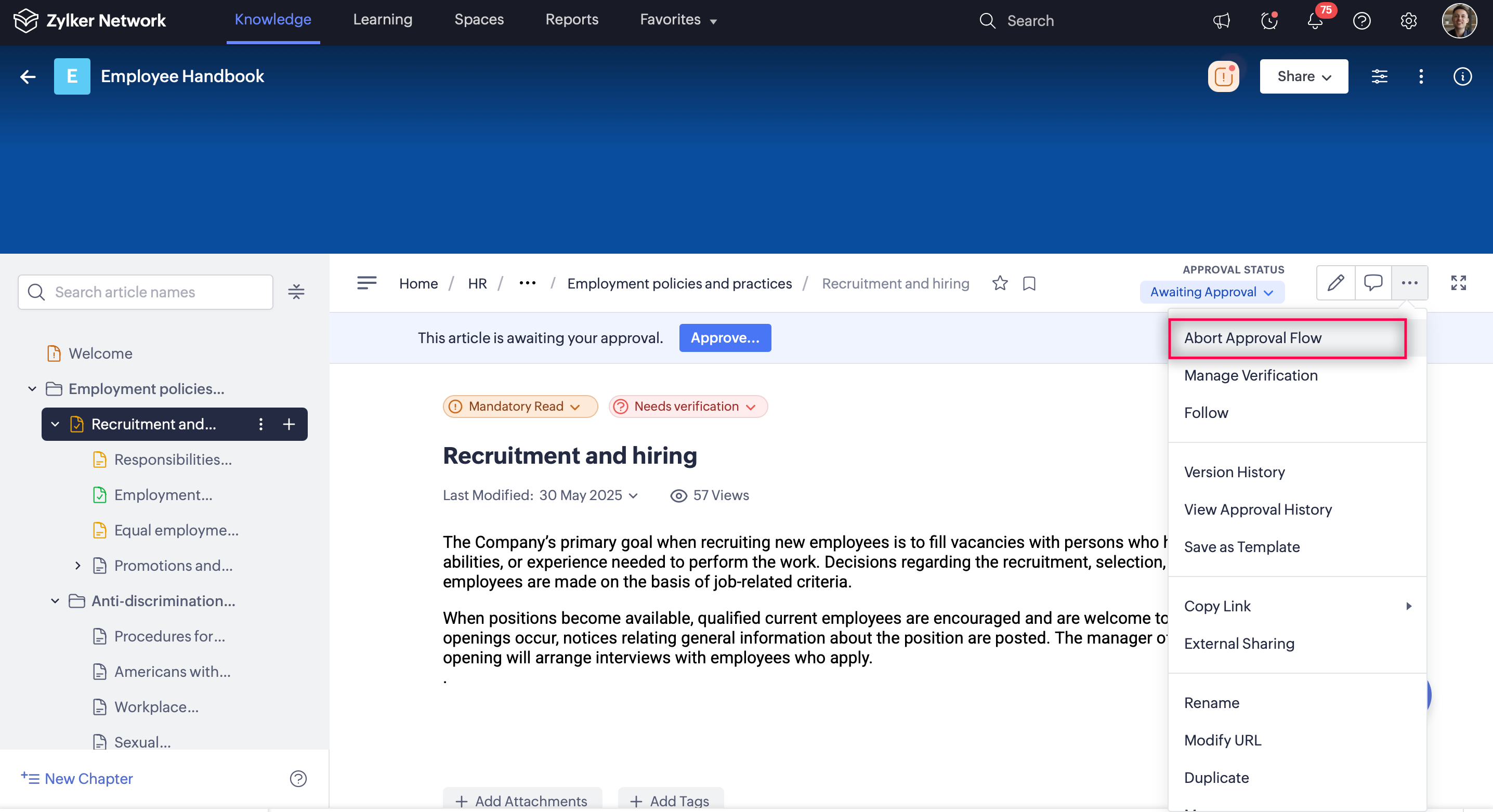 Aborting Article Approval will remove the article from the approval process. The status of the article will change to draft. In order to publish the article in the manual, the article will have to be resend for approval.