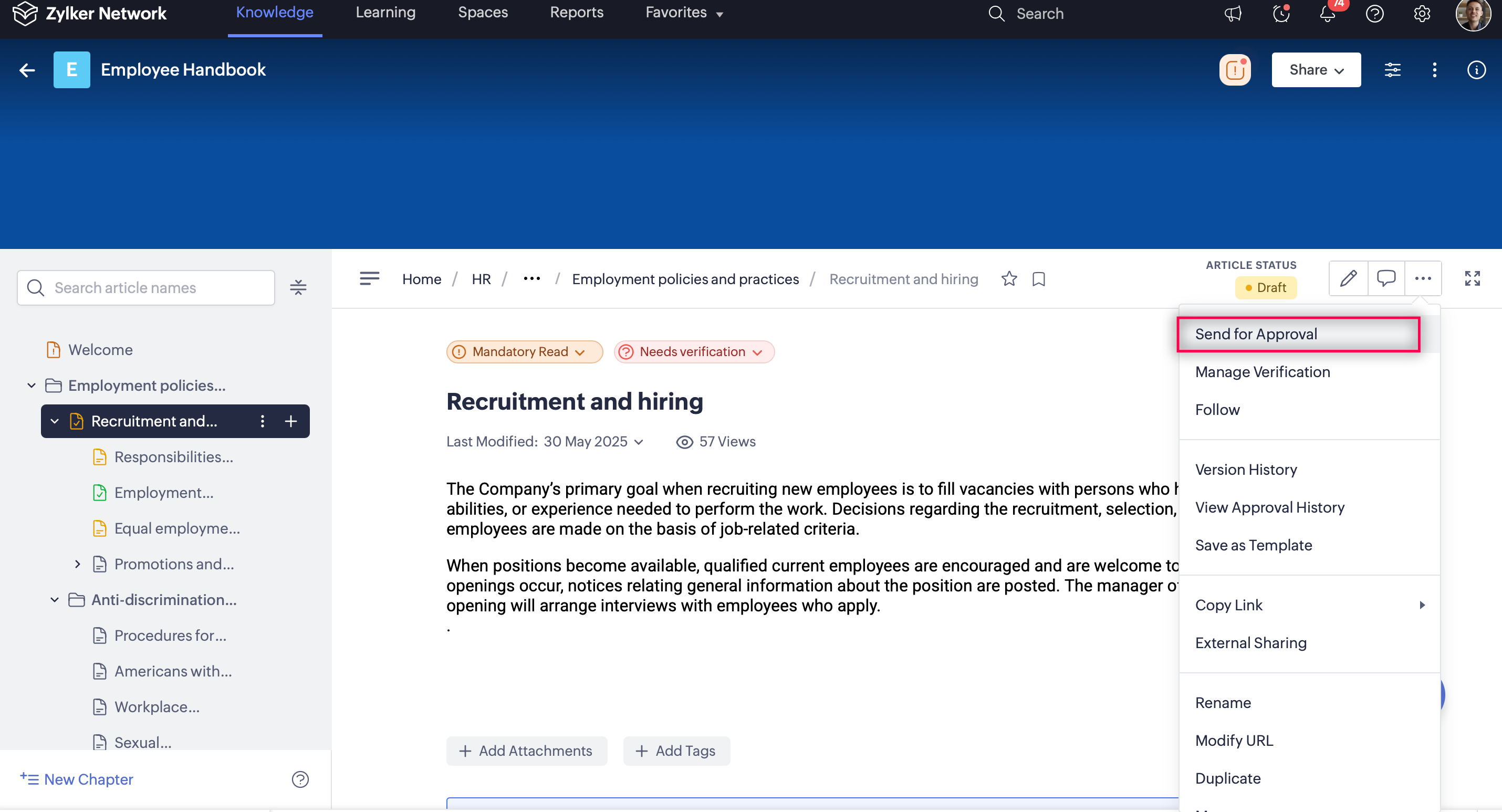 You can set up an approval process for articles within your knowledge base. You can assign specific manual admins or contributors as approvers and make sure articles within the manuals go through the approval flow before they get published.