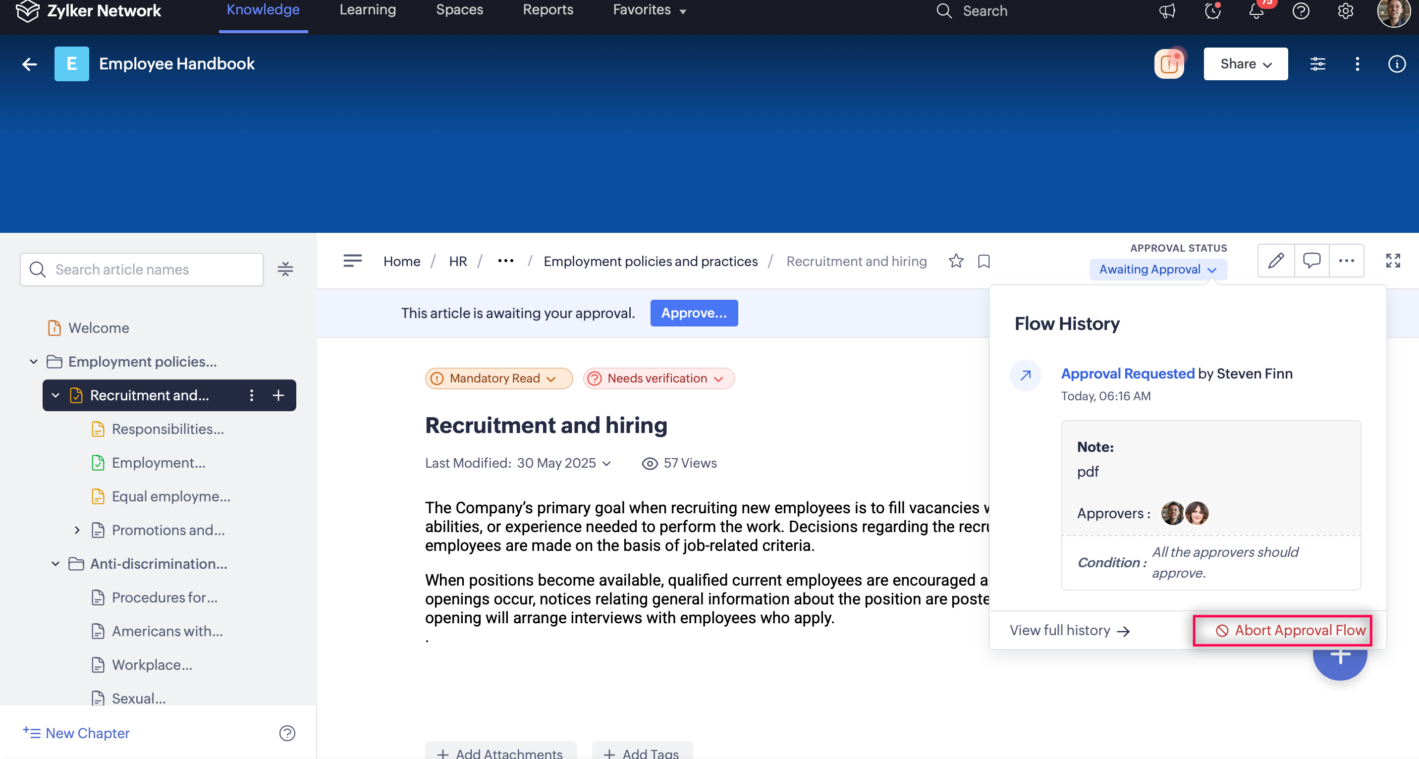 You can abort the approval if you find the content to be incomplete or incorrect or the approval was made by mistake.You can abort a running approval flow for an article by following any of the following methods.