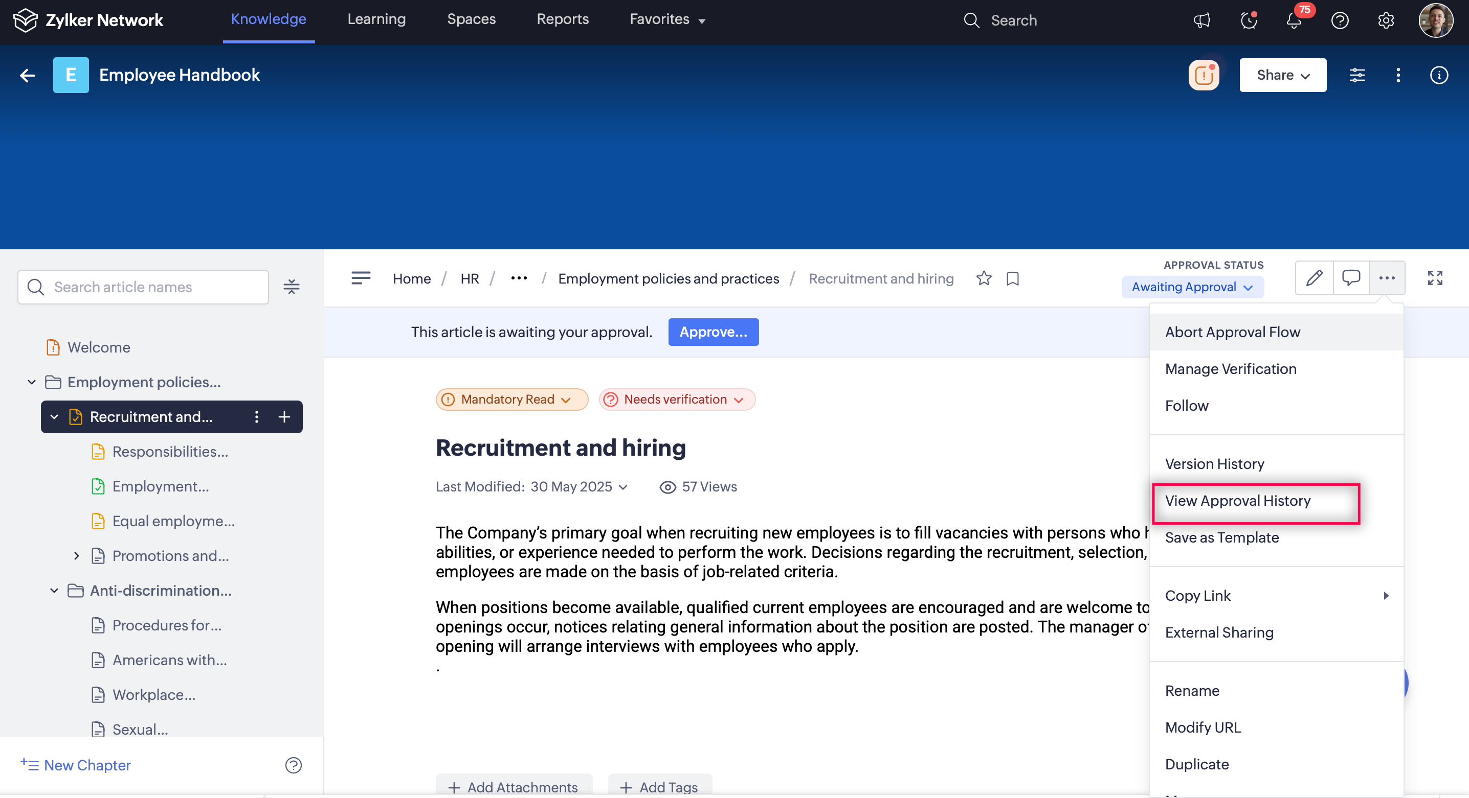 Article authors and approvers can view the latest and the detailed history of an article by following more than one way.