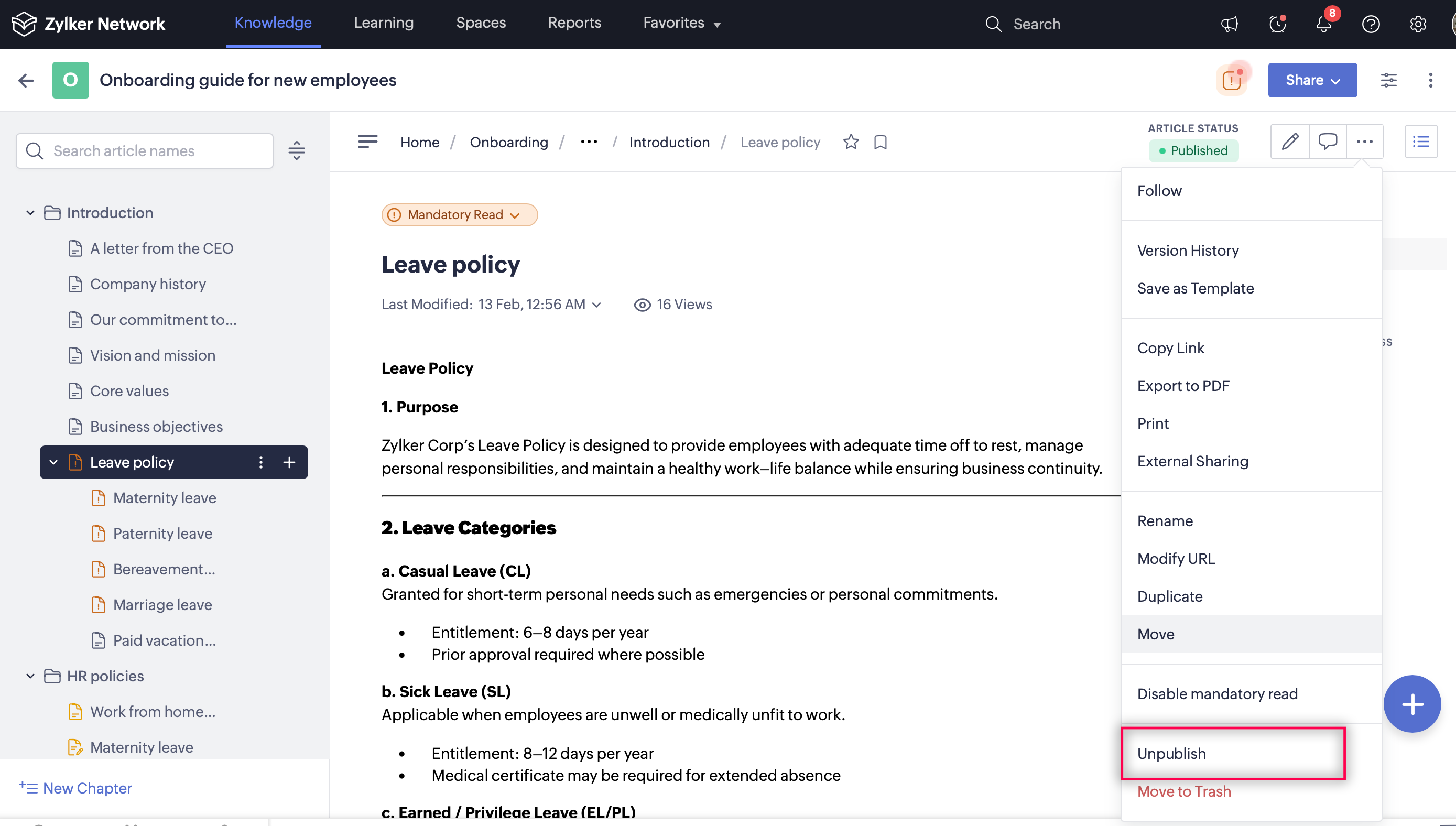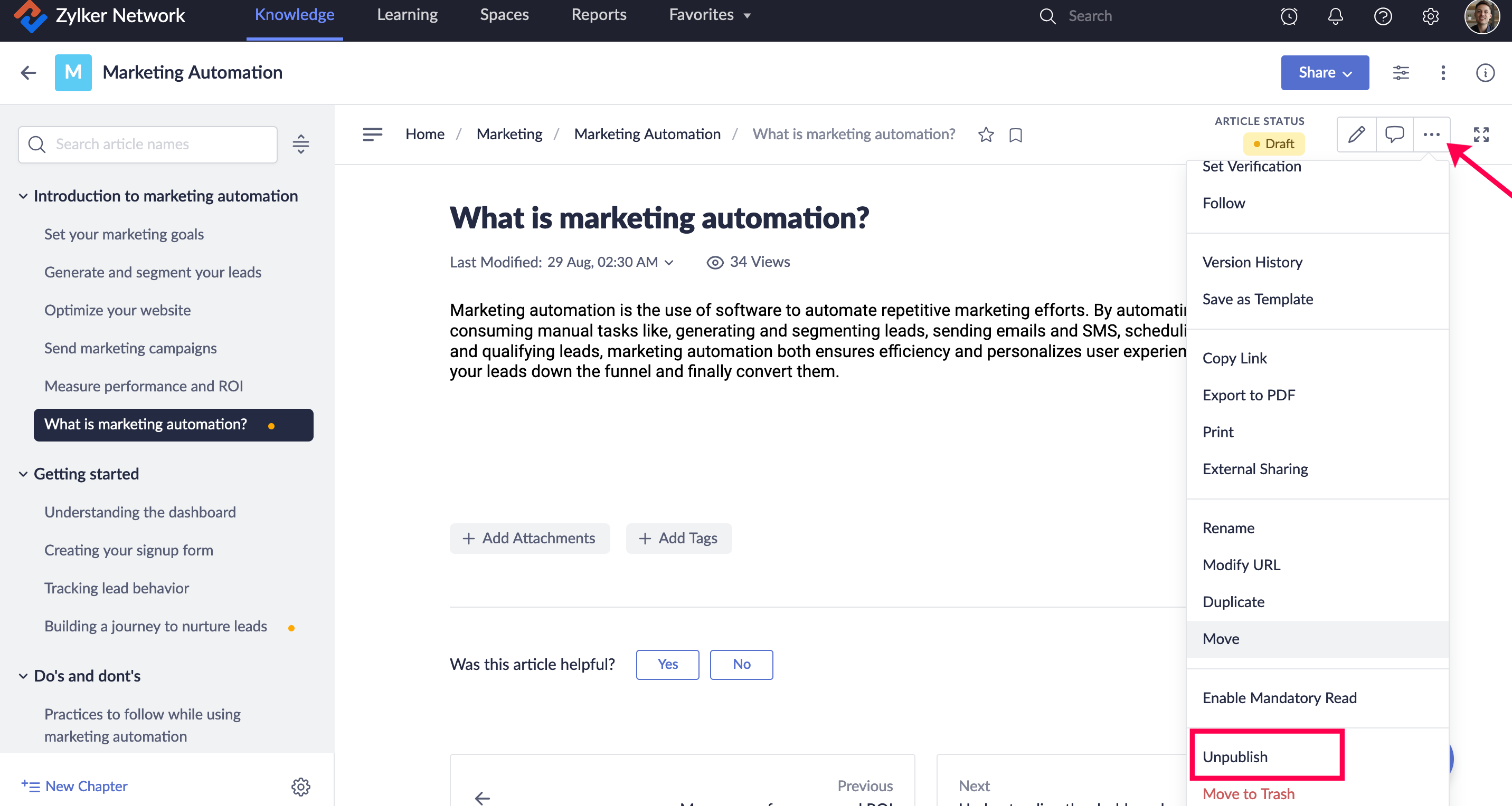 Click the More Options ( ) icon to the right of the article, then click Unpublish.