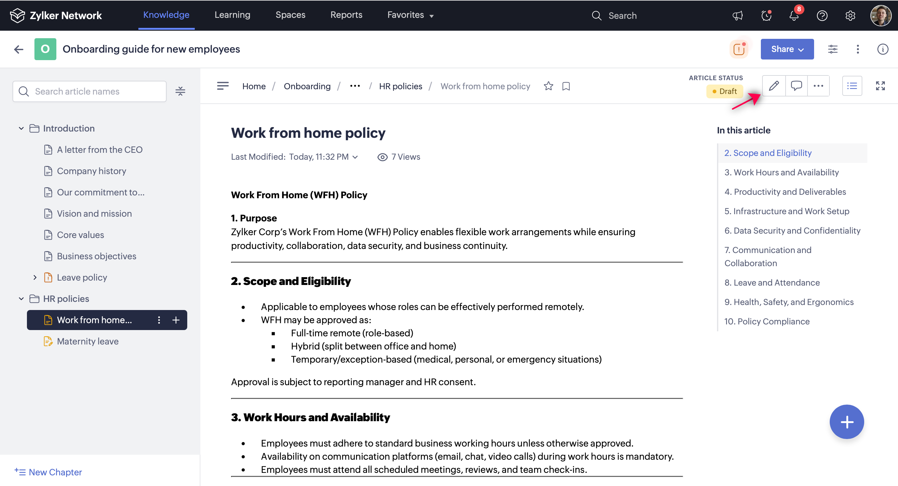You can choose to save the article that you have created as a draft. Articles in draft will be accessible only to contributors and admins of the manual.These articles will be visible to readers only after they are published.