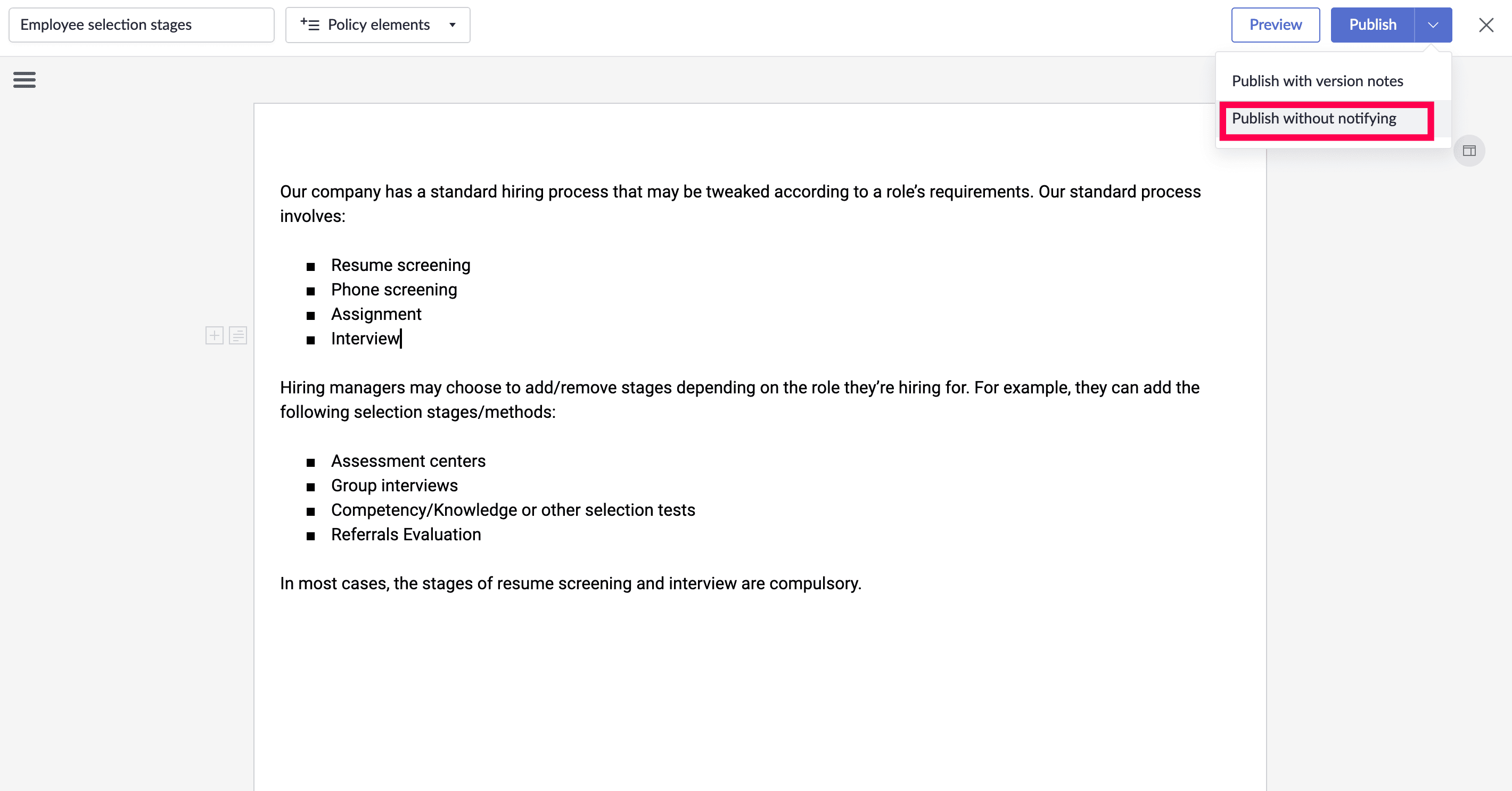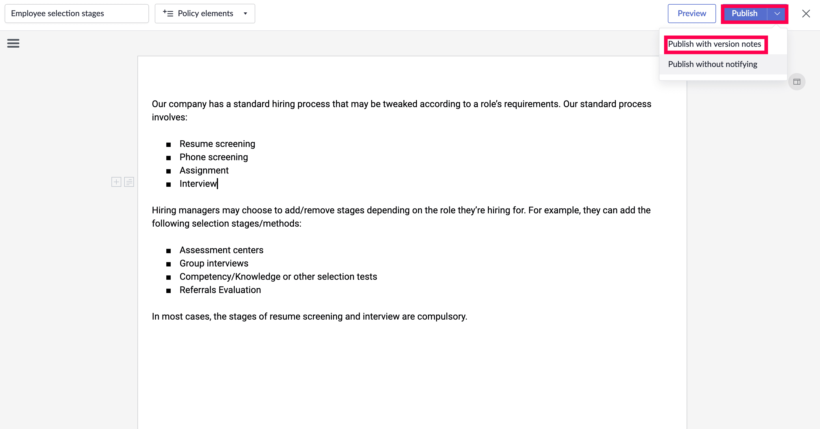 Select Publish at the top-right corner of the article, then select Publish with version notes to publish the article with notes.