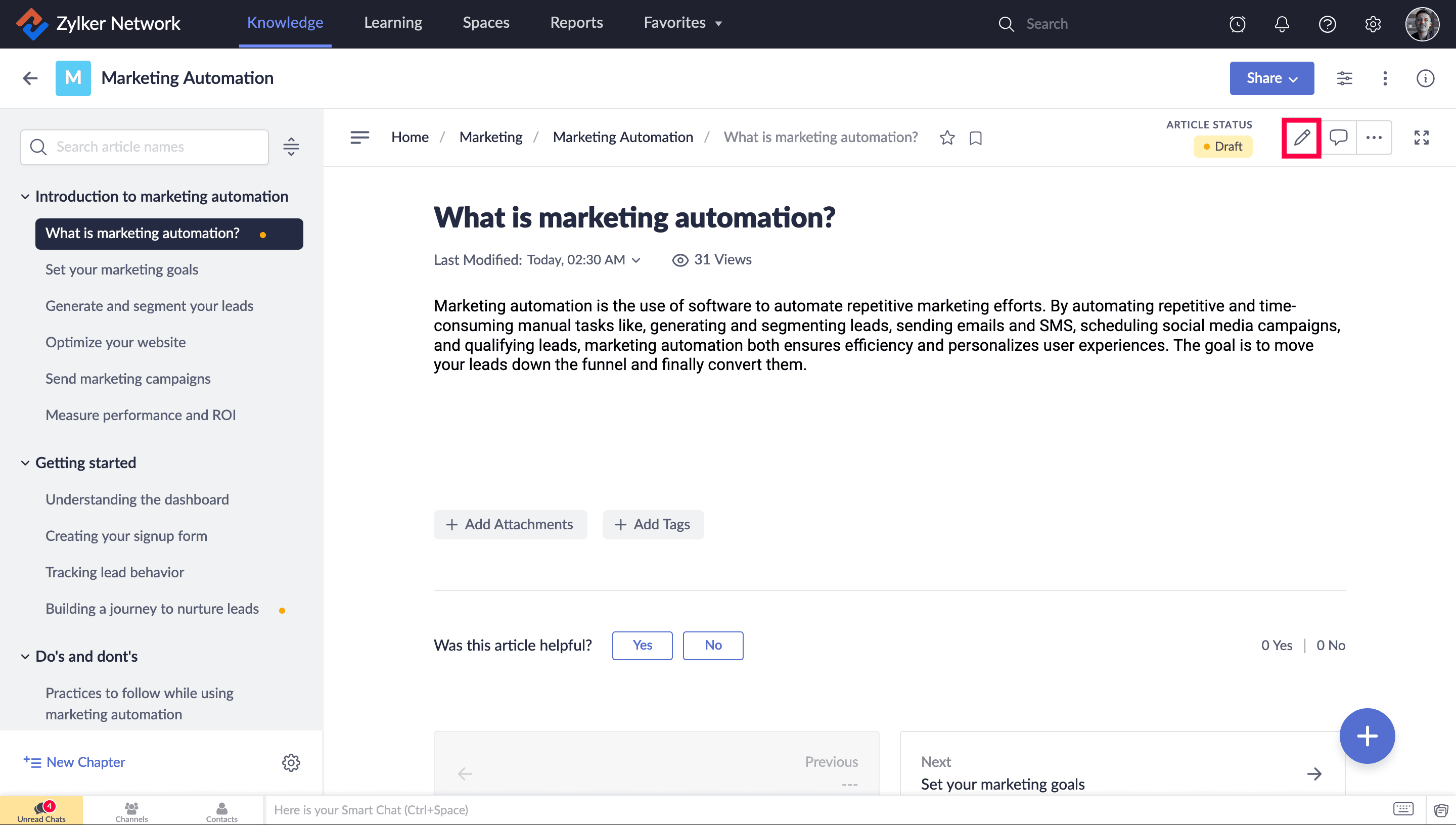 Navigate to the article and click the Edit () icon to the right of the article view.