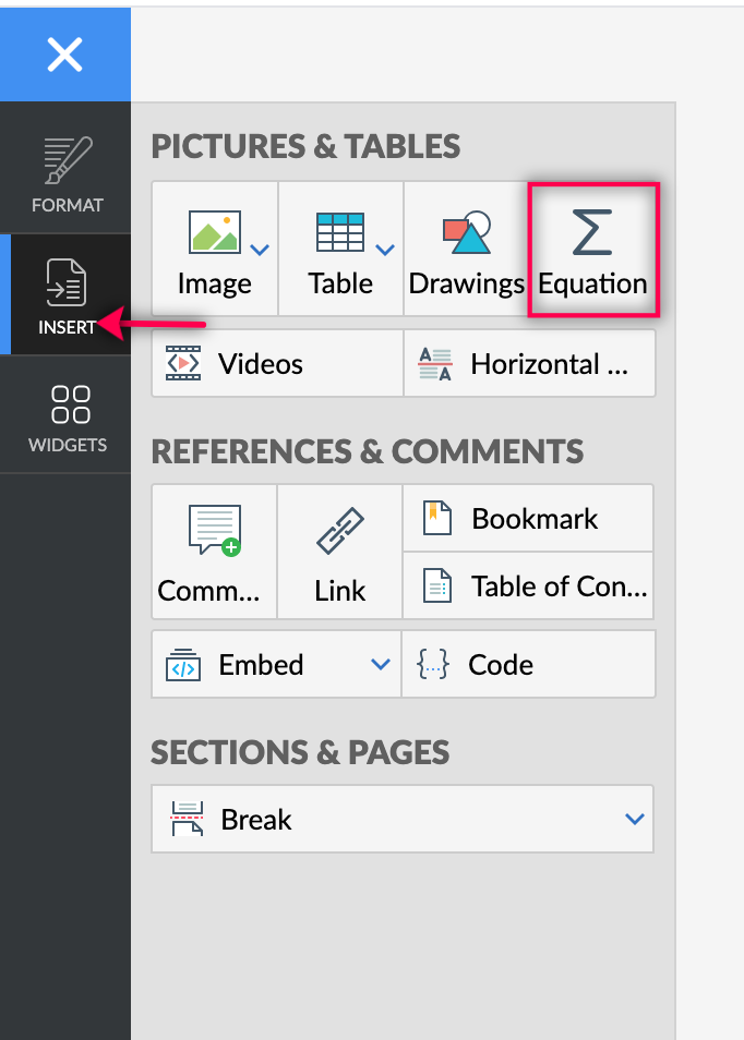 2. Go to the Insert tab and click Equations in the Pictures & Tables section.