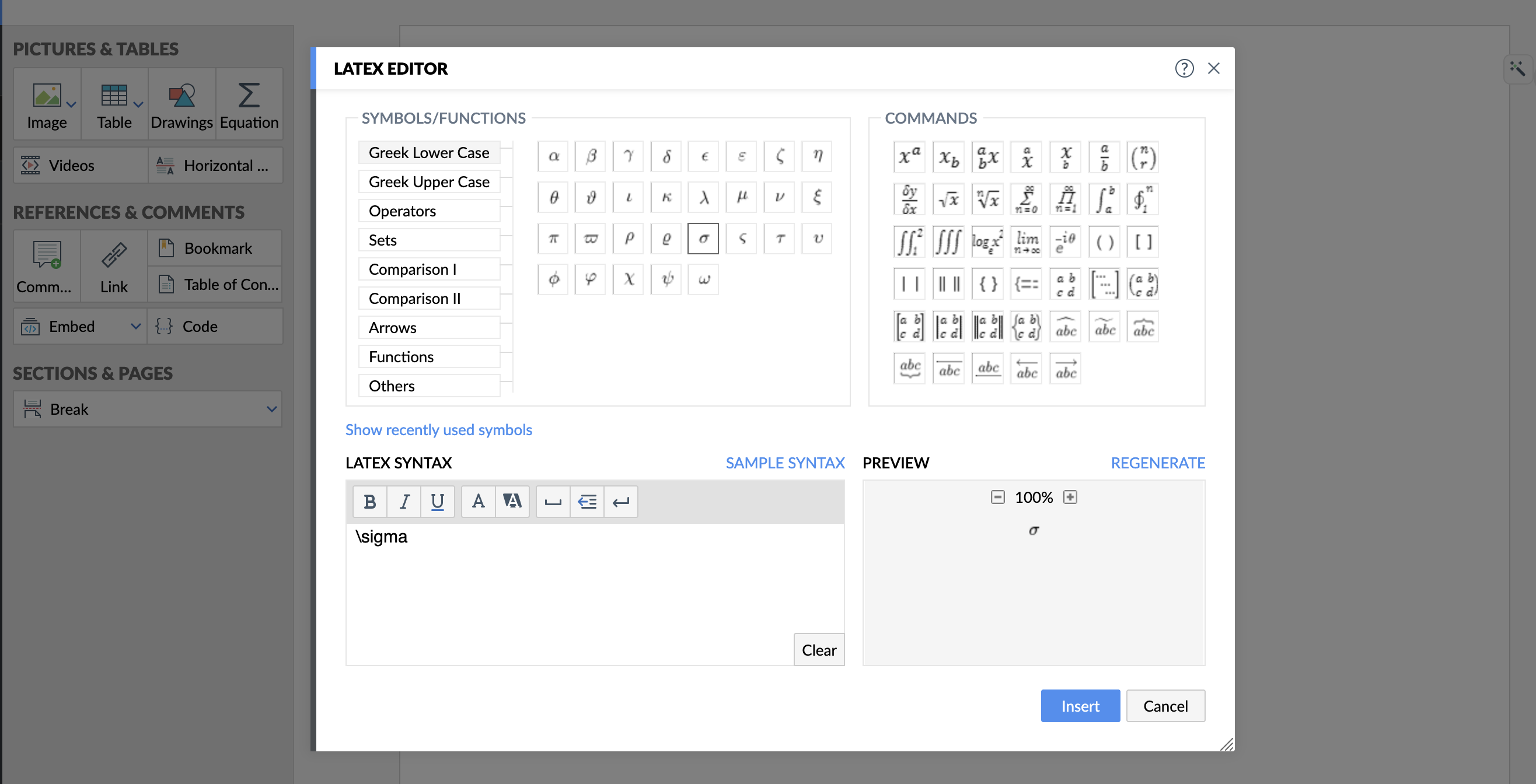 3. In the Latex editor, select the symbol from Symbols/Functions section and the commands from the Commands section.