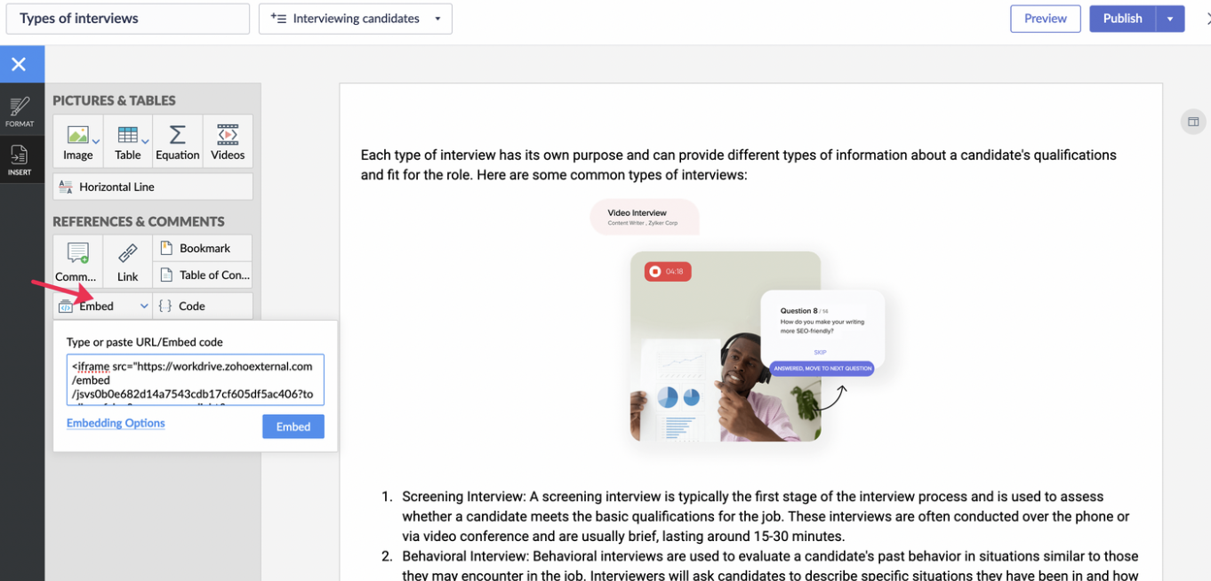 Select Insert and click Videos under the Picture and Tables section.