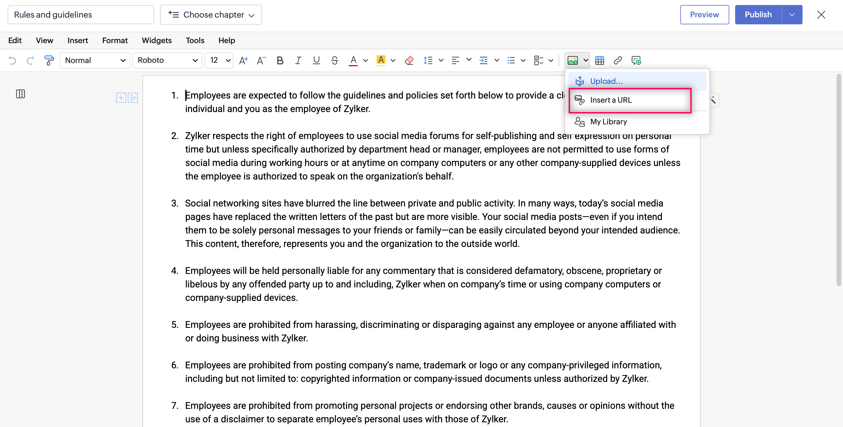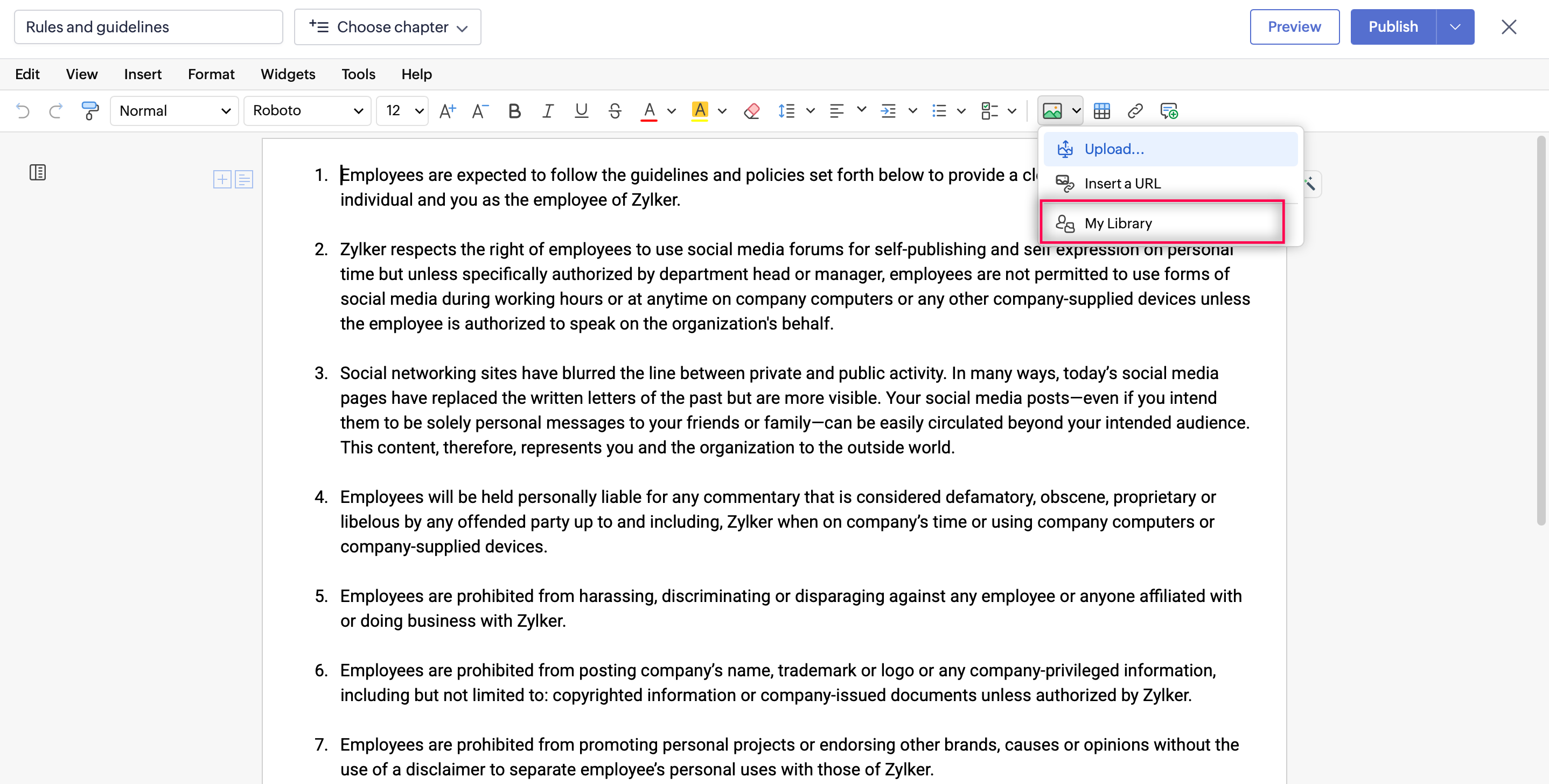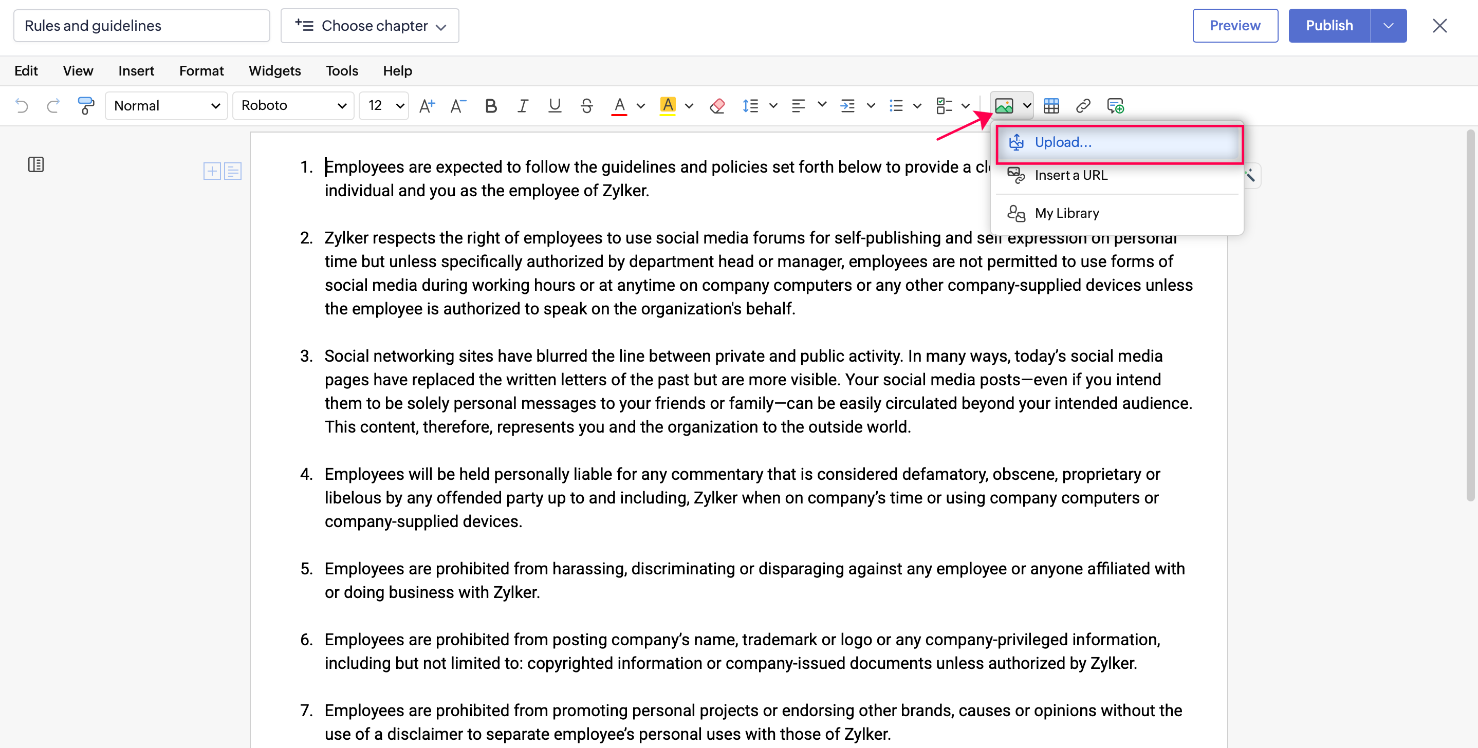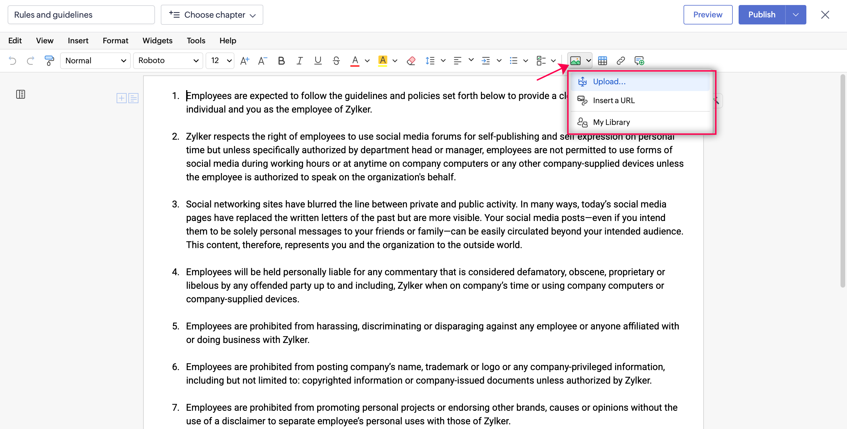 In Zoho Learn, you can insert images using the following options: