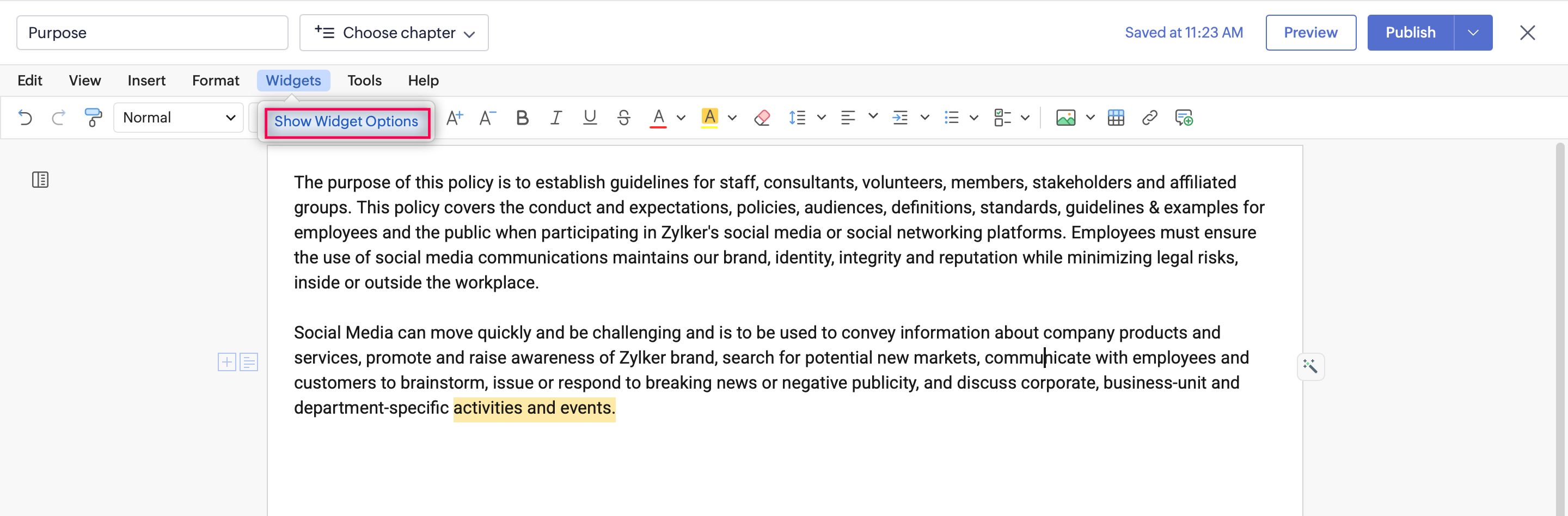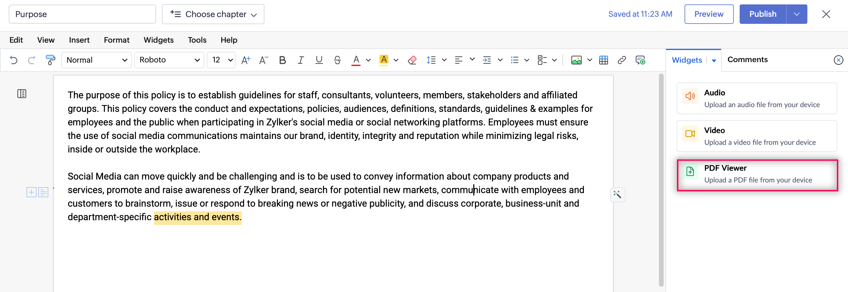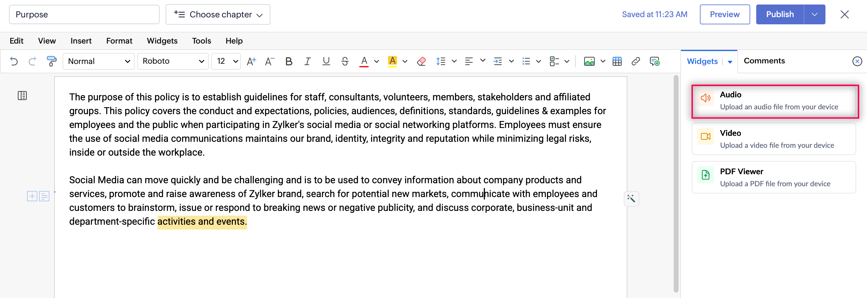 Zoho Learn's Widgets feature allows you to enhance your articles by embedding audio, video, and PDF files directly from your device. You can adjust the size and dimensions of the widget, making your content more interactive and engaging for your readers.