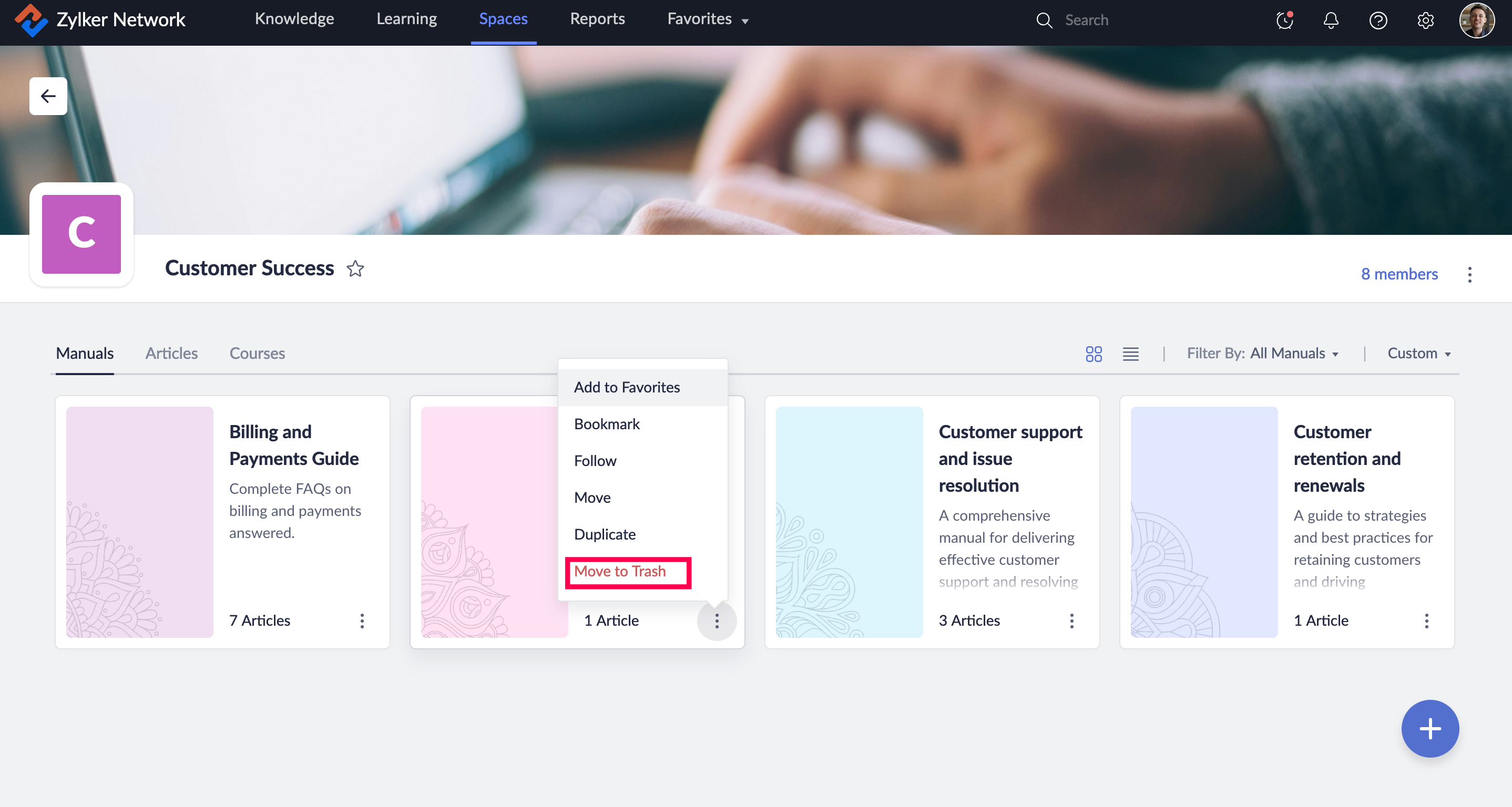 The manuals inside a space that are moved to trash will be available under Trashed Manuals within the space. The admins of the space or hub can restore or delete the manual permanently. If no action is performed, these manuals will be automatically ...