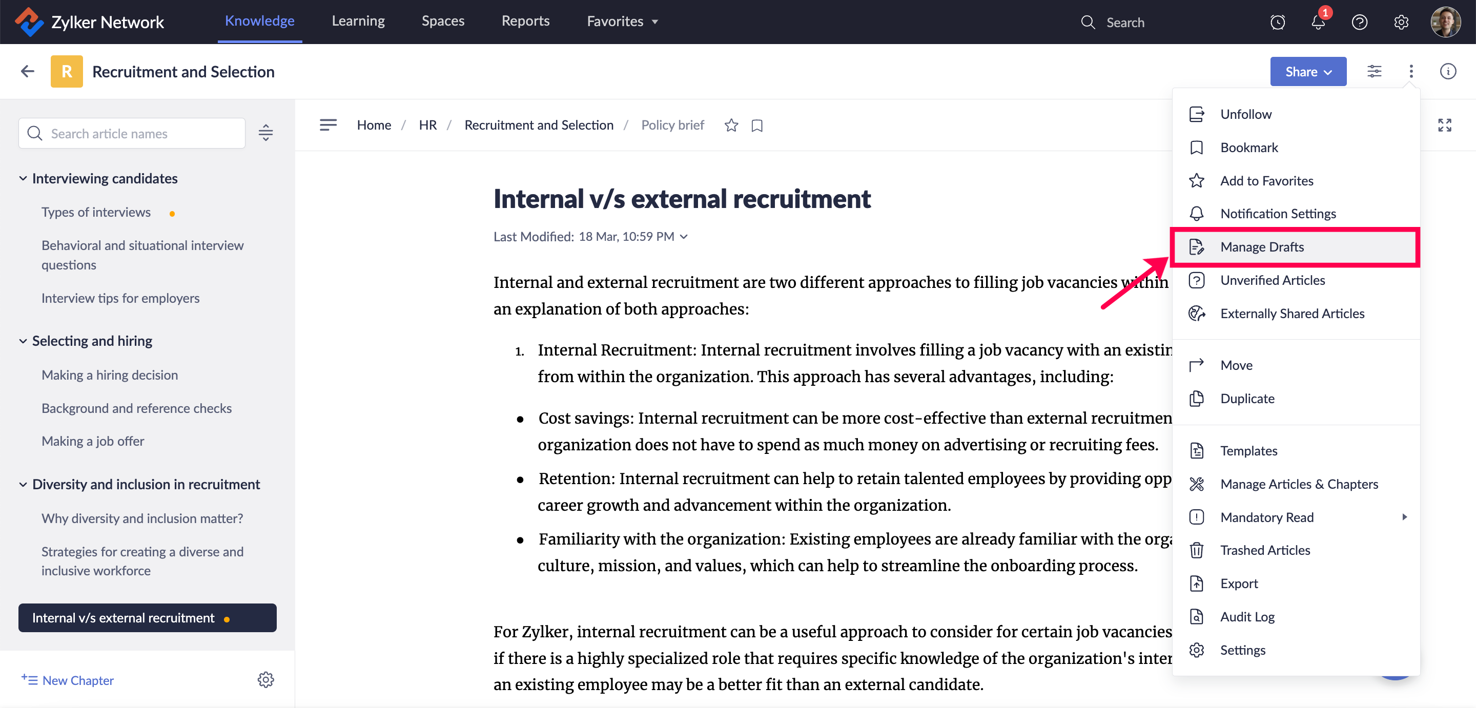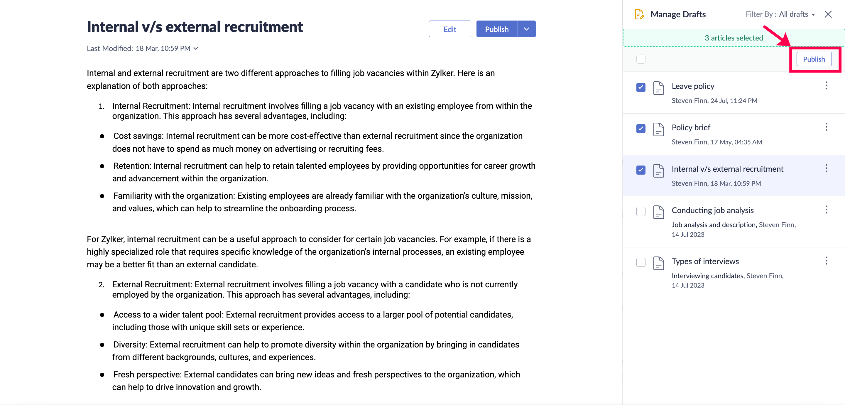 The contributors and admin of a manual can view the list of drafts in the manual. This gives a consolidated list of all the draft articles inside a manual.