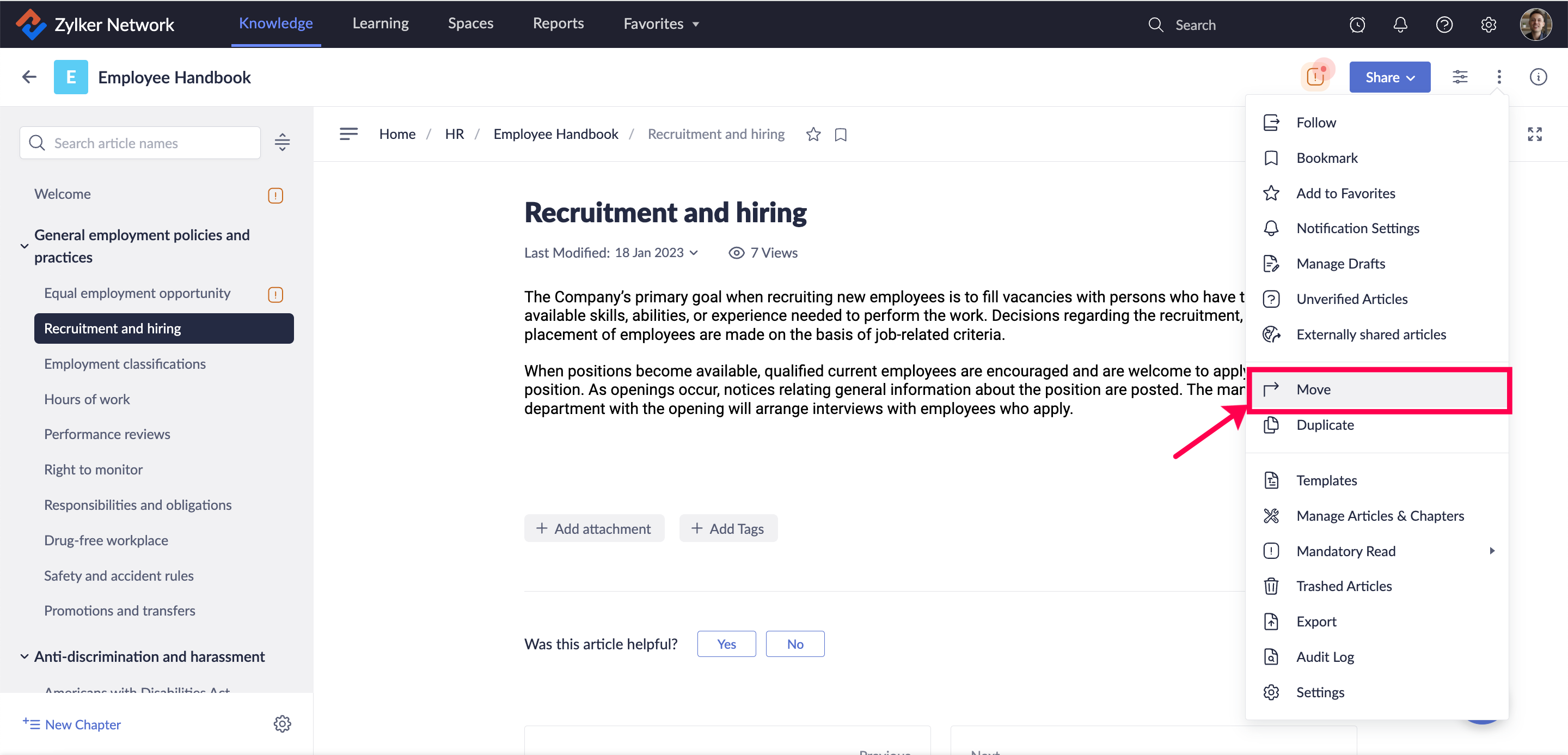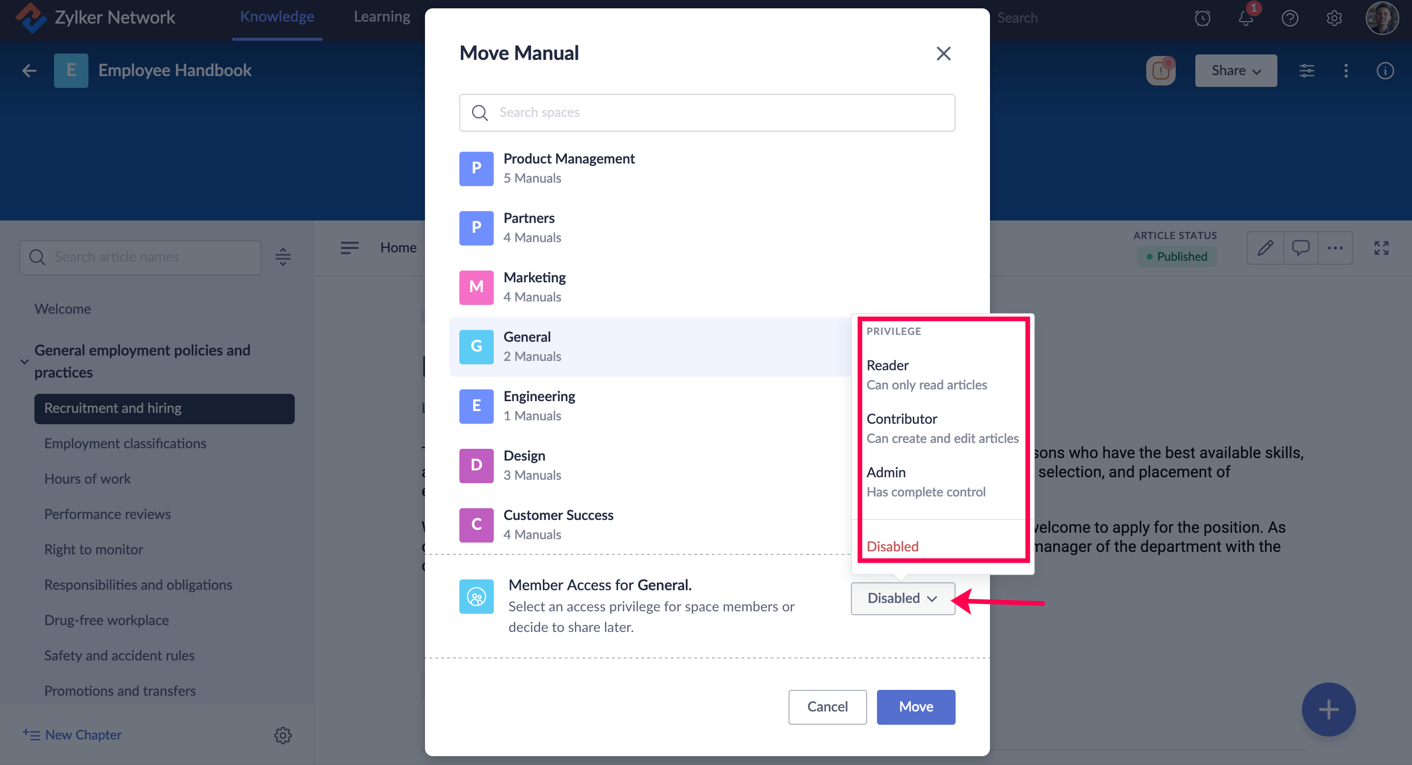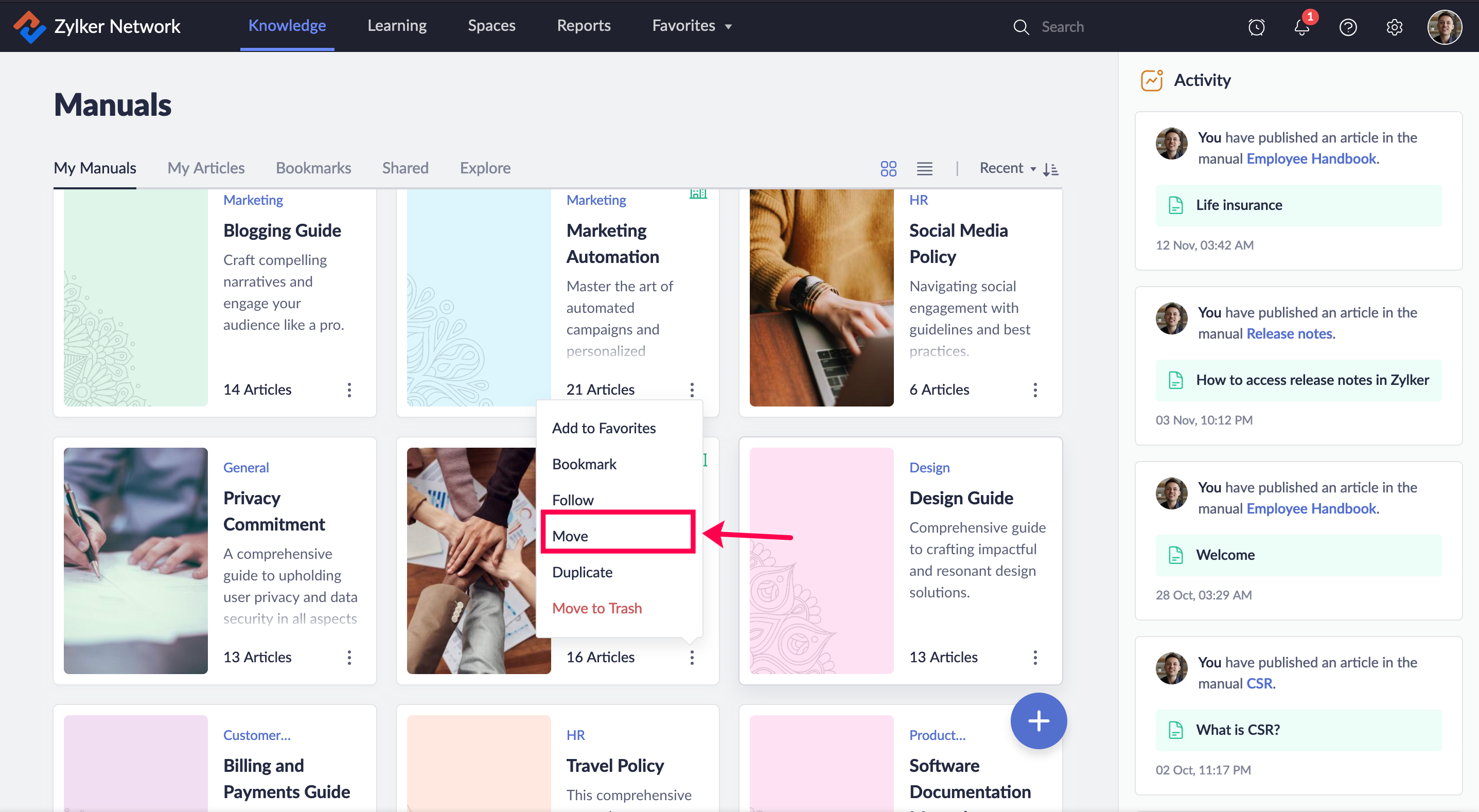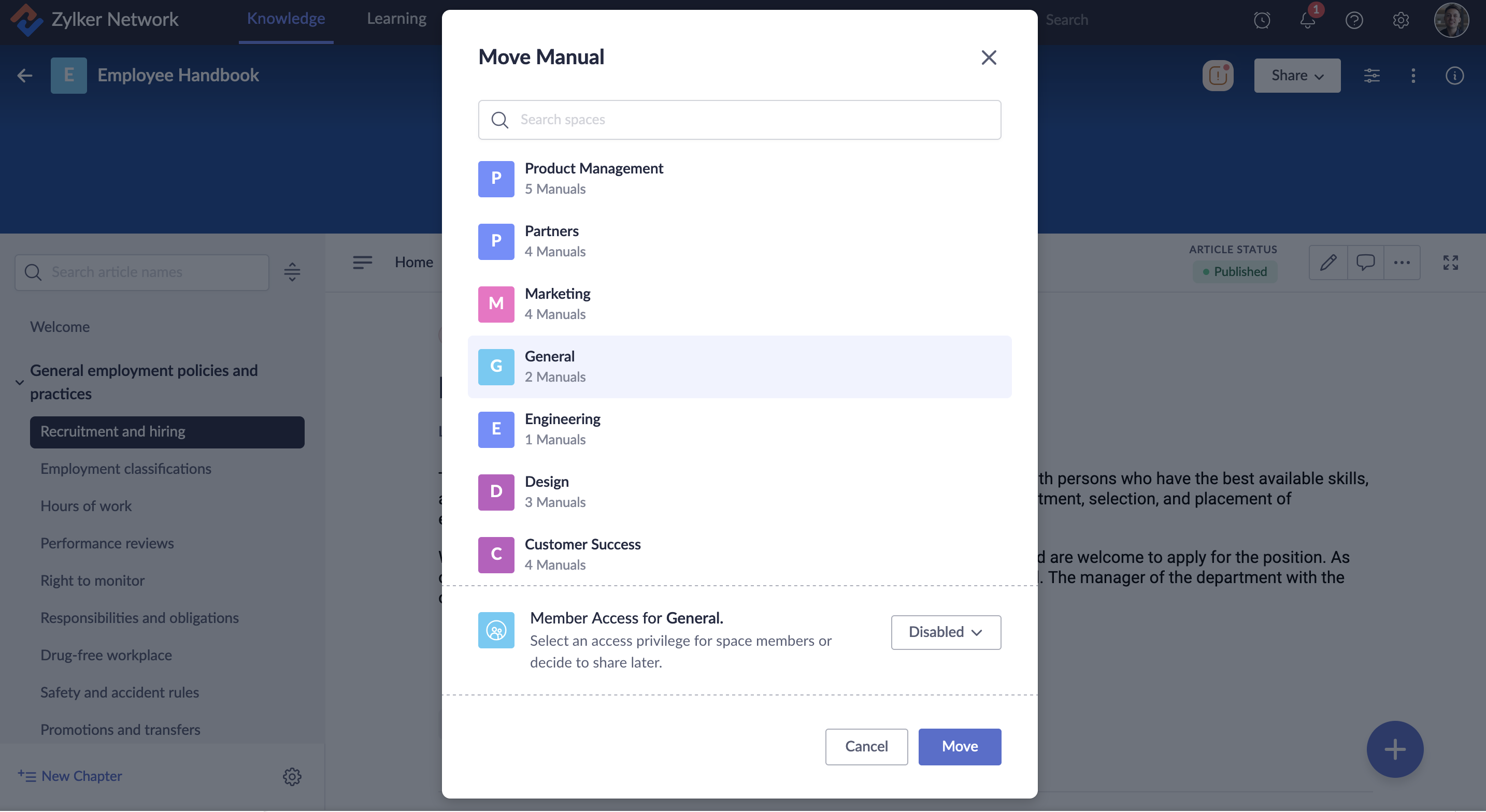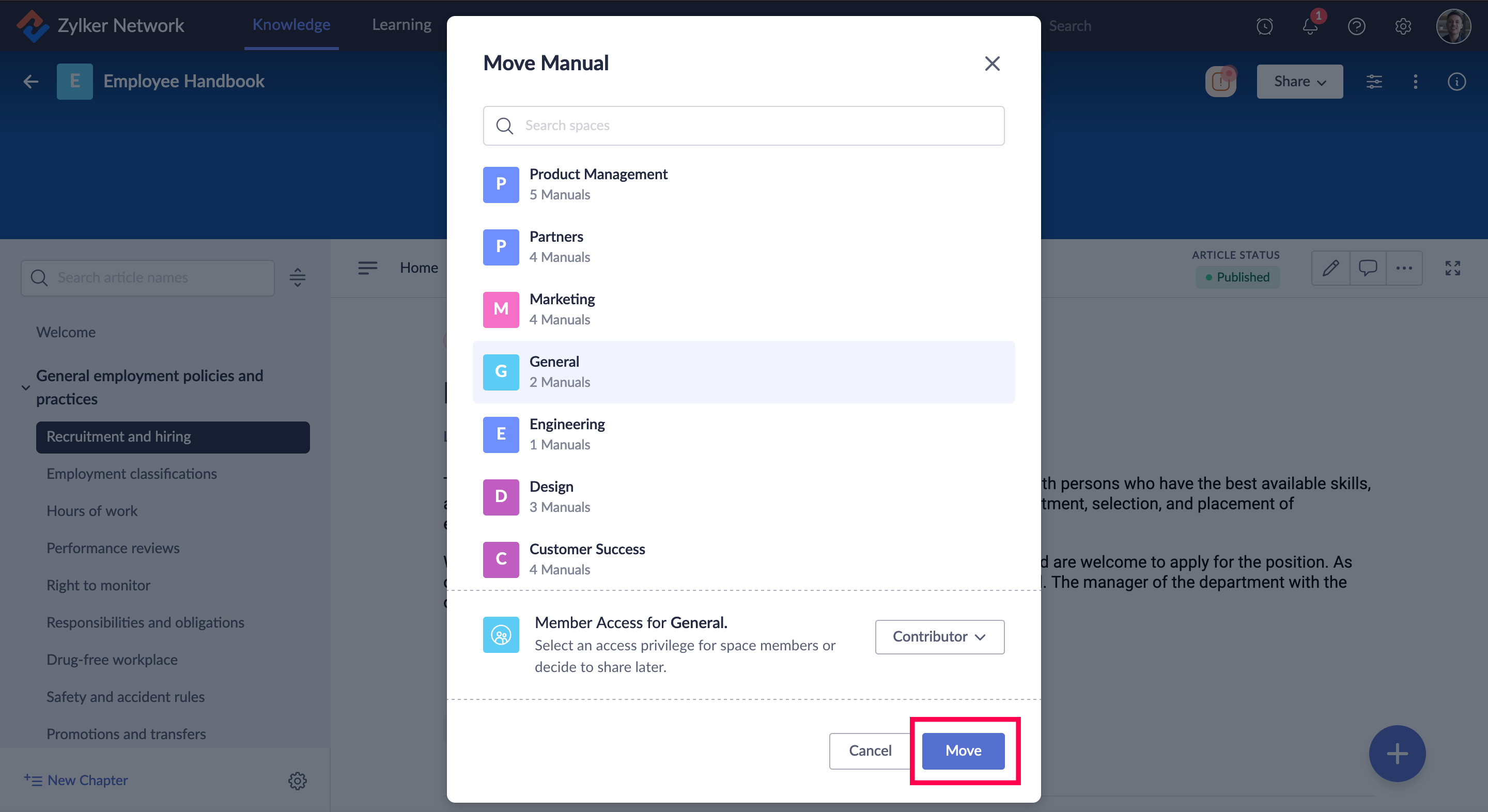 In Zoho Learn, you can move private manuals into a space or space manuals from one space to another. However, you will not be able to convert space manuals into private manuals.