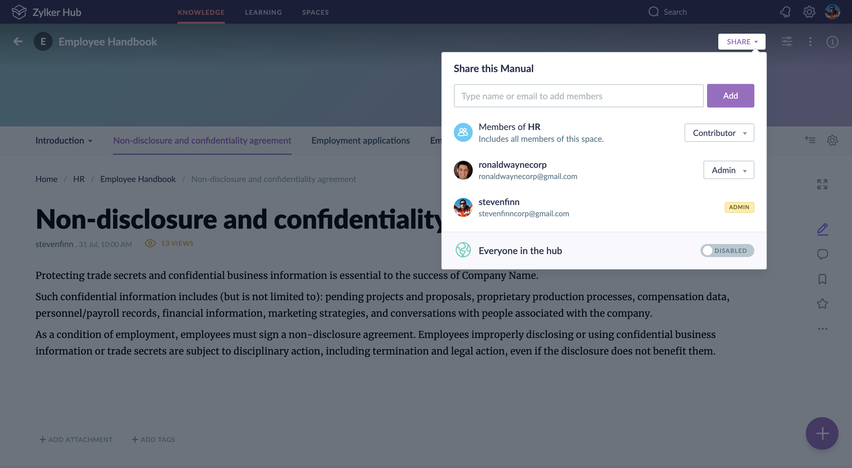 5. To share the manual with specific members, type their names or email addresses in the text box and select them. Select one of the access privileges and click Add.