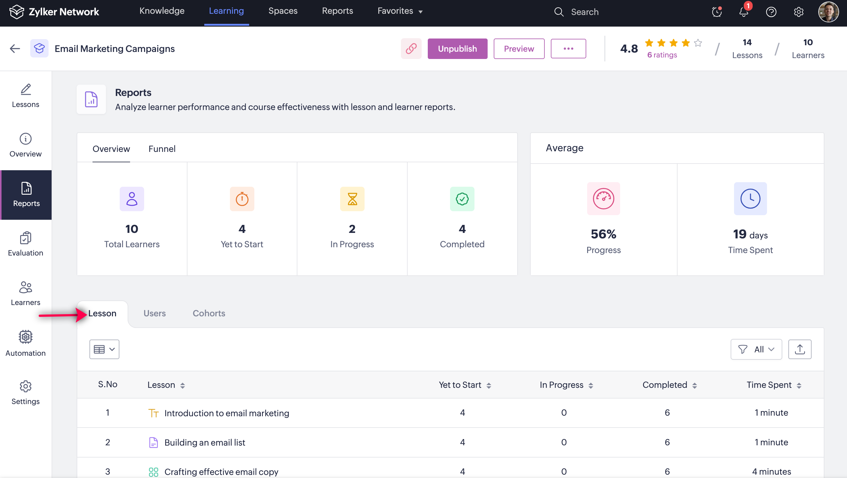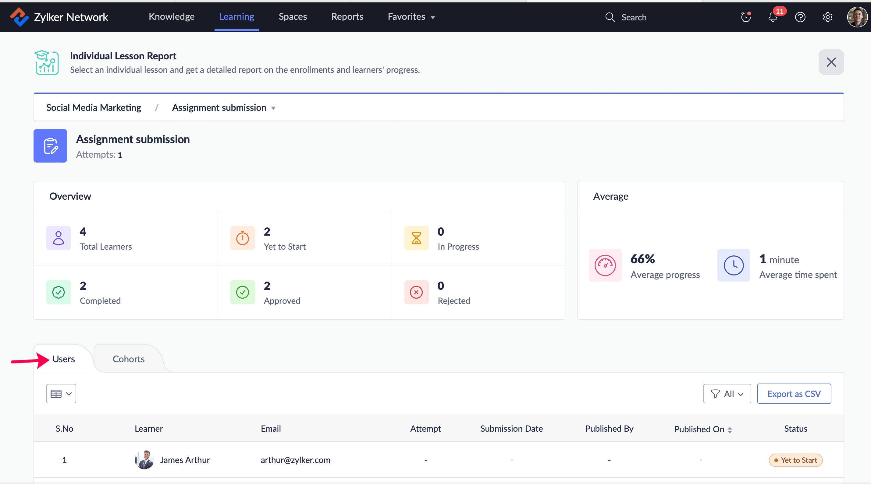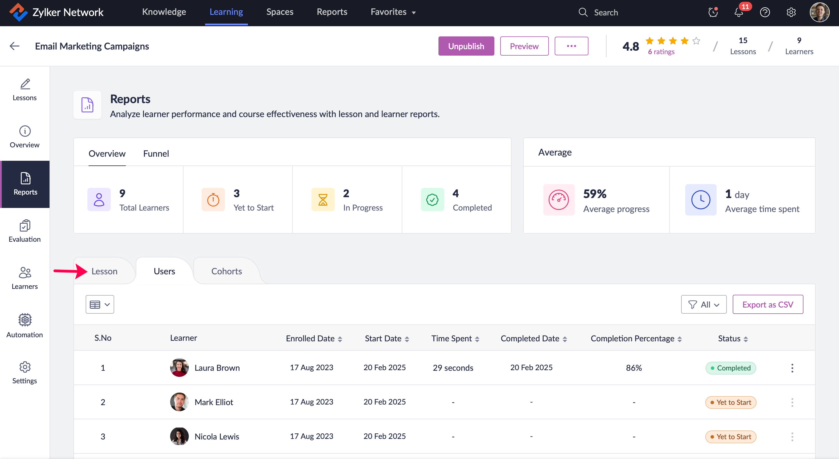 Learn provides all the necessary information to analyze the progress and performance of your learners in a course. The details of the lessons, quizzes, assignments, and learners in your courses are provided on the course reports page.