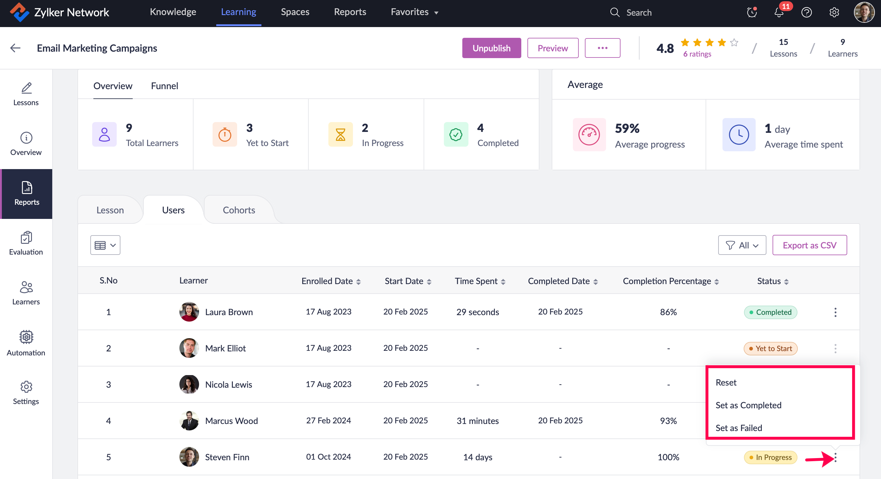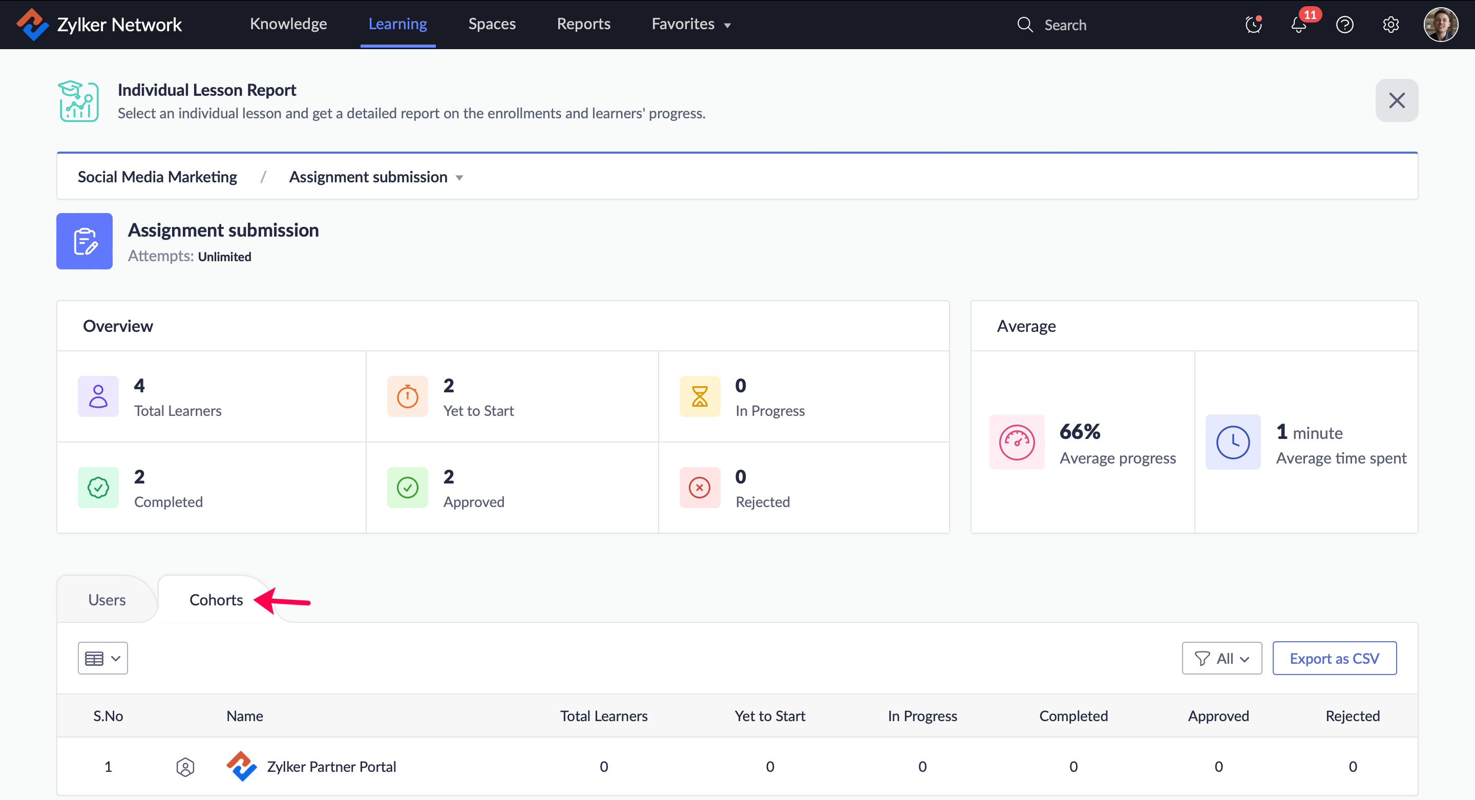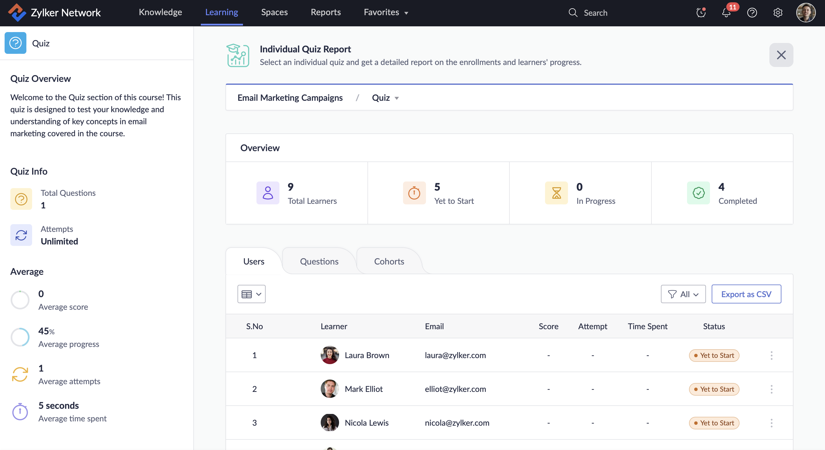 Learn provides all the necessary information to analyze the progress and performance of your learners in a course. The details of the lessons, quizzes, assignments, and learners in your courses are provided on the course reports page.